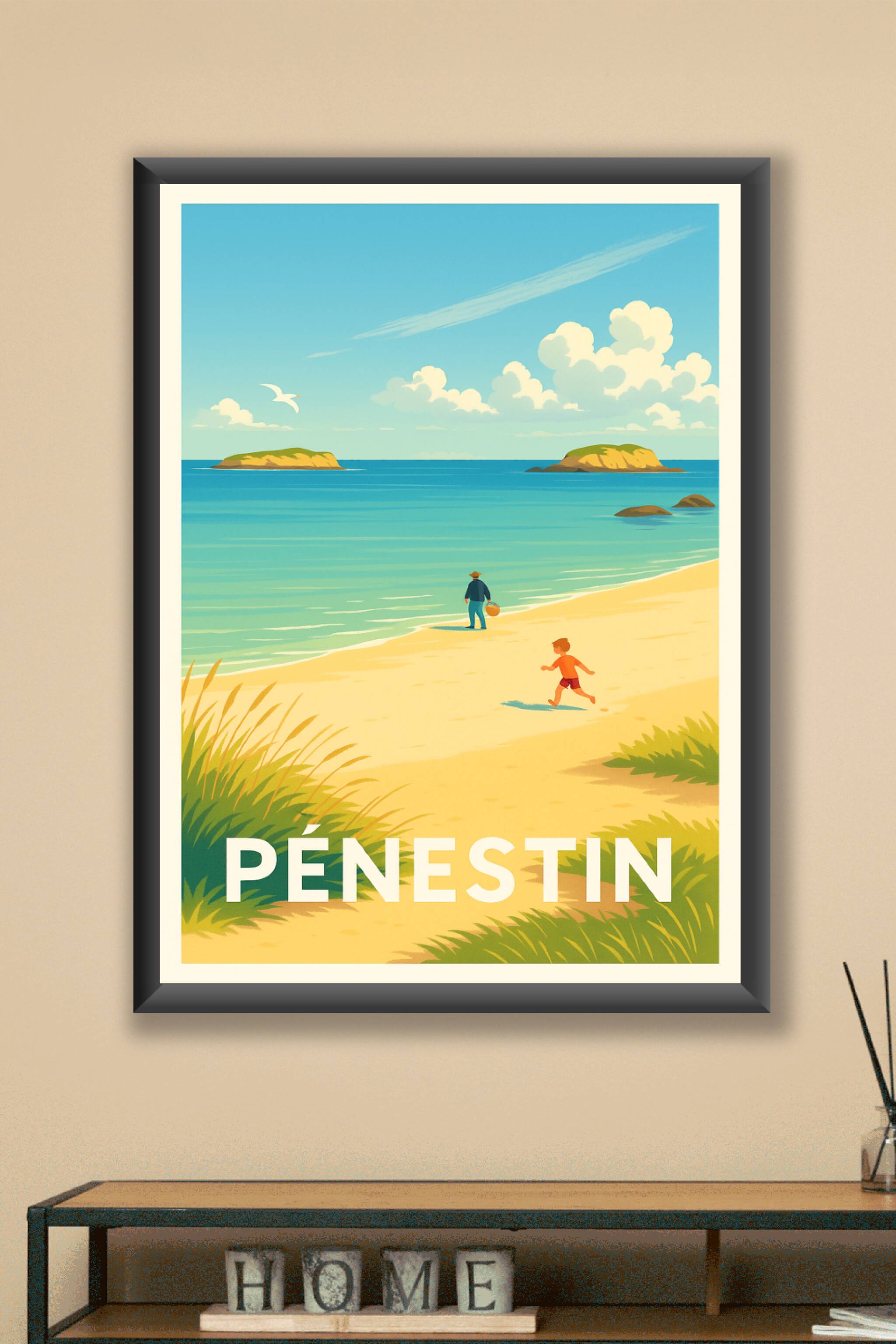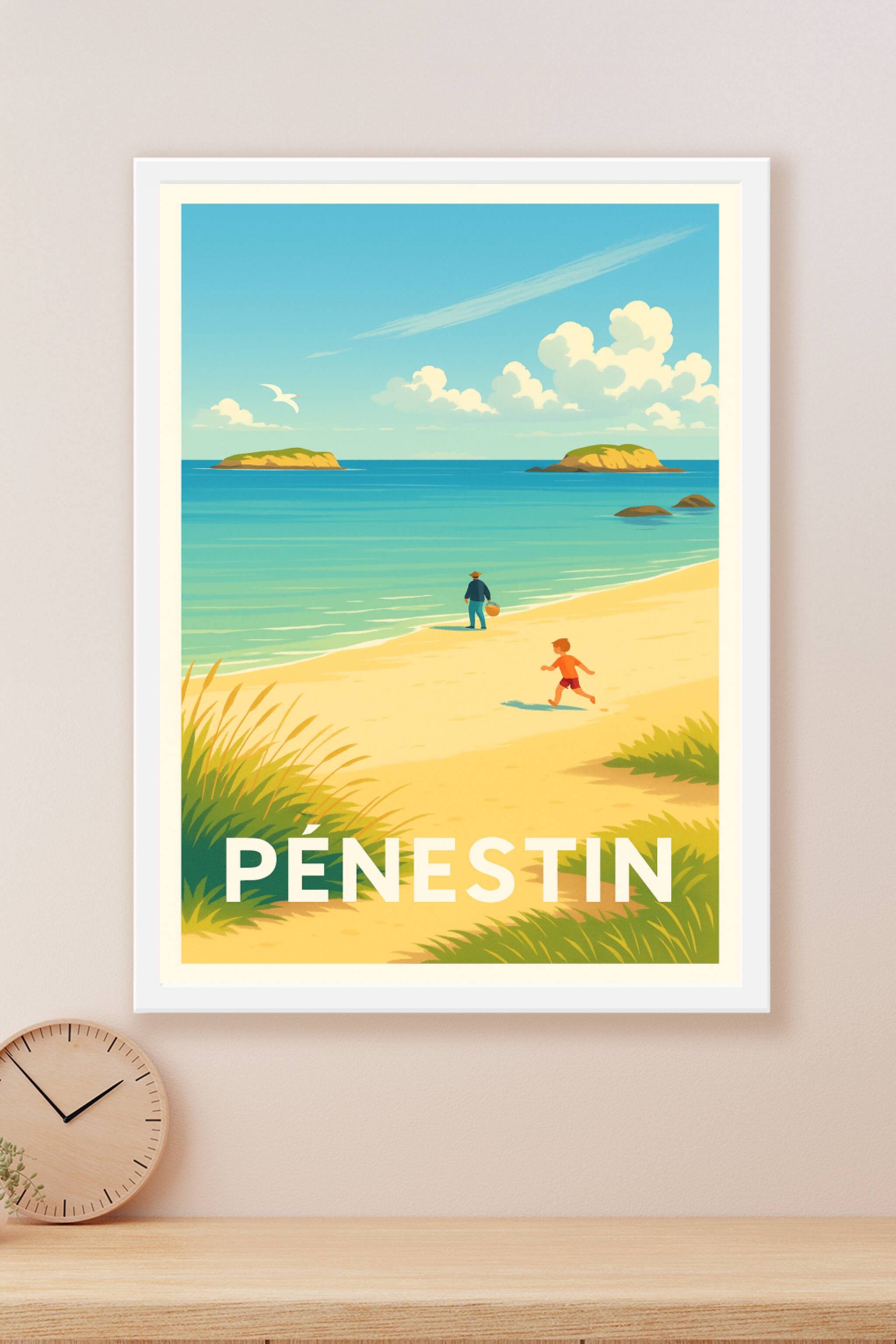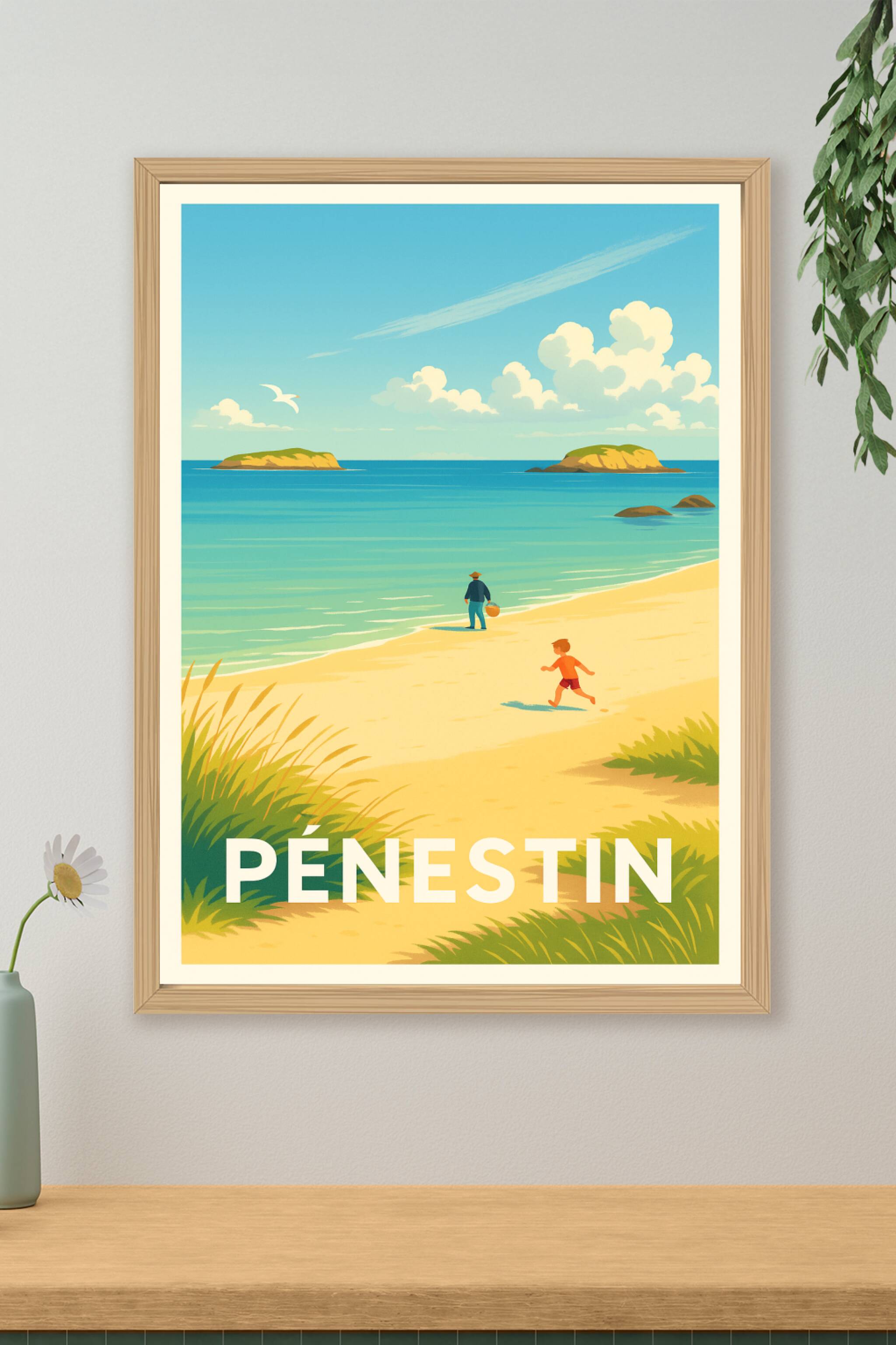 Découvrez la sérénité de la côte bretonne avec cette affiche illustrée qui capture l'ambiance paisible et ensoleillée d'une plage de Pénestin. Entr...