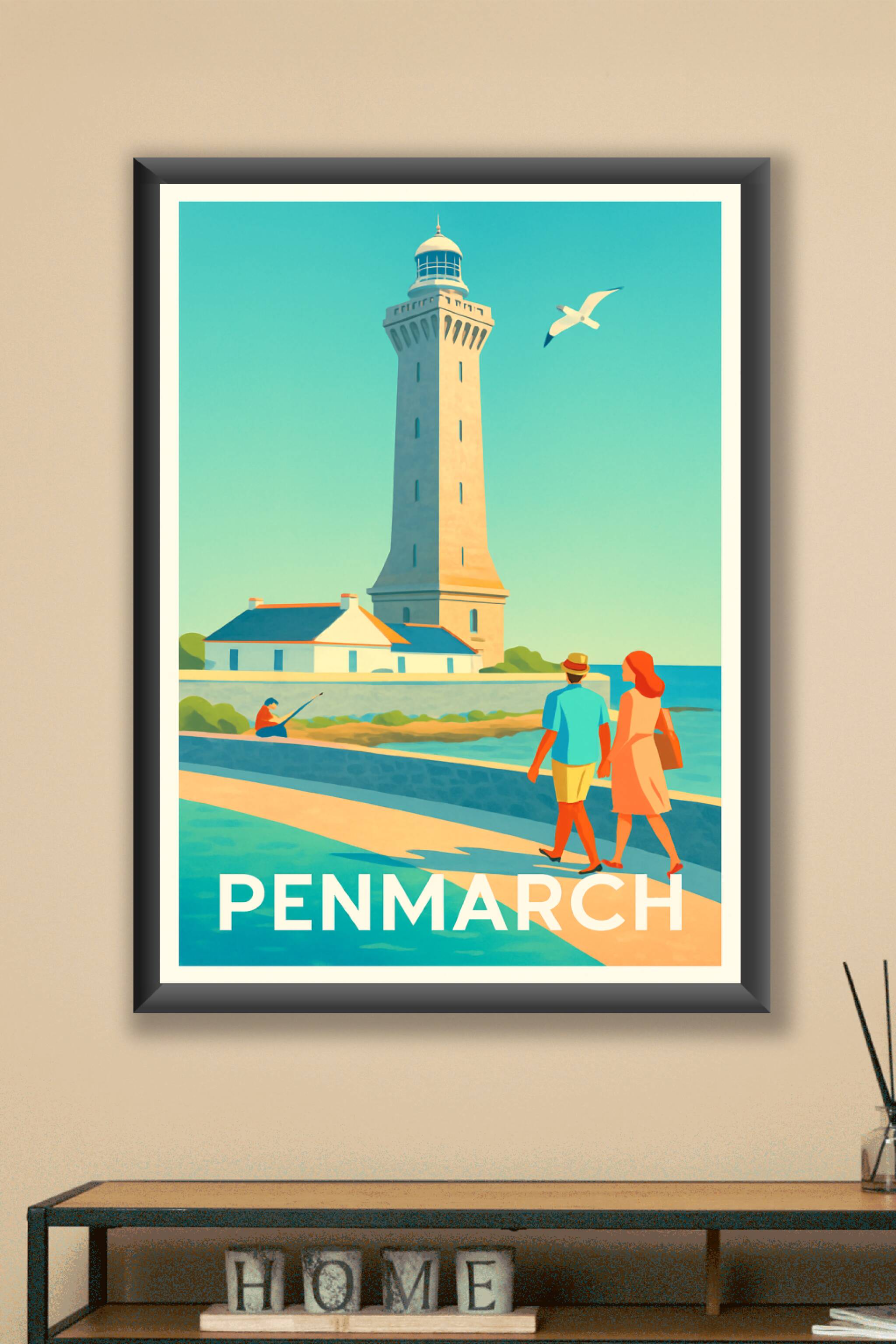 Découvrez l'atmosphère paisible et lumineuse de Penmarch avec cette affiche représentant son célèbre phare en bord de mer, où un couple flâne sous ...