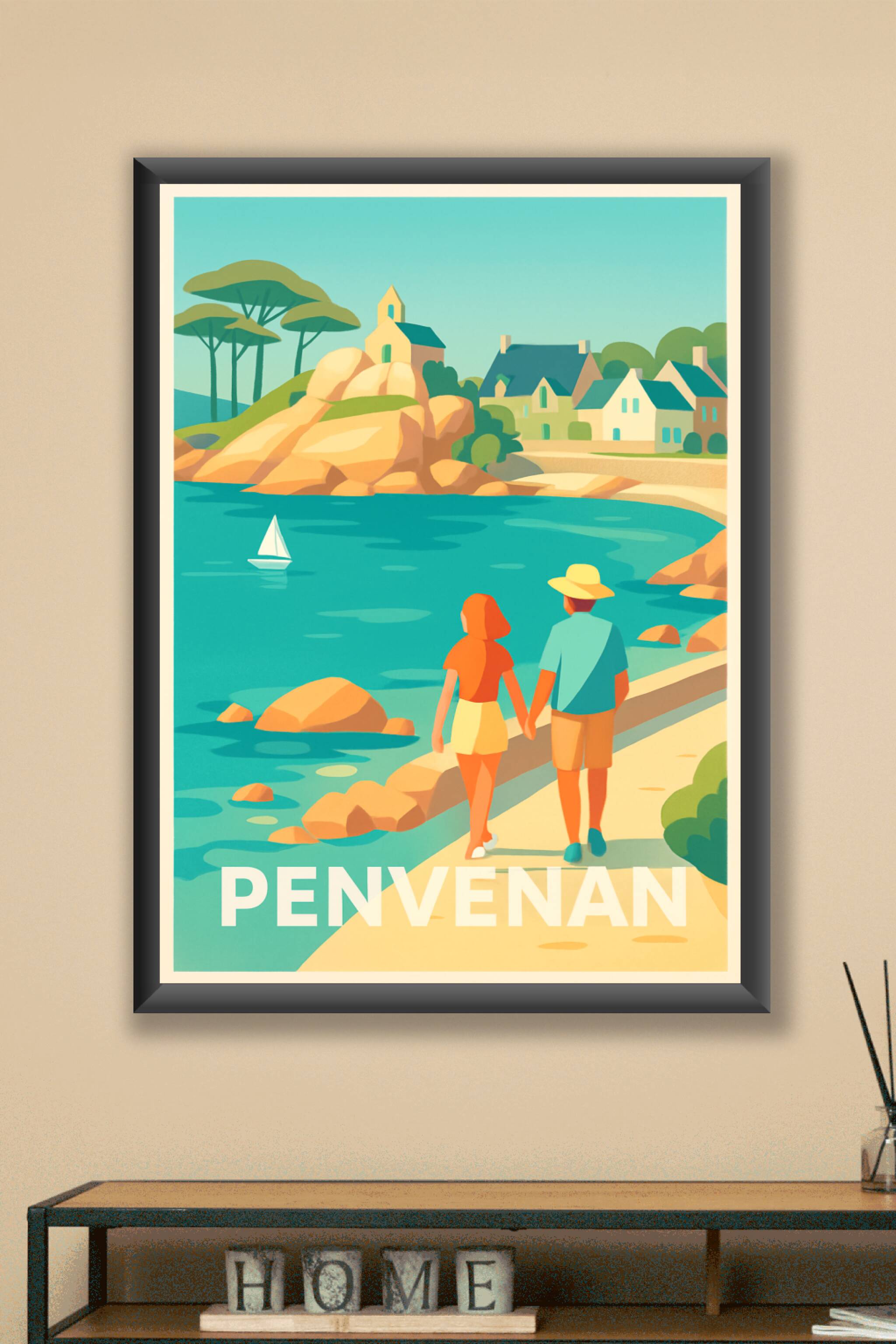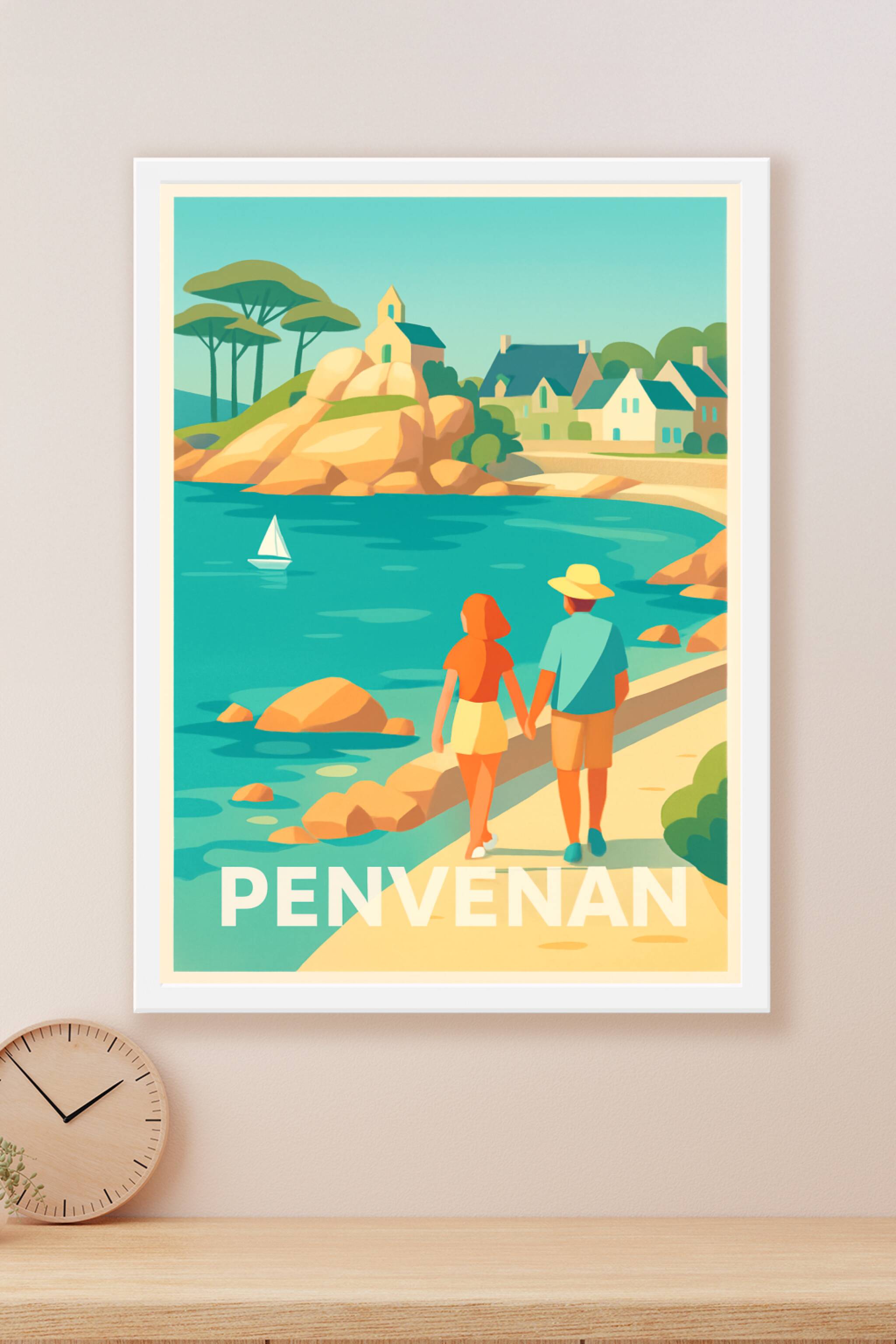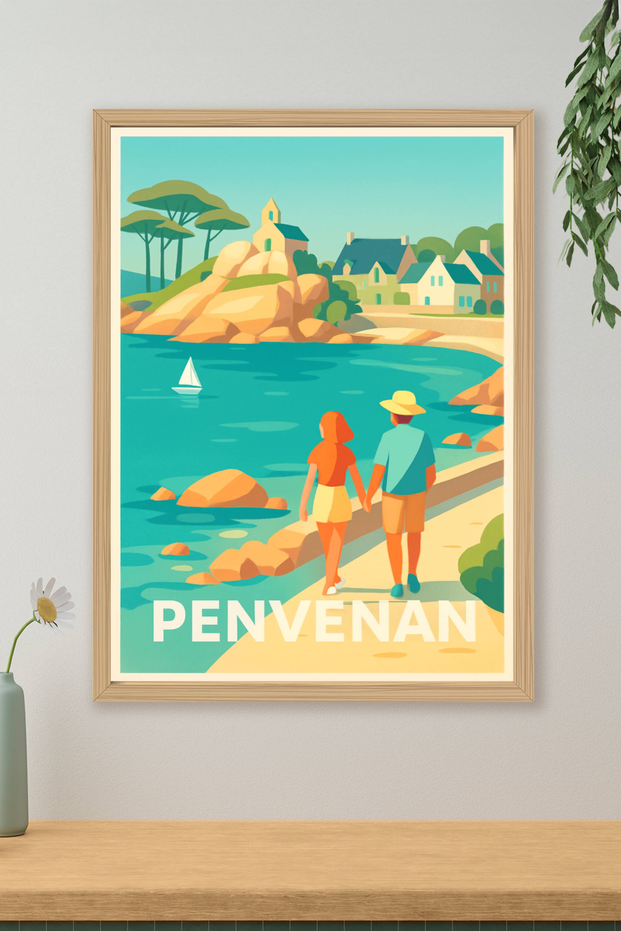 Découvrez la douceur de vivre de Penvenan avec cette affiche illustrée mettant en scène un couple se promenant le long de la côte, entre eaux turqu...