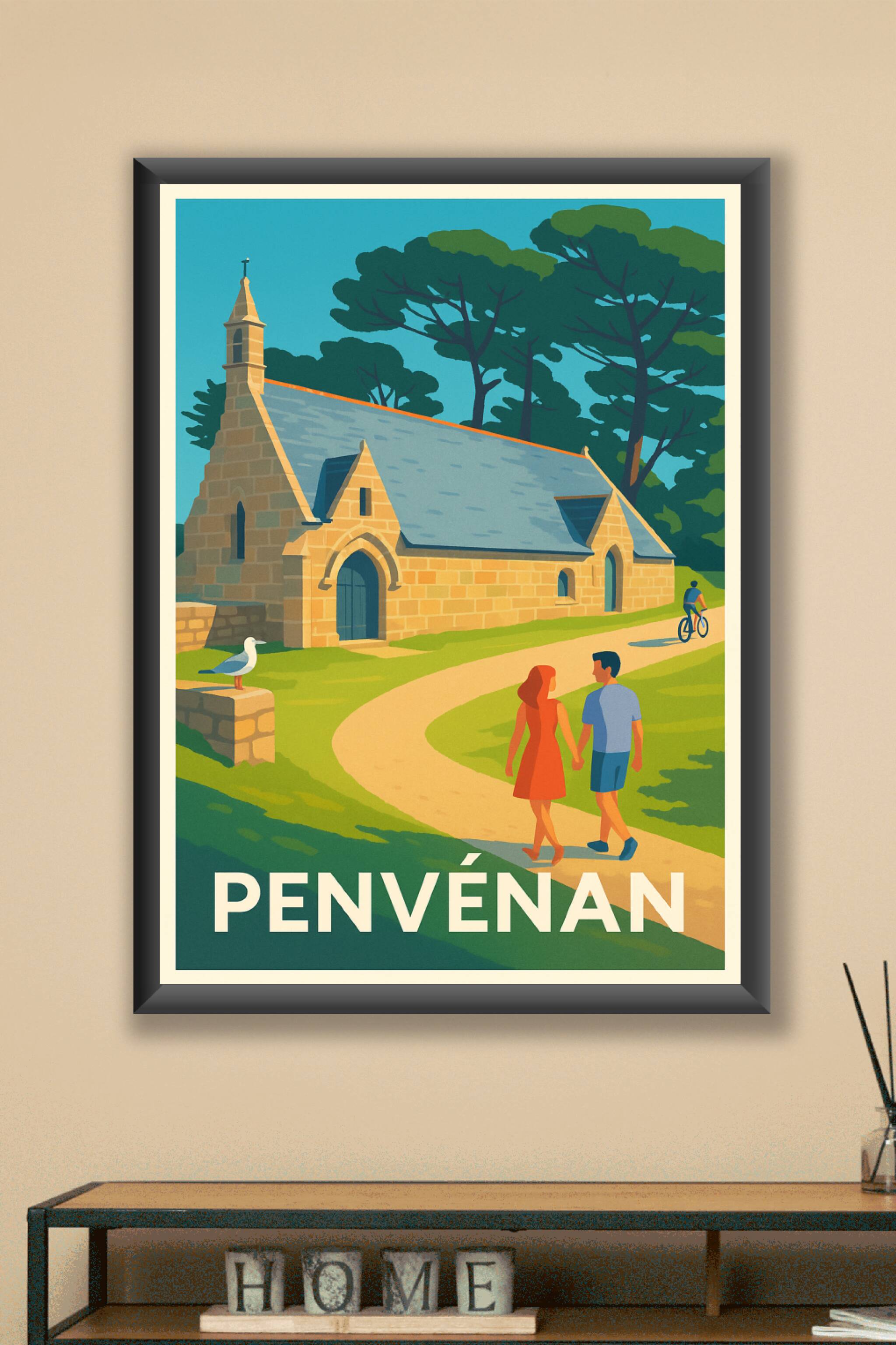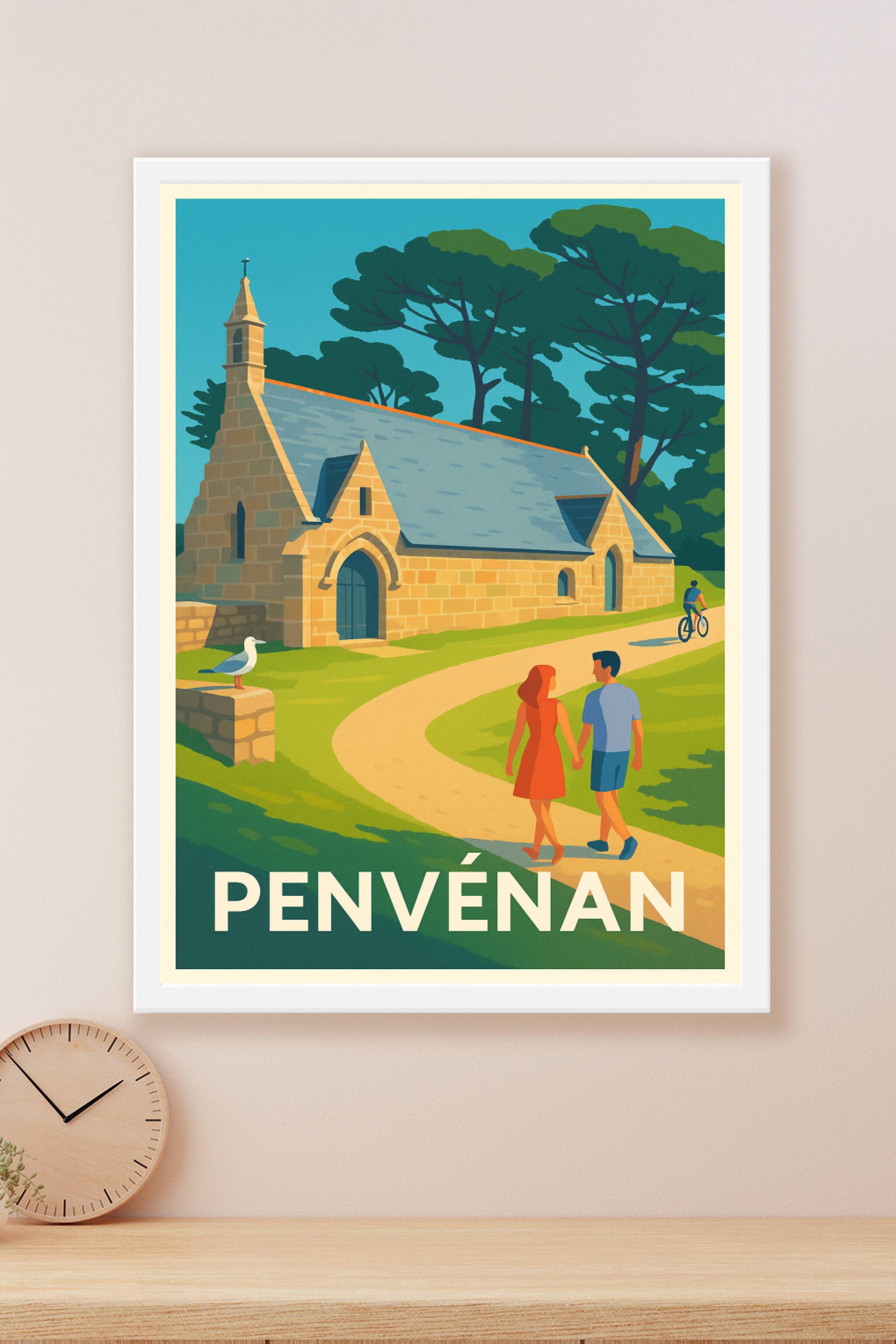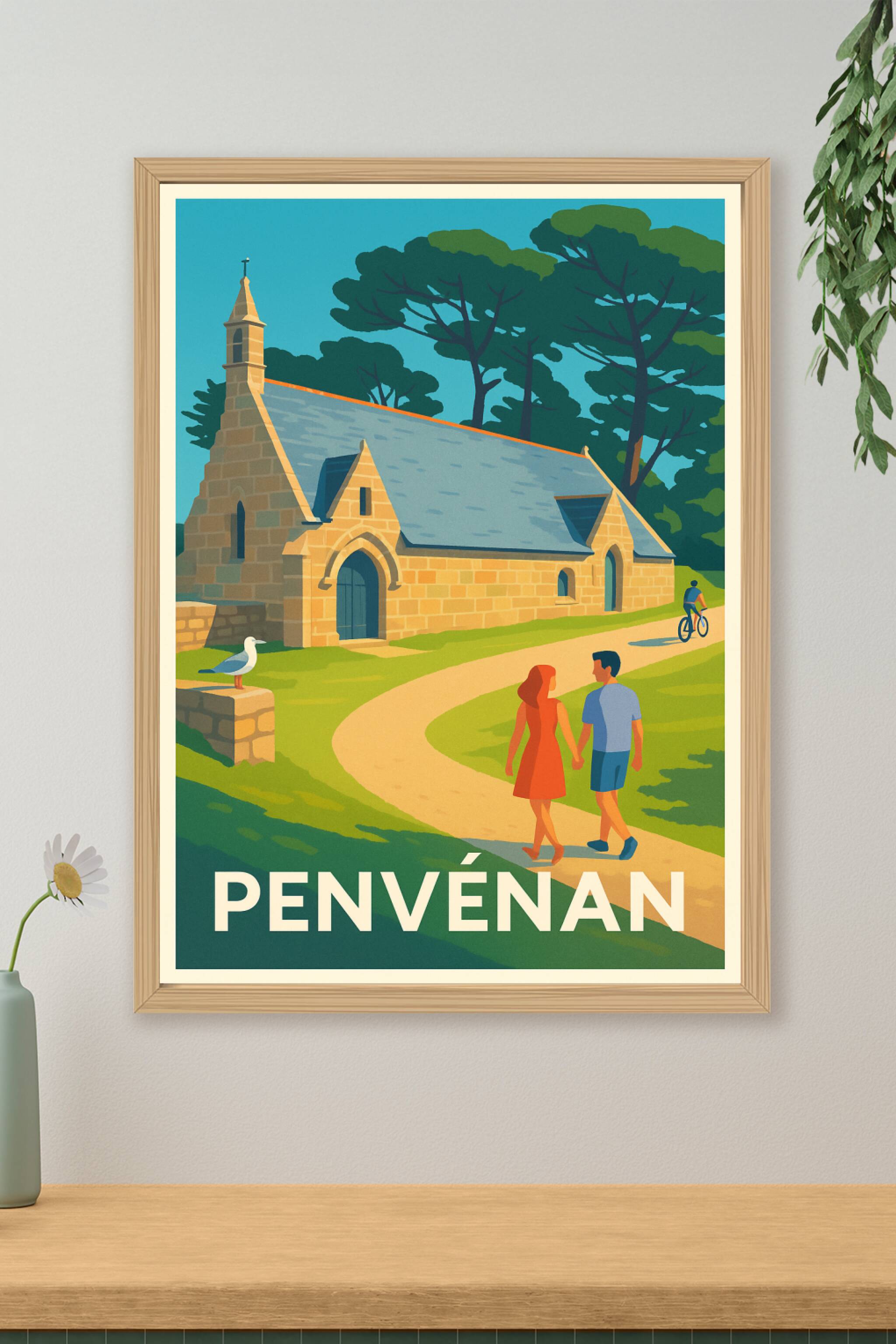Découvrez l'atmosphère paisible de Penvénan à travers cette affiche au style vintage qui met en lumière une chapelle typique et son cadre naturel e...