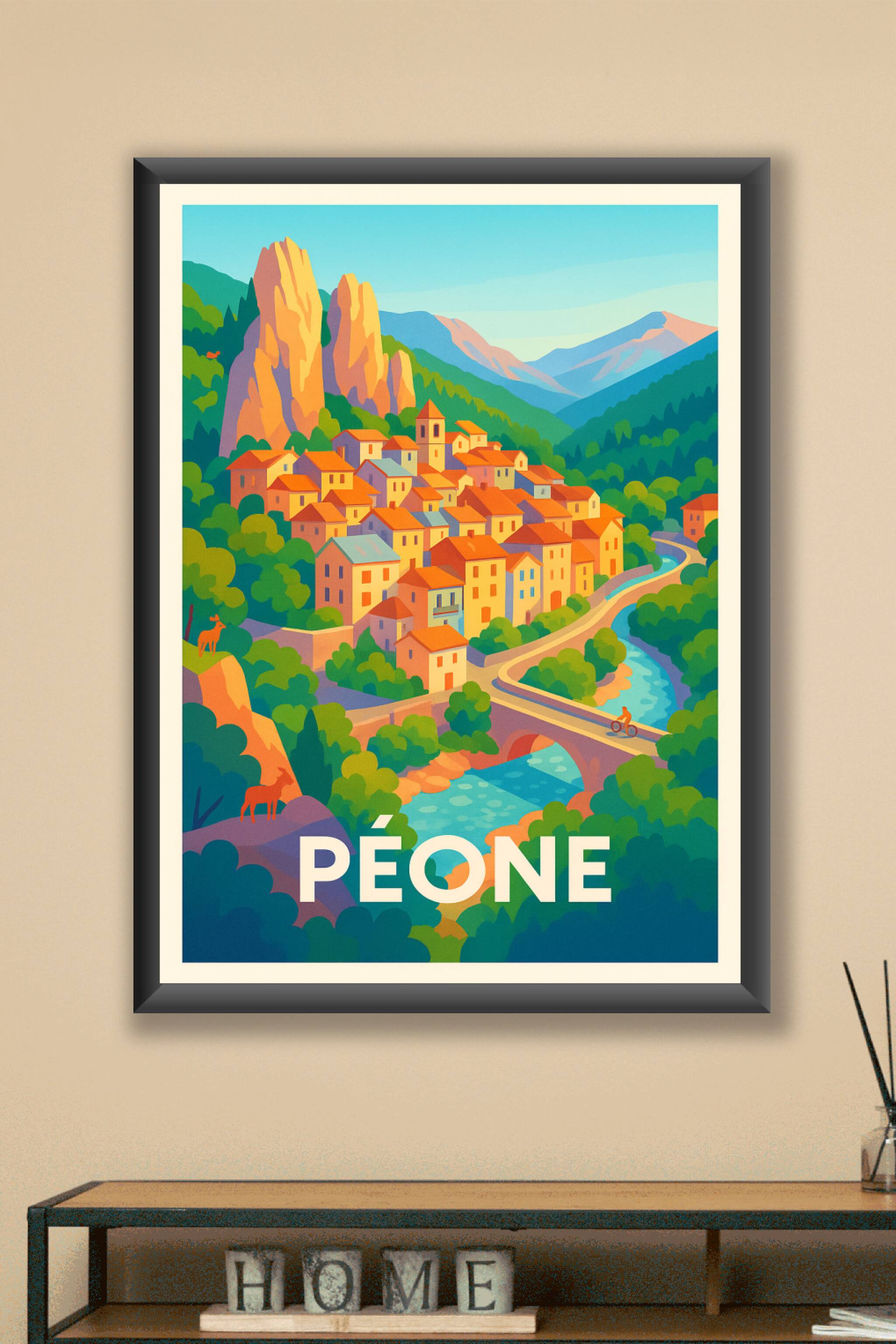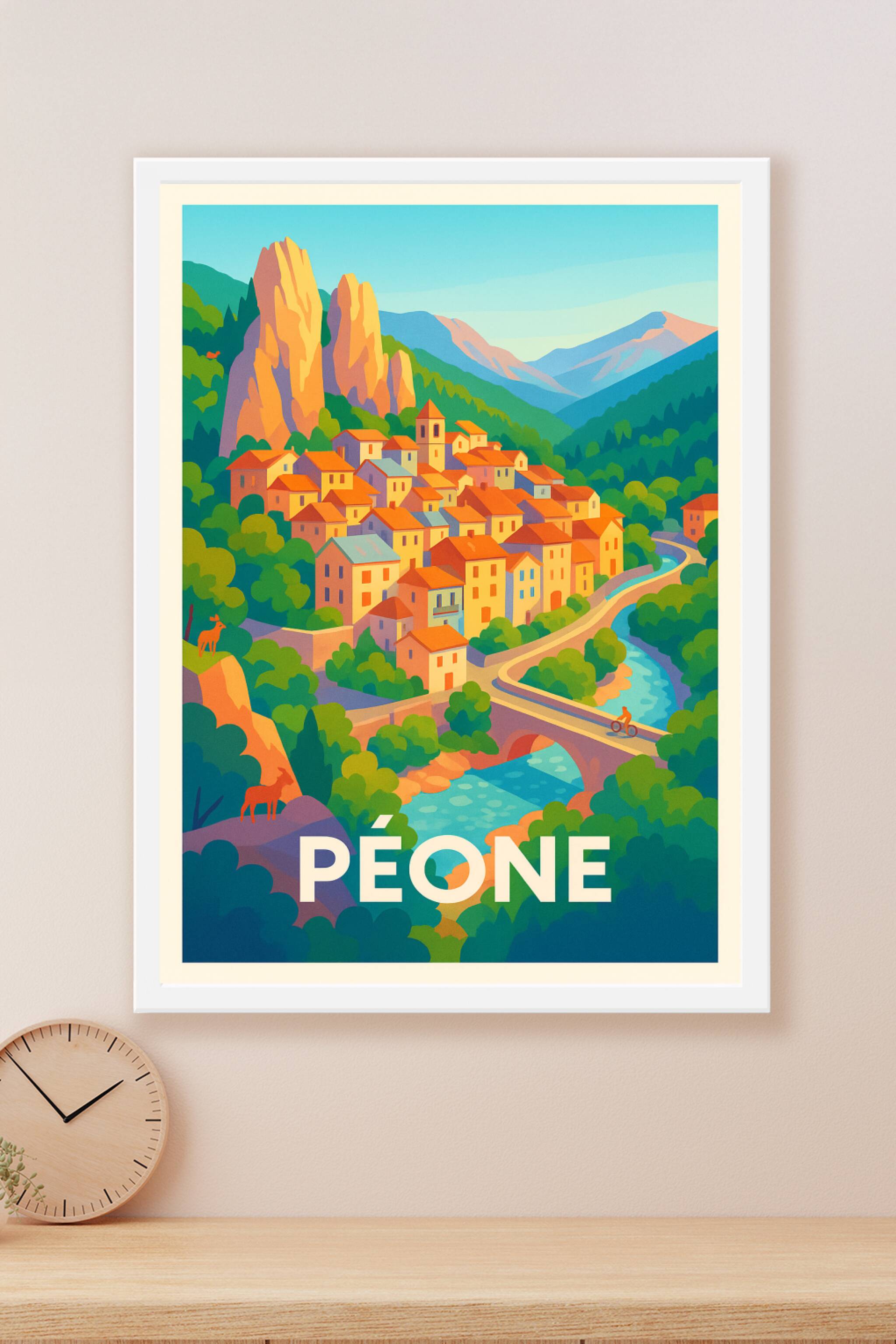 Découvrez la beauté pittoresque de Péone avec cette affiche illustrée aux couleurs vibrantes et à l'ambiance chaleureuse. Le village se niche harmo...