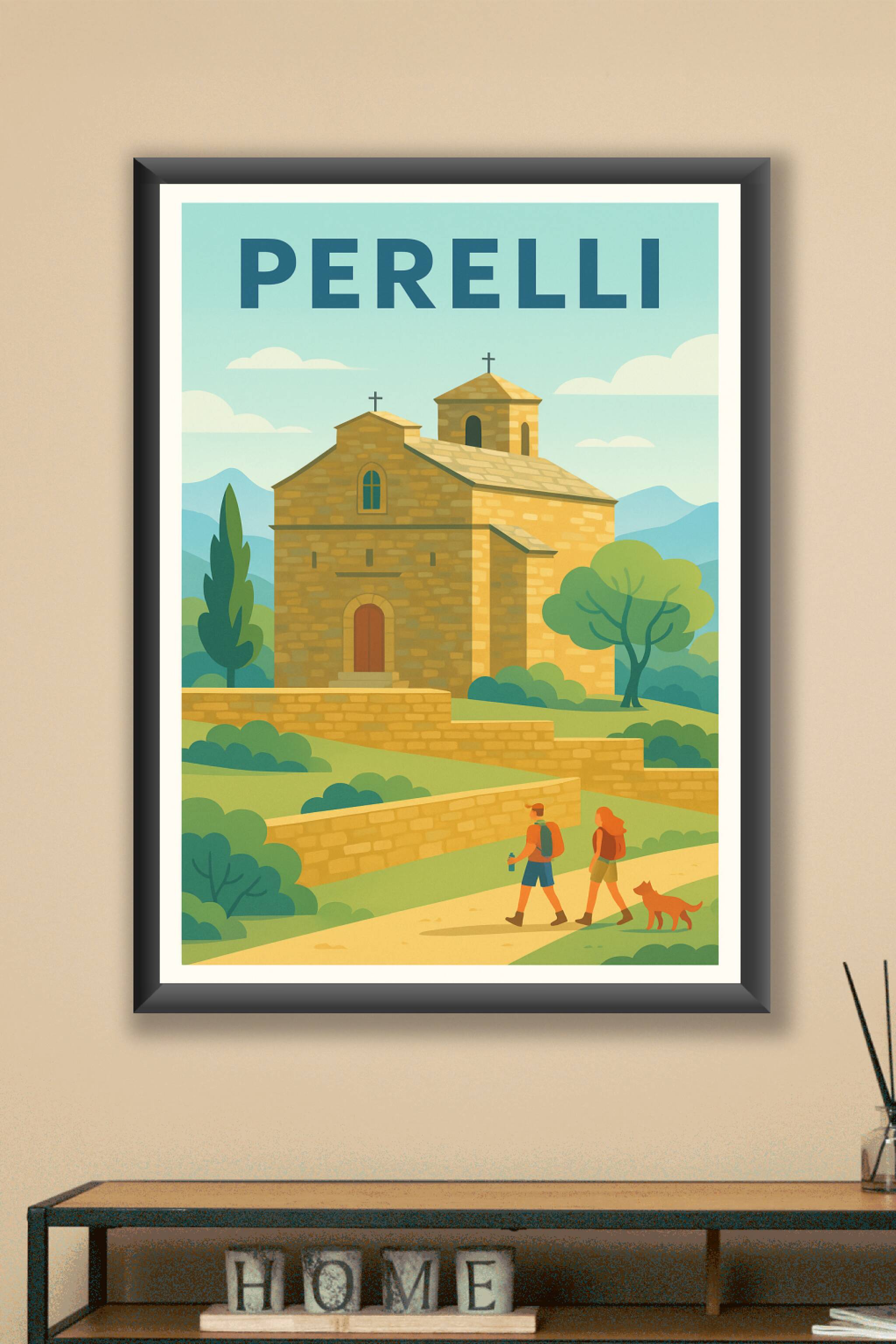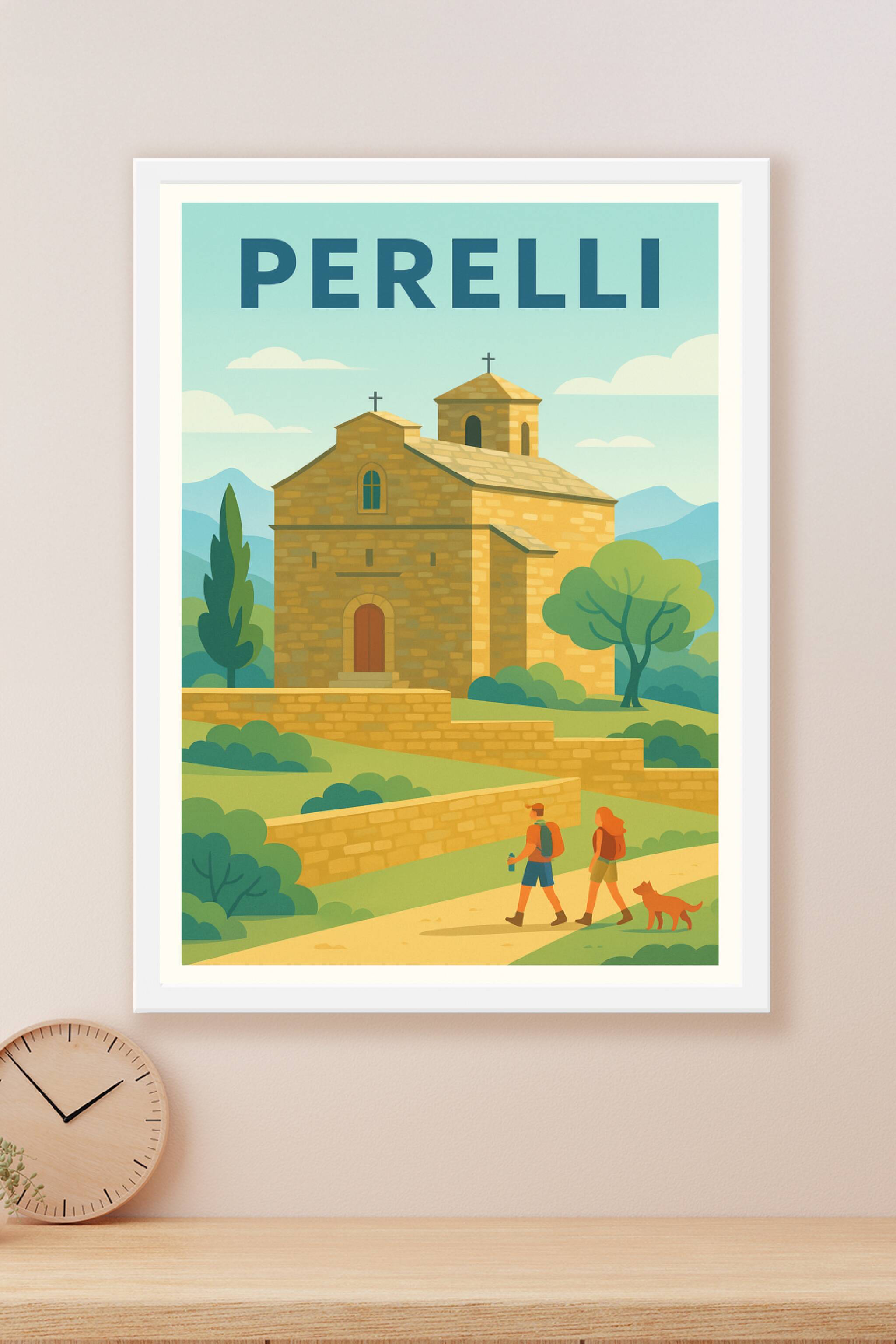 Découvrez l'élégance rustique de Perelli avec cette affiche illustrée mettant en valeur une bâtisse en pierre typique entourée de paysages verdoyan...