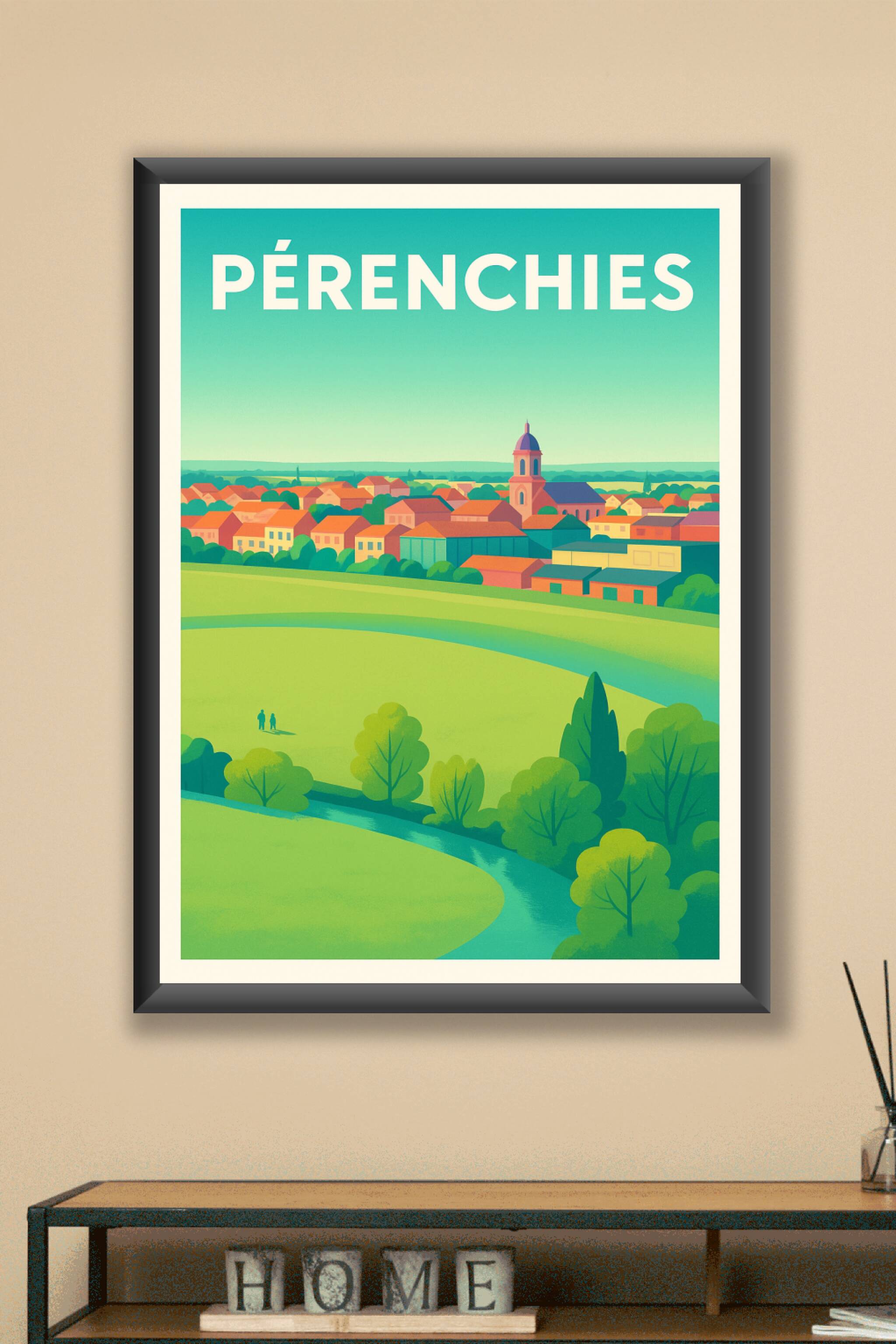 Découvrez la sérénité et la beauté champêtre de Pérenchies à travers cette affiche illustrée aux couleurs douces et apaisantes. Ce poster met en va...