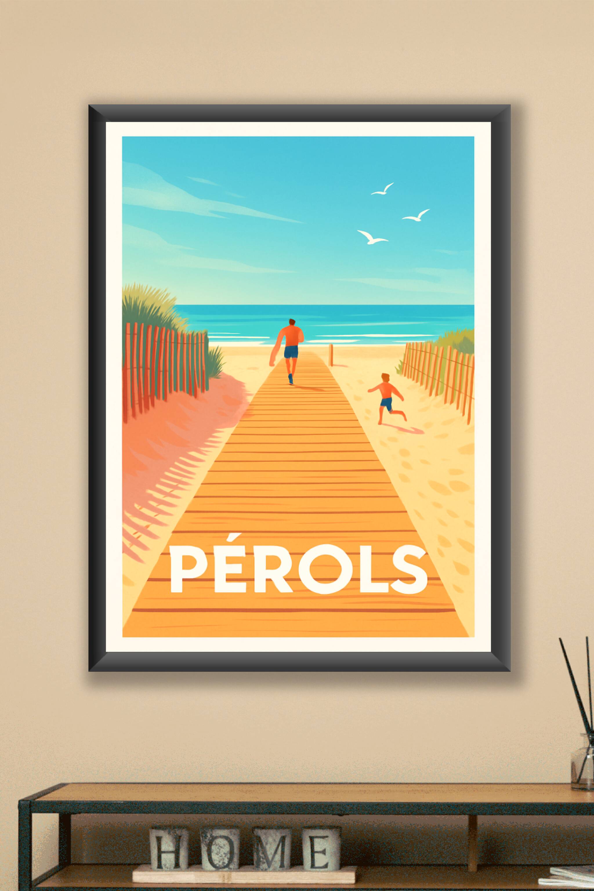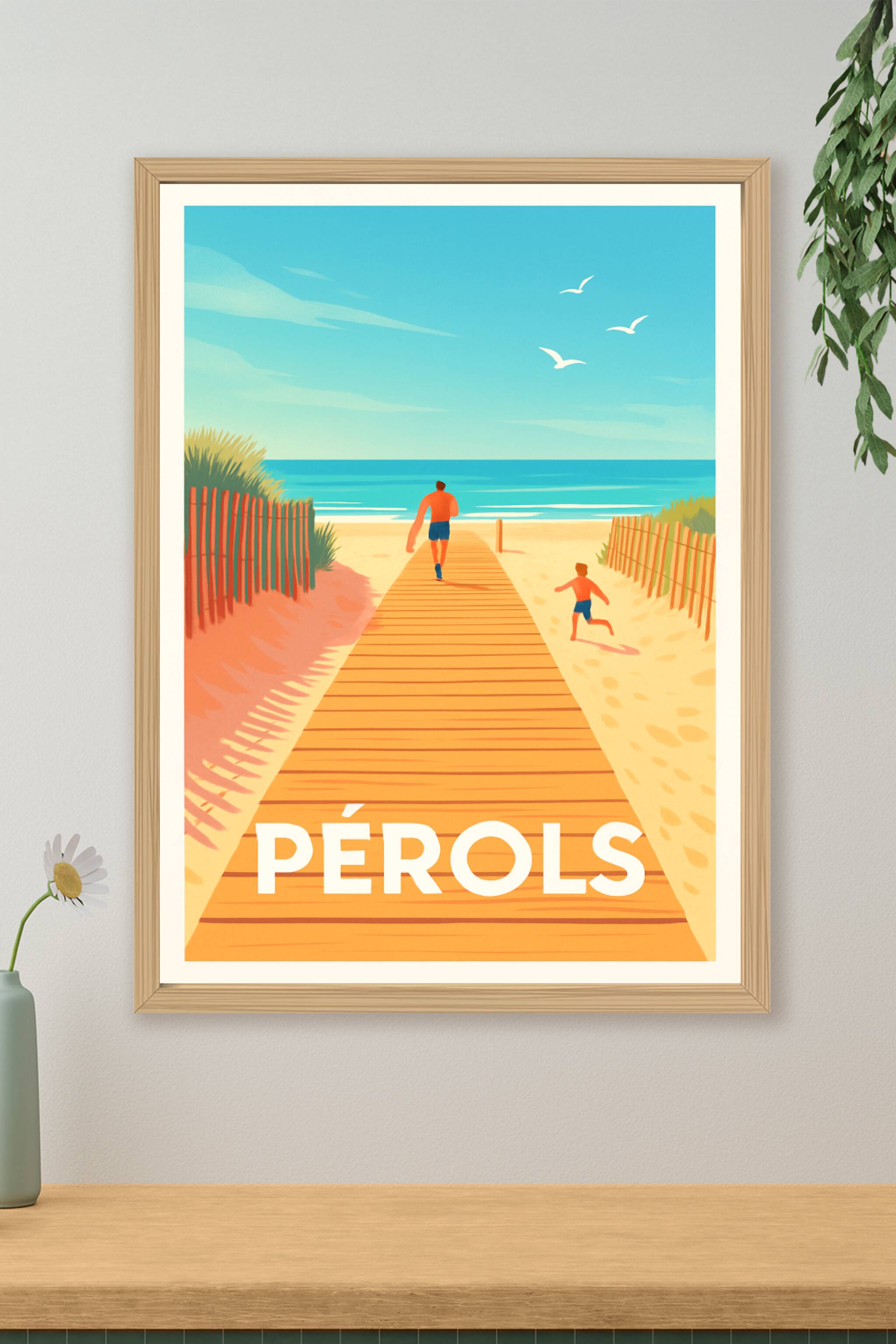 Découvrez l'esprit estival et apaisant de Pérols avec cette affiche illustrée qui met en scène un chemin de bois menant à la plage, bordée de dunes...
