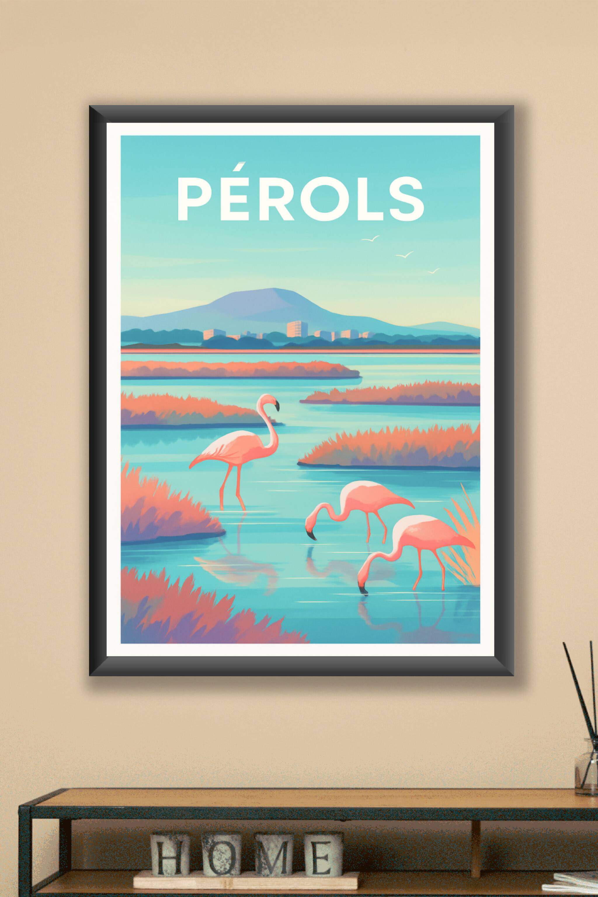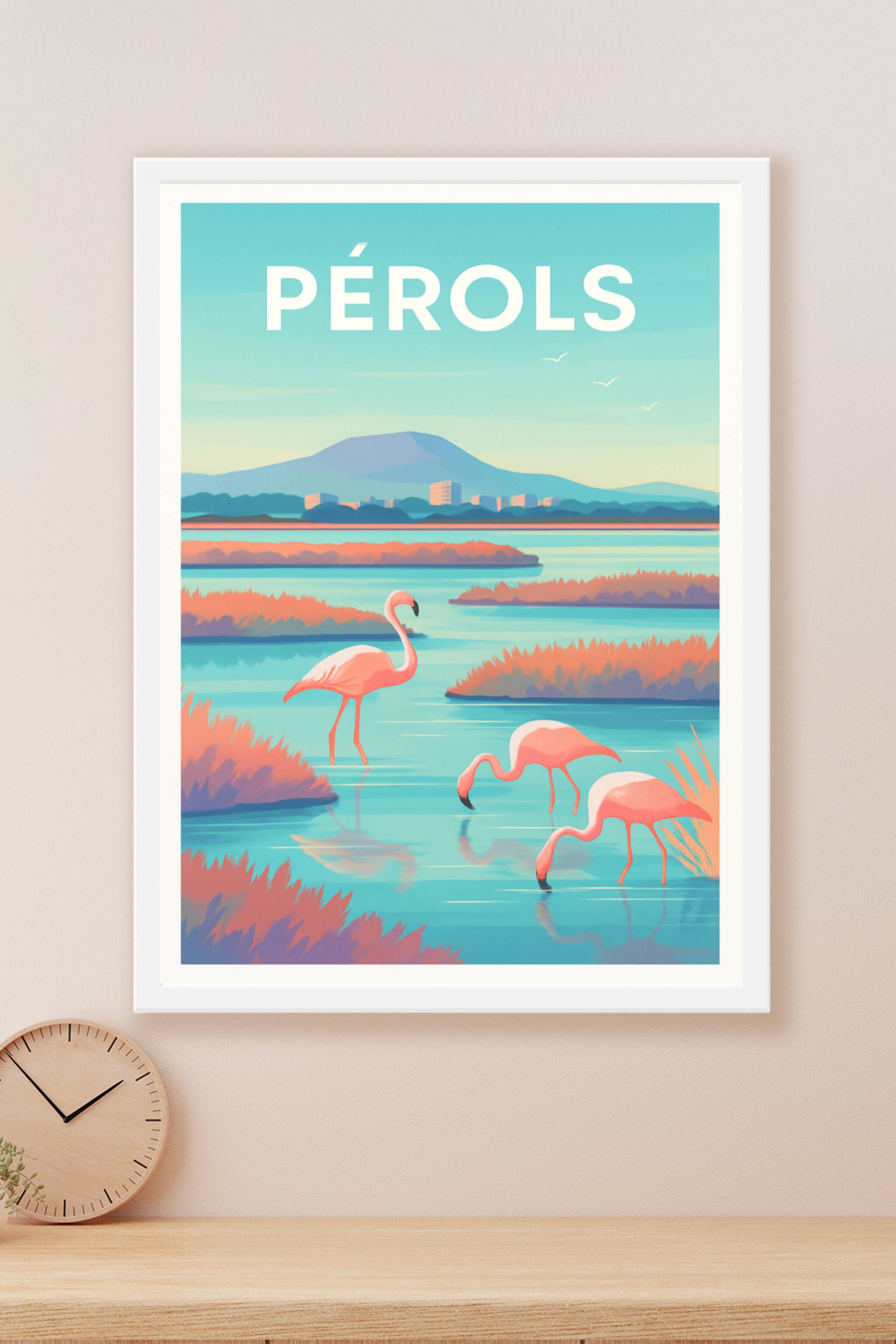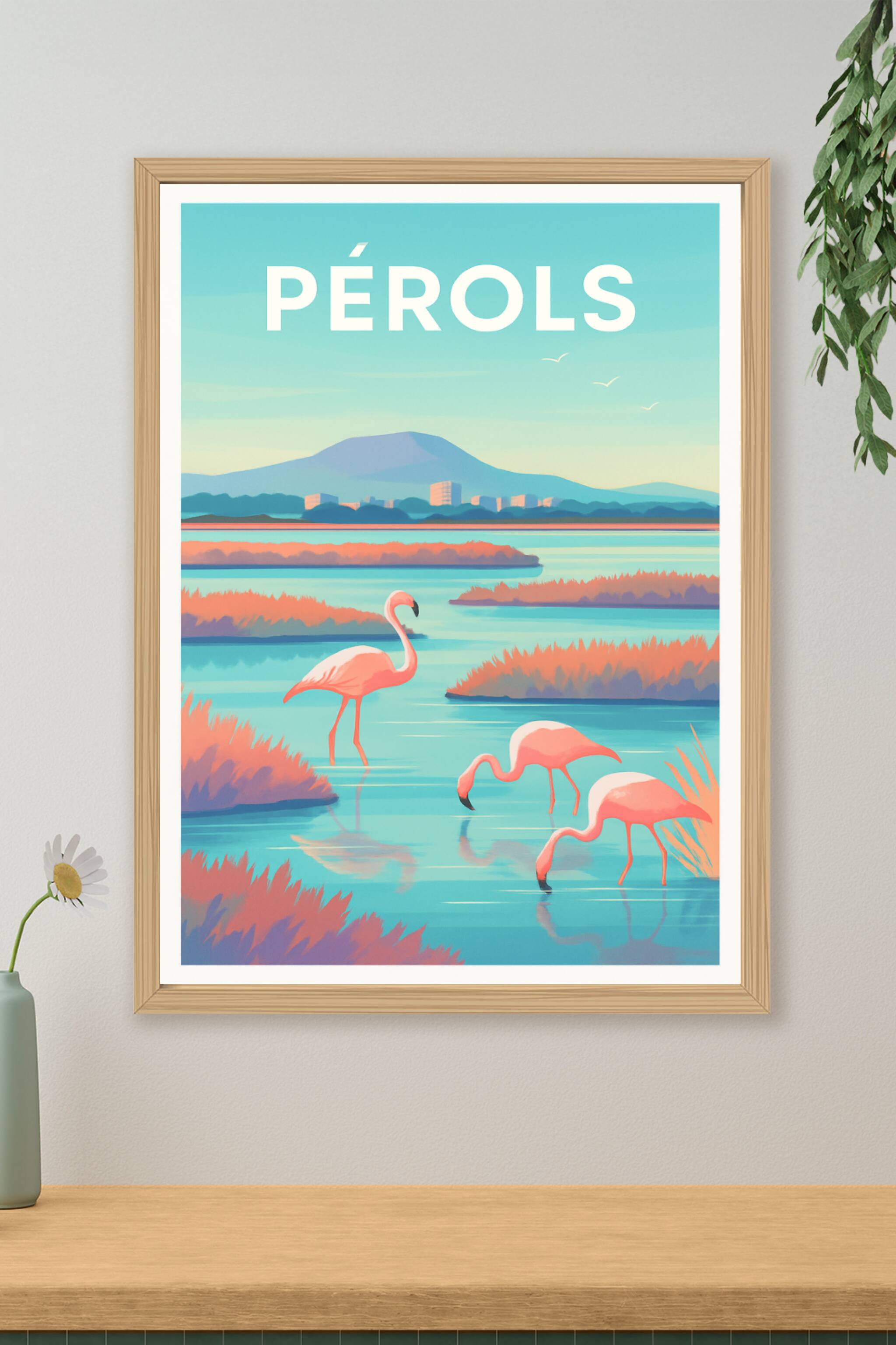 Découvrez l'élégance tranquille des flamants roses dans les lagunes de Pérols avec cette affiche au charme pastel et apaisant. Ce poster met en val...