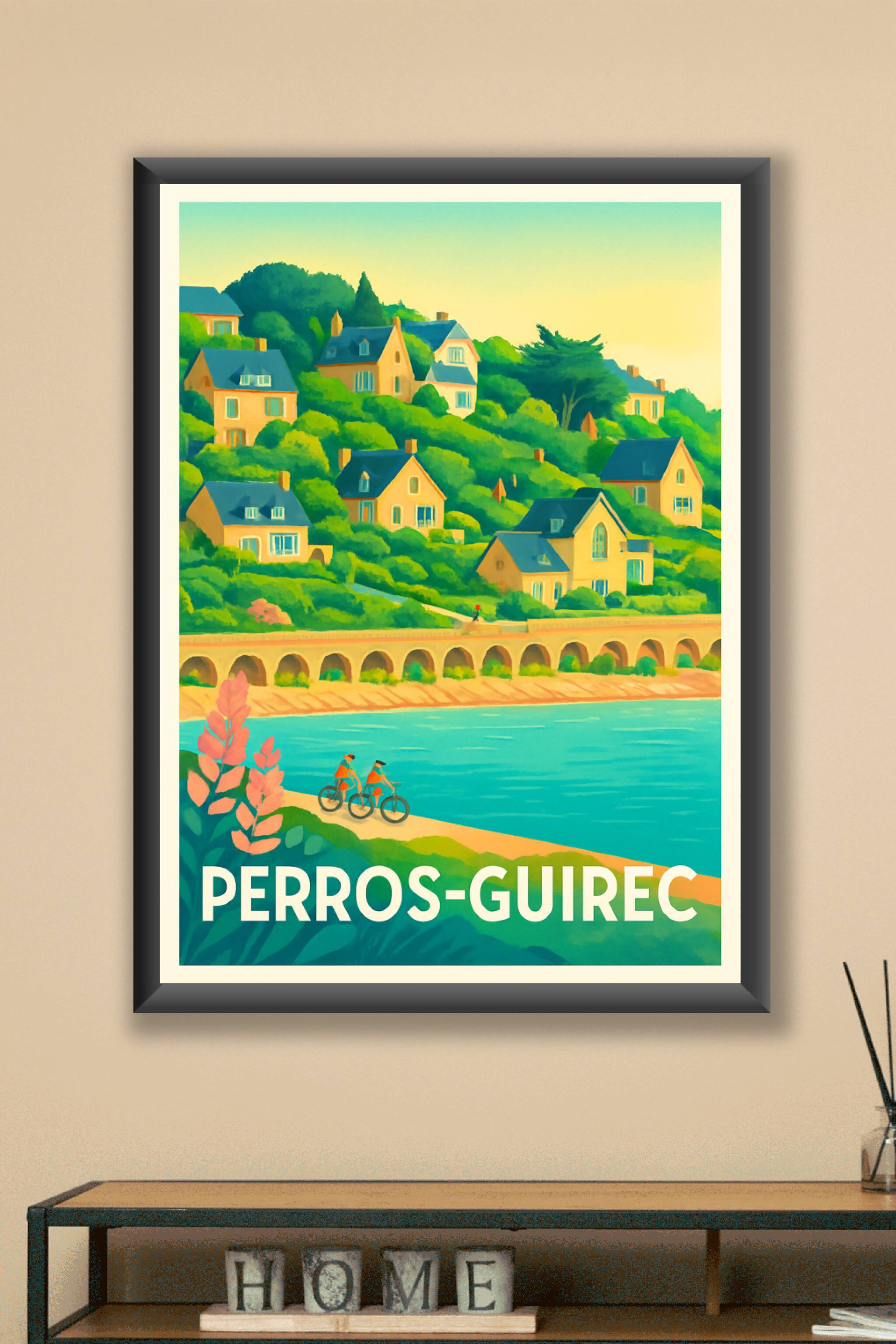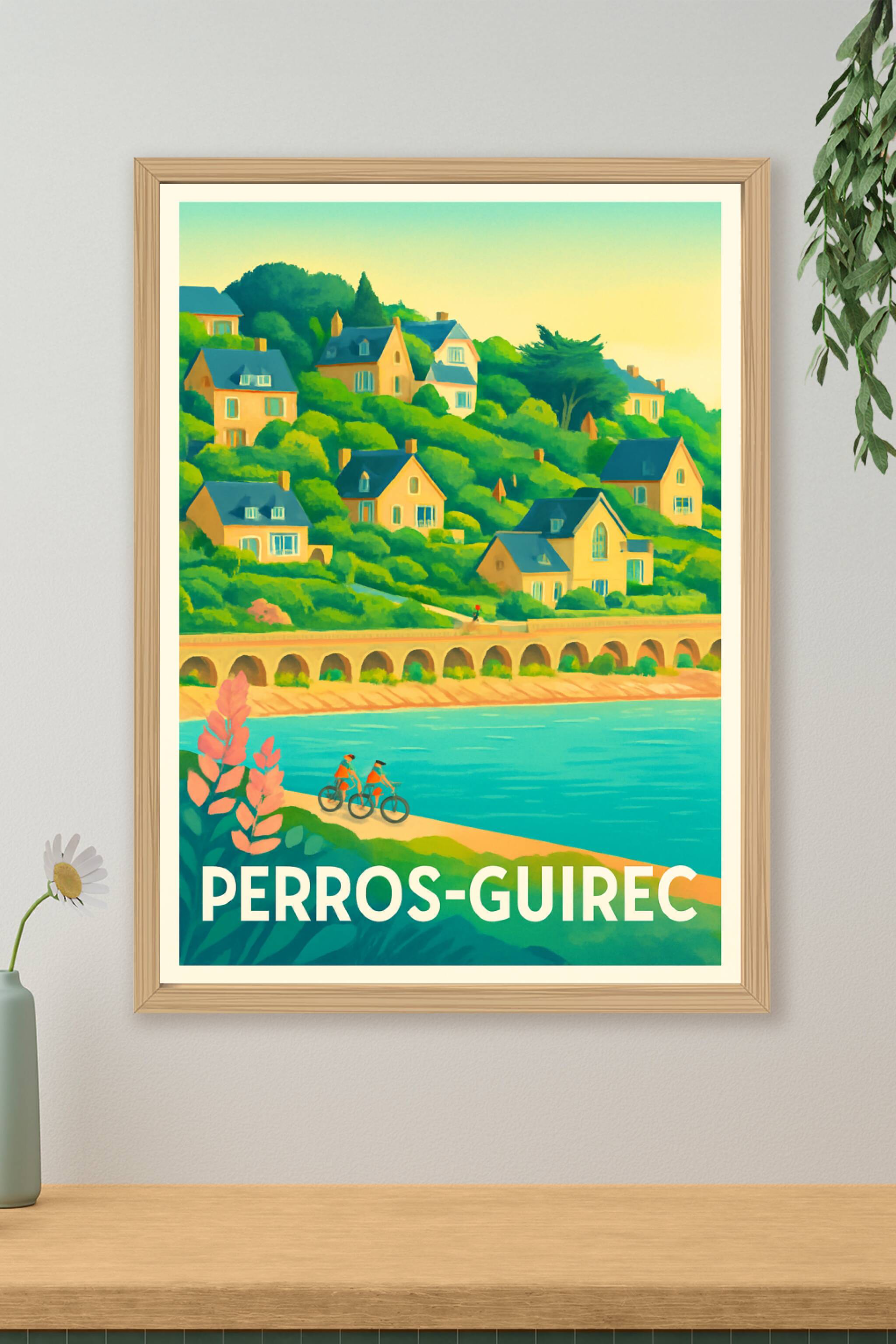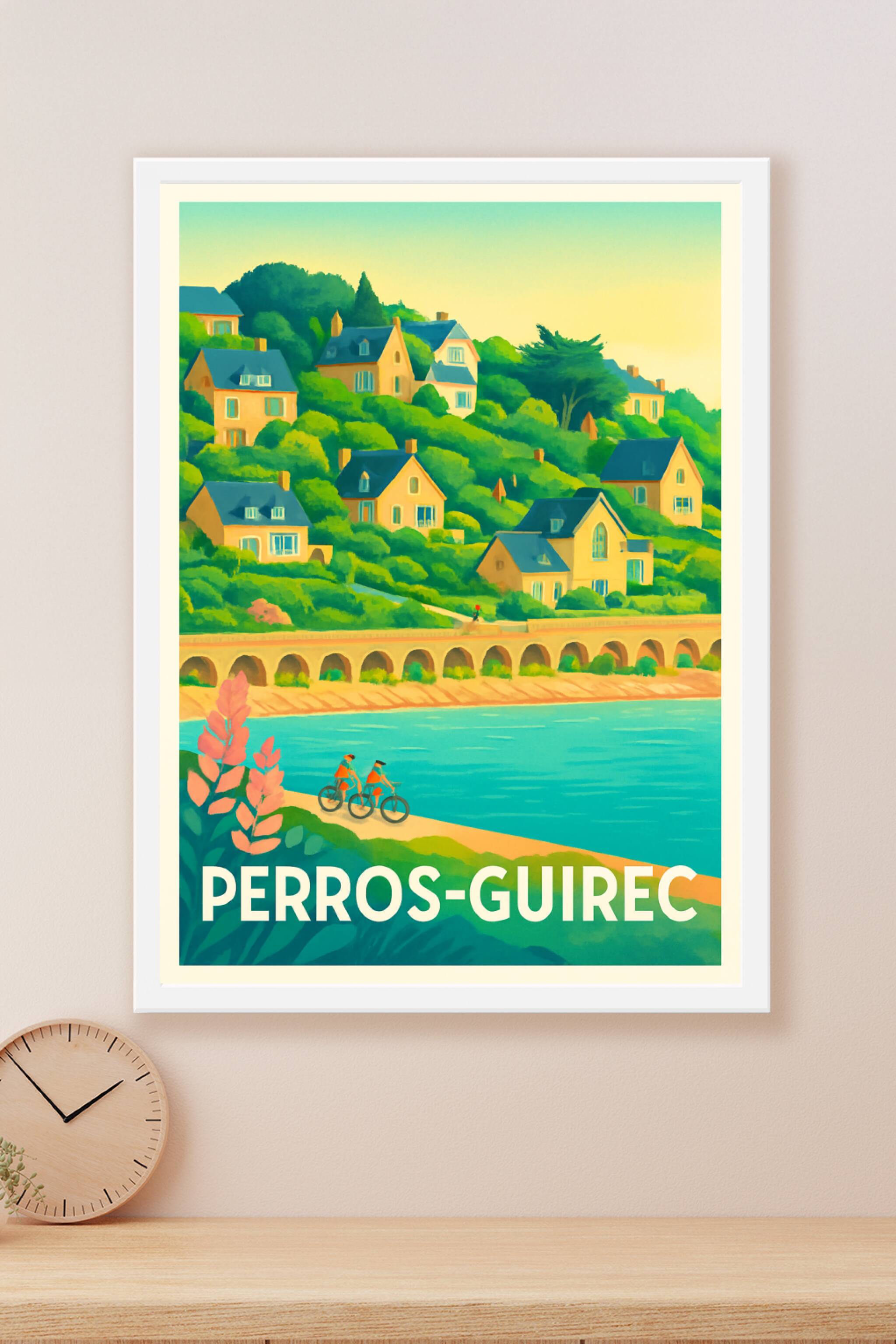 Découvrez la douceur de vivre bretonne avec cette affiche illustrée du village pittoresque de Perros-Guirec, où maisons traditionnelles et nature l...