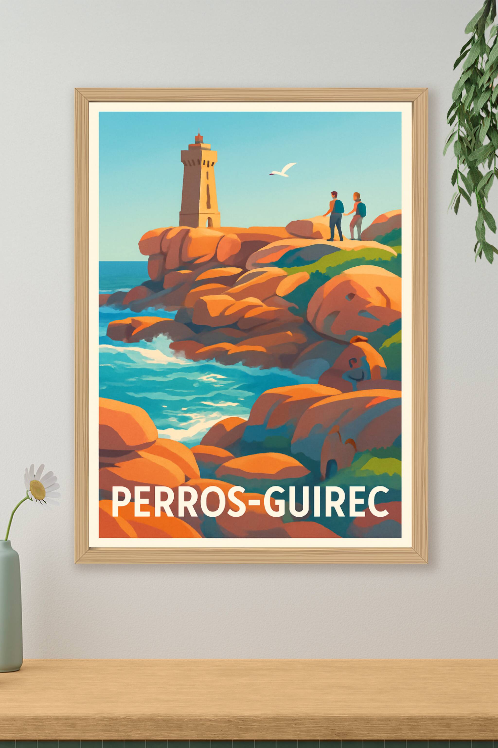 Découvrez la beauté naturelle de Perros-Guirec avec cette affiche illustrée représentant les célèbres rochers de la Côte de Granit Rose, baignés pa...