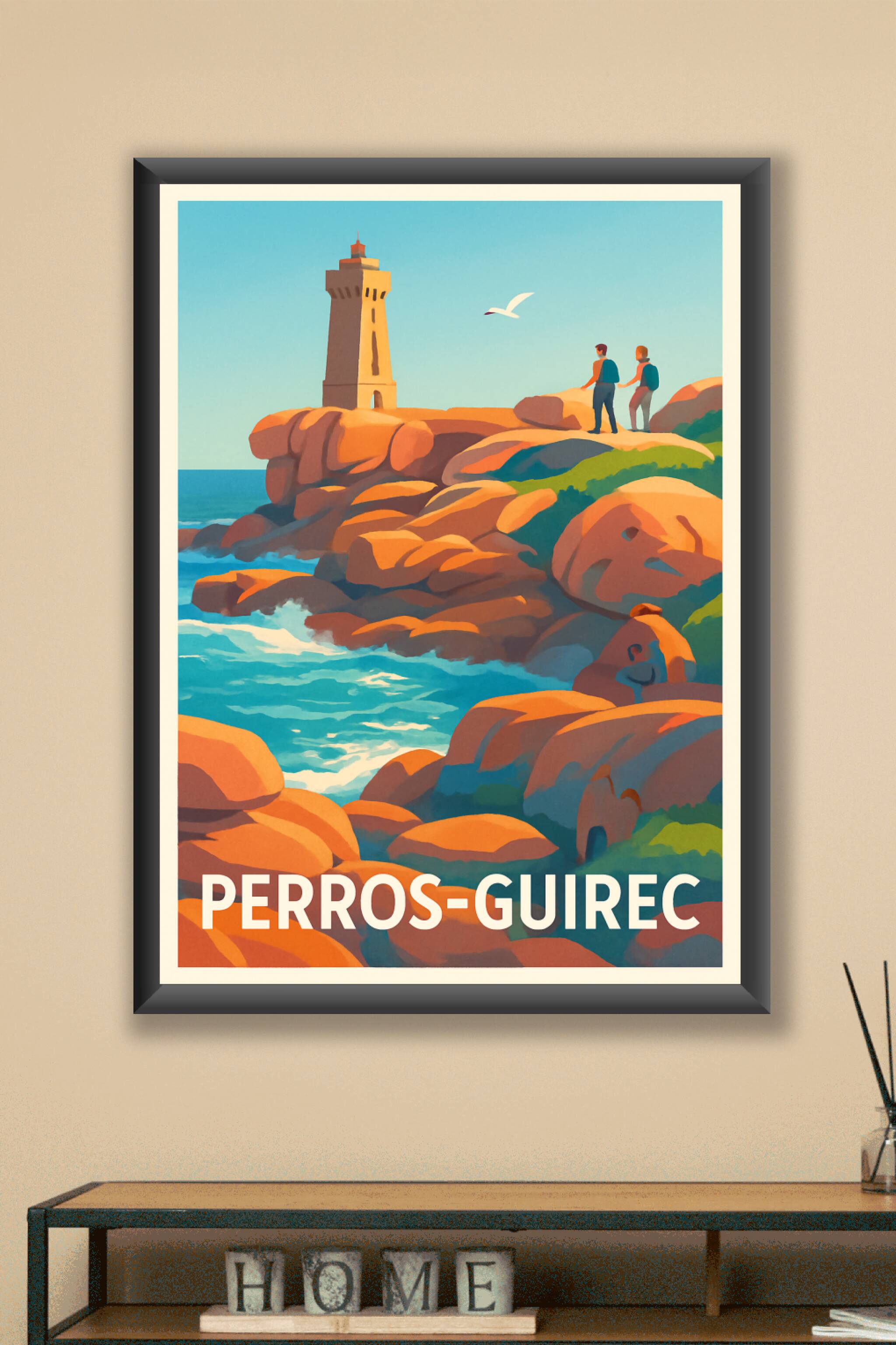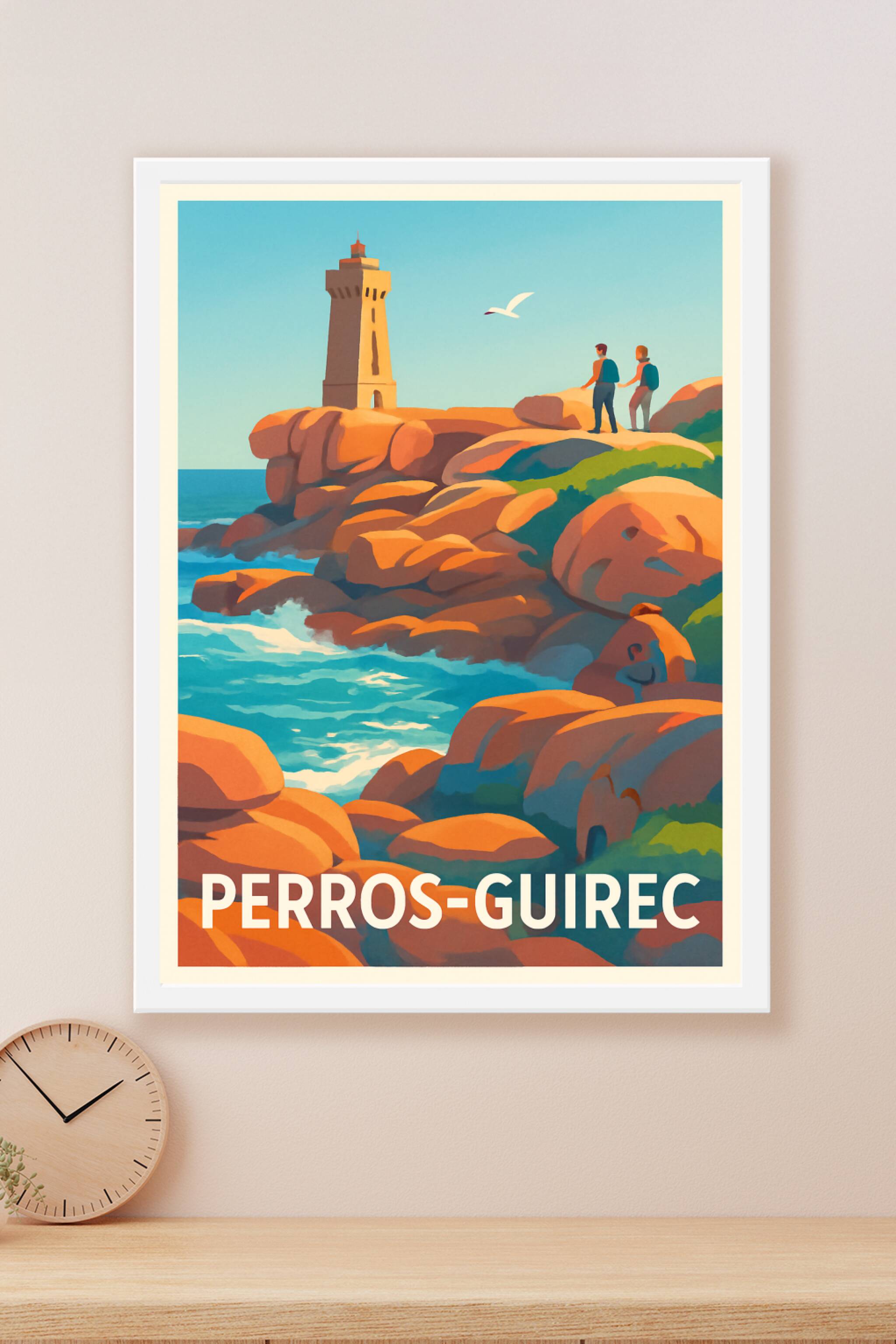 Découvrez la beauté naturelle de Perros-Guirec avec cette affiche illustrée représentant les célèbres rochers de la Côte de Granit Rose, baignés par la lumière dorée du soleil. La scène met en valeur un phare emblématique et des promeneurs profitant d'une vue imprenable sur l'océan Atlantique.Ce poster est imprimé en tirage "Fine Art" sur papier 305g coton, garantissant une reproduction des couleurs éclatante et une texture haut de gamme. Disponible en plusieurs formats allant d'A1 à A4, avec ou sans cadre, cette affiche s'adapte parfaitement à tous les styles d'intérieur.Profitez d'une impression de qualité premium, entièrement fabriquée en France, pour apporter une touche d'élégance et d'authenticité bretonne à votre décoration ou pour offrir un souvenir unique de Perros-Guirec.