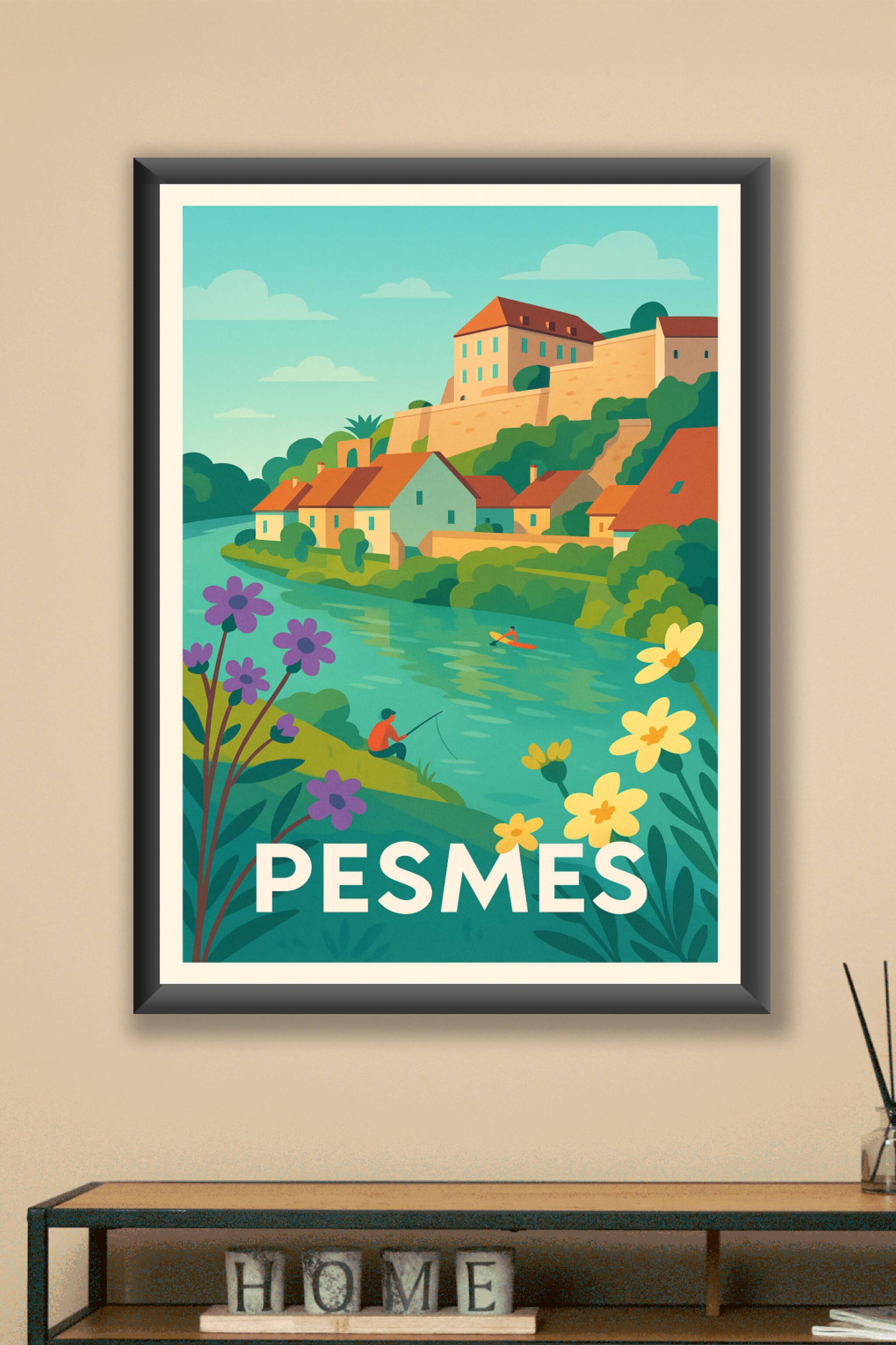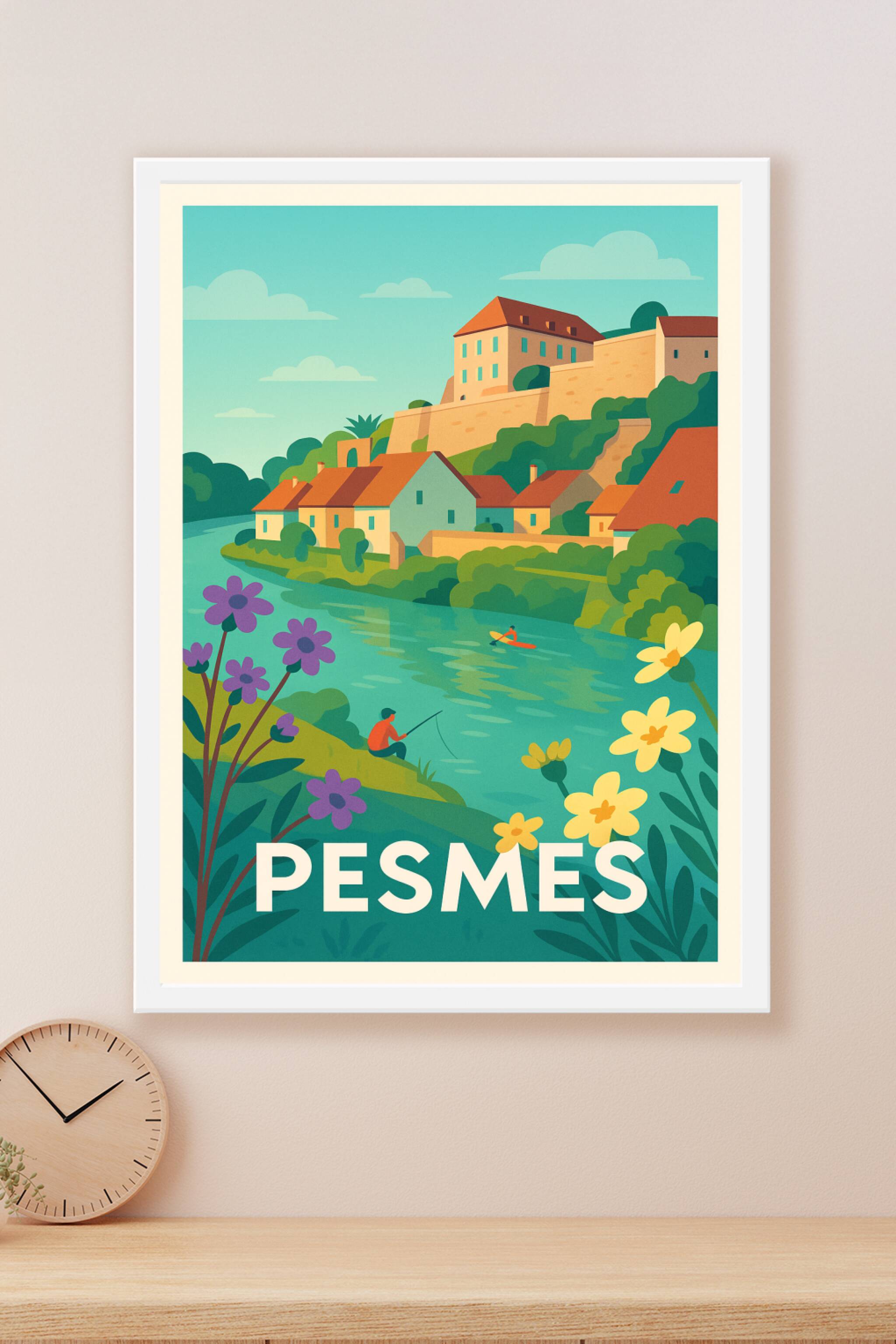 Découvrez l'élégance champêtre de Pesmes avec cette affiche illustrée aux couleurs douces et harmonieuses. Ce poster capture la sérénité des bords ...