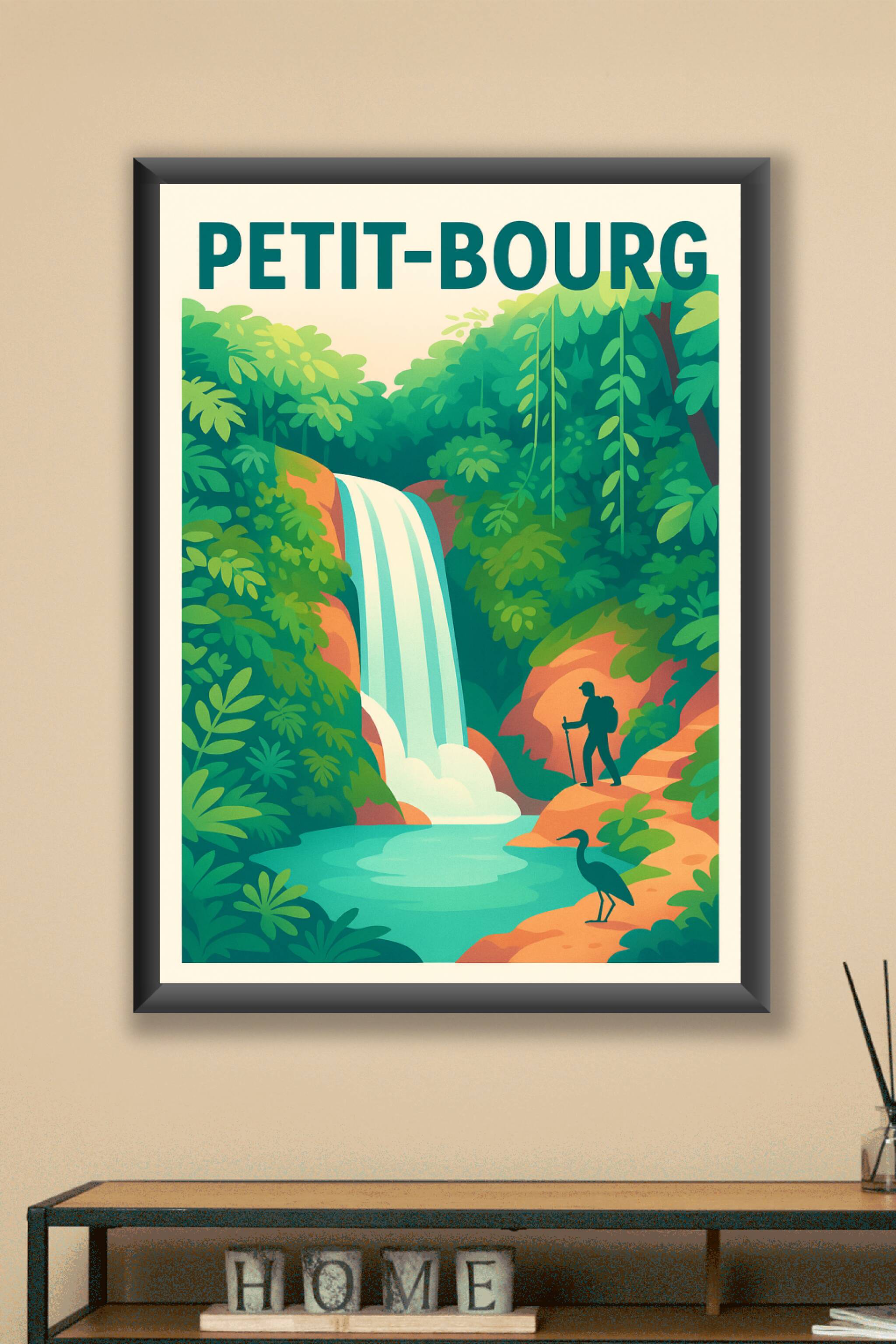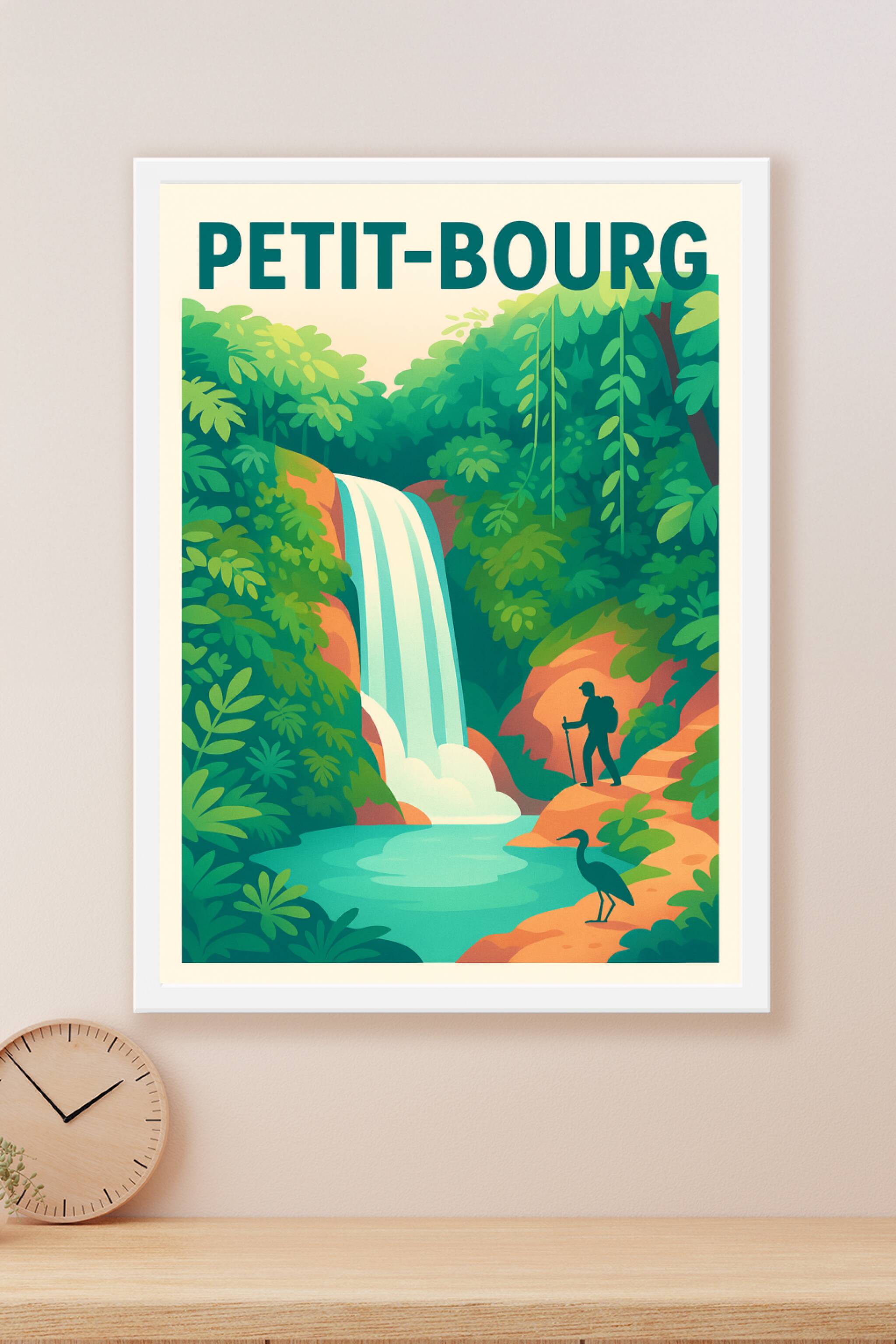 Découvrez l'esprit d'aventure et la beauté sauvage de Petit-Bourg avec cette affiche illustrée mettant en scène une cascade majestueuse nichée au c...