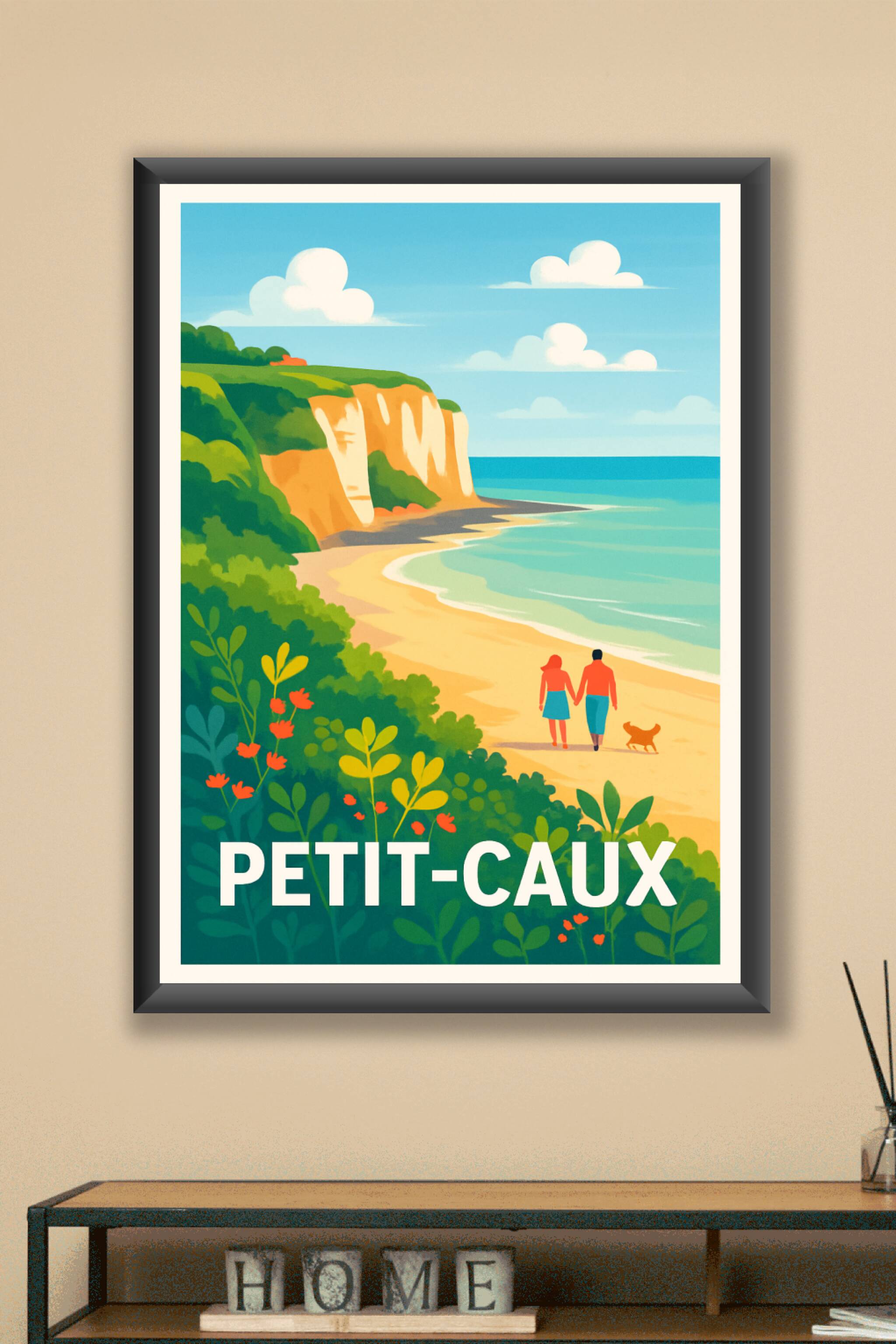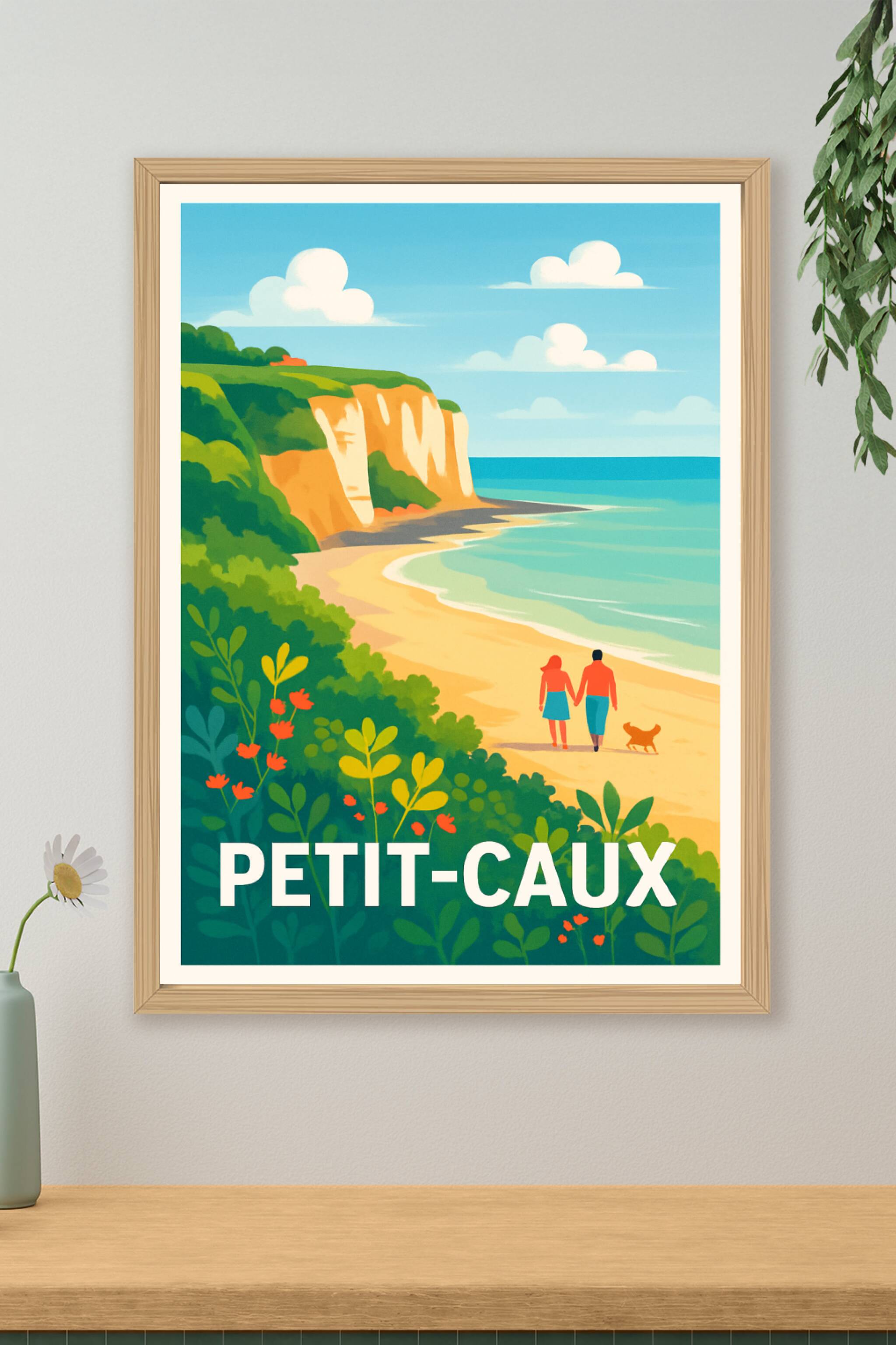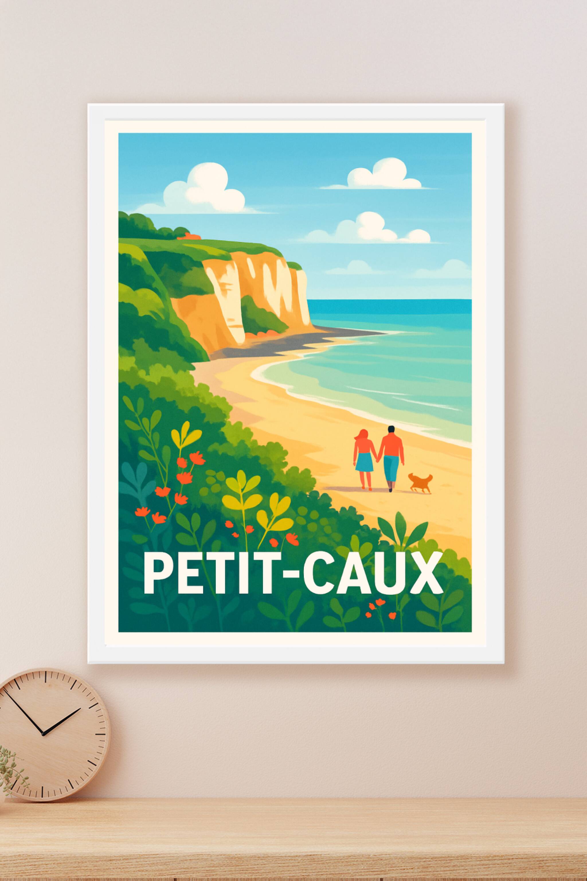 Découvrez la sérénité et la beauté côtière de Petit-Caux avec cette affiche au style vintage et coloré. Ce poster illustre une plage paisible bordé...