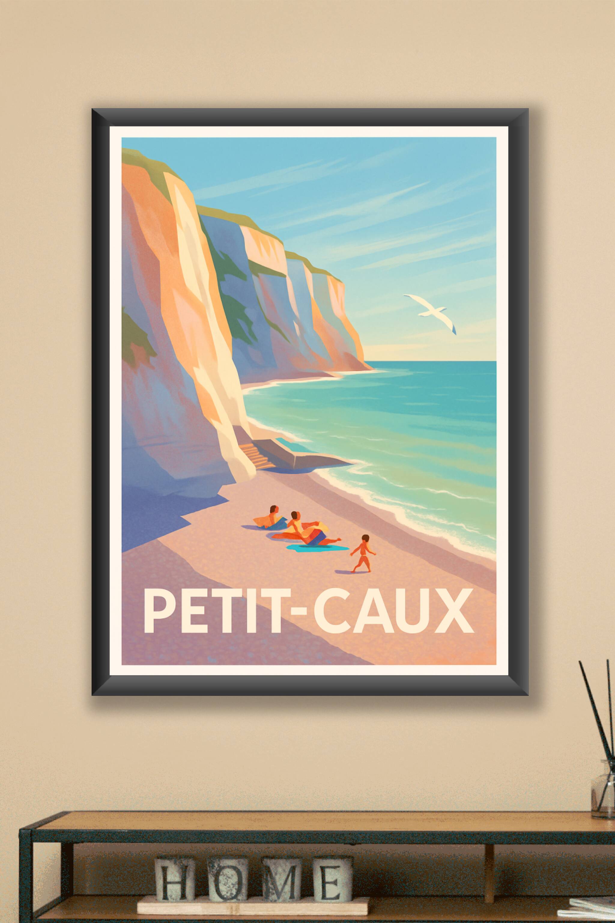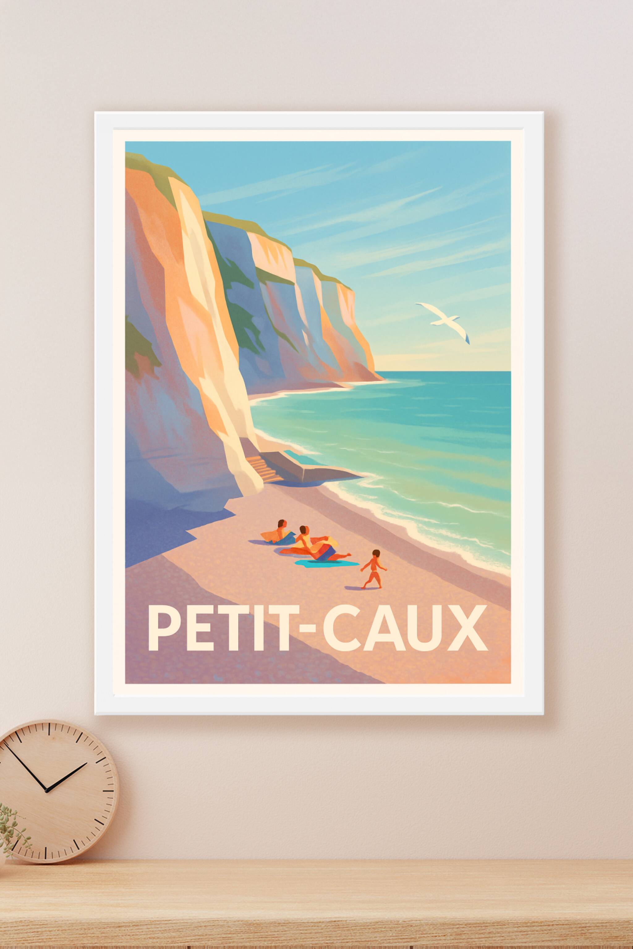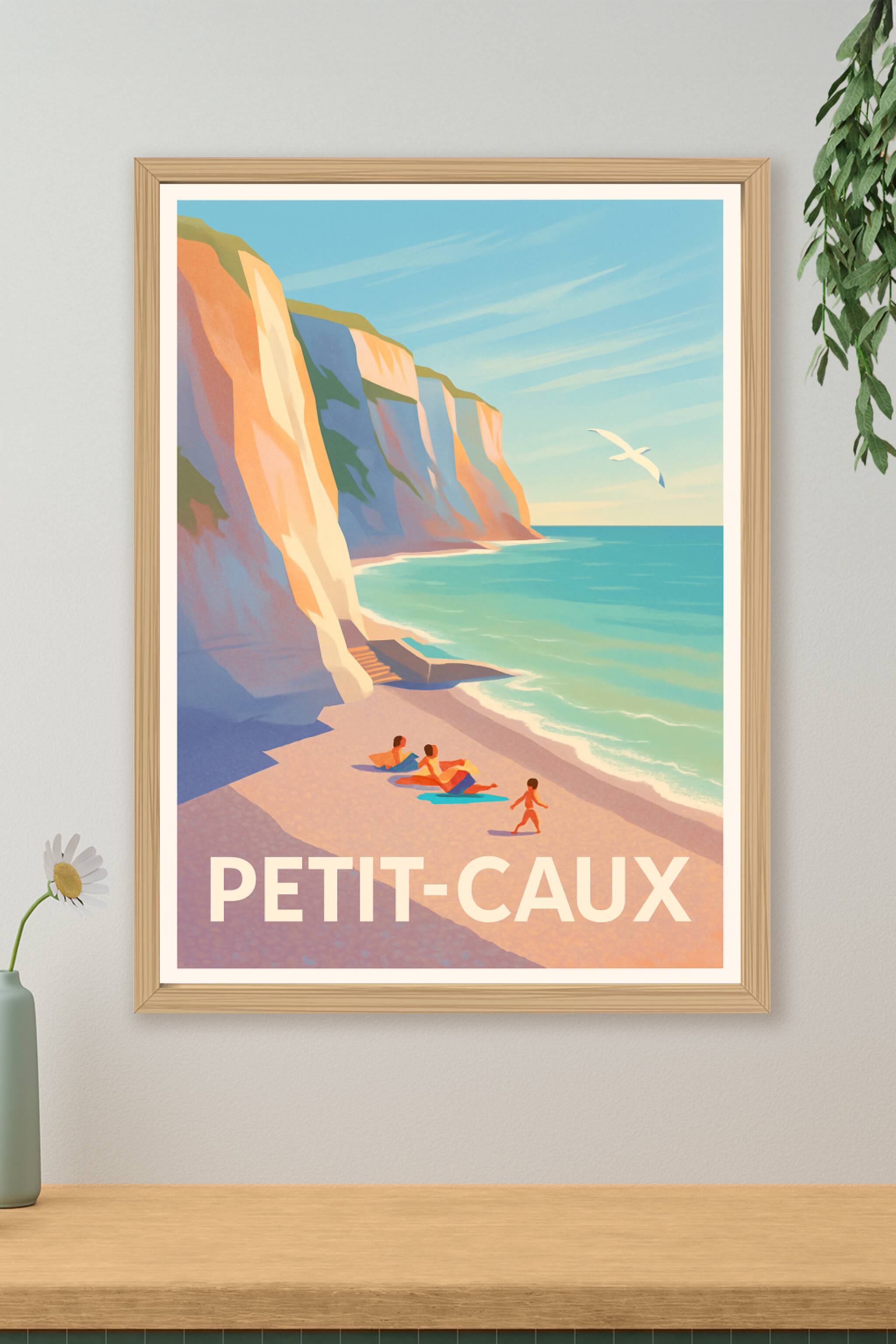 Découvrez la beauté naturelle et paisible de Petit-Caux à travers cette affiche illustrée aux teintes douces et lumineuses. Les falaises majestueus...