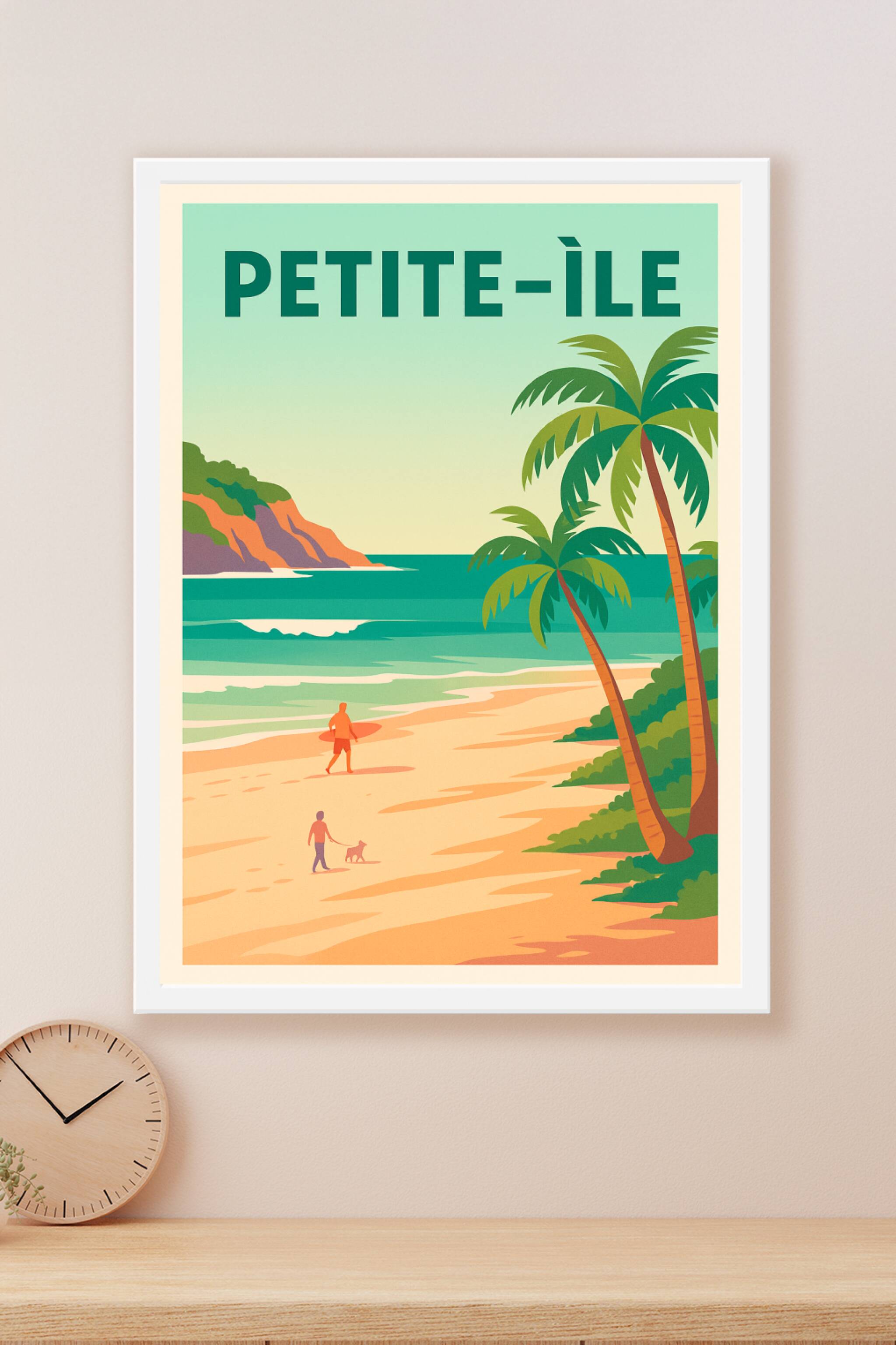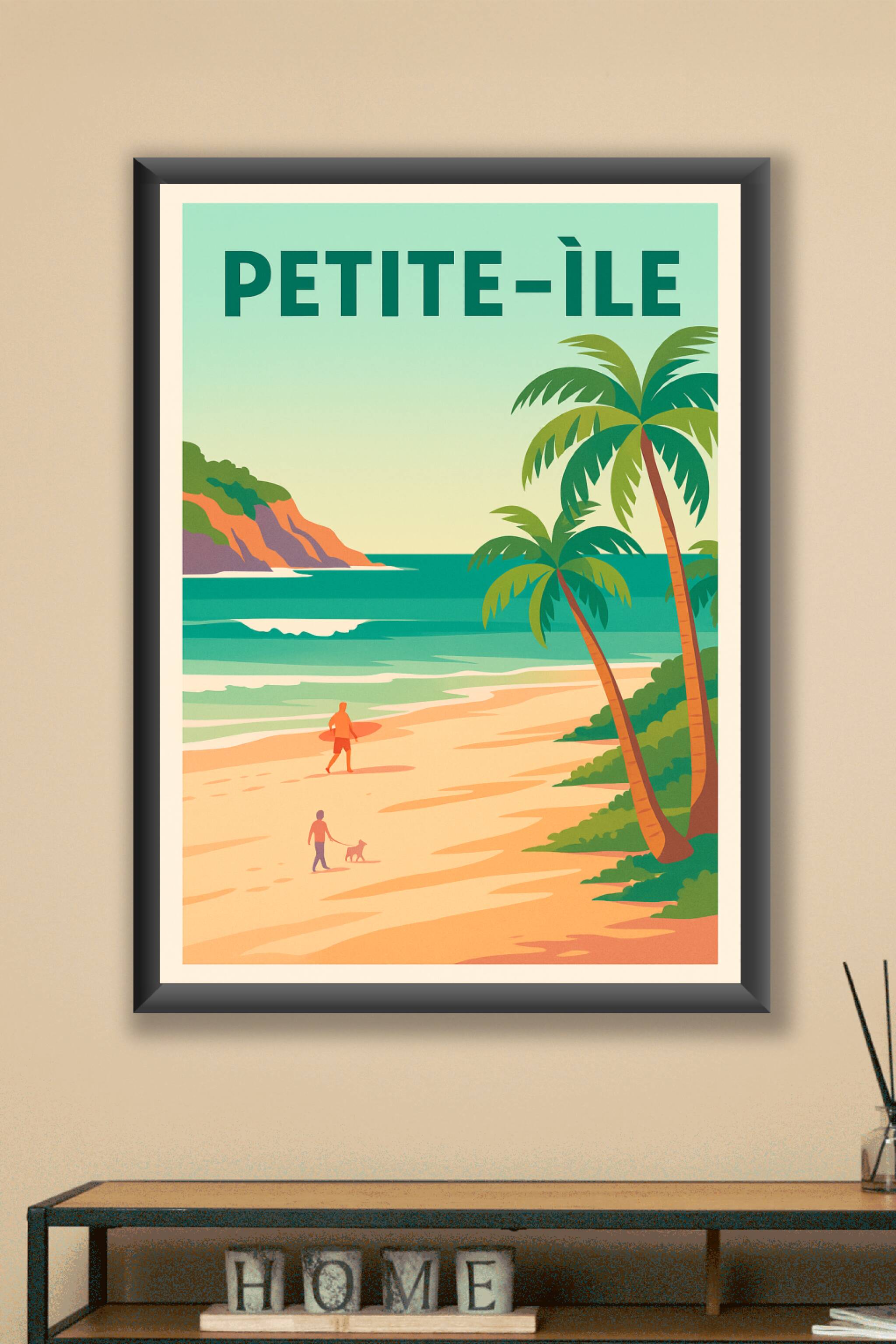 Découvrez la sérénité et la beauté de Petite-Île avec cette affiche au style vintage illustrant une plage bordée de palmiers et des promeneurs prof...