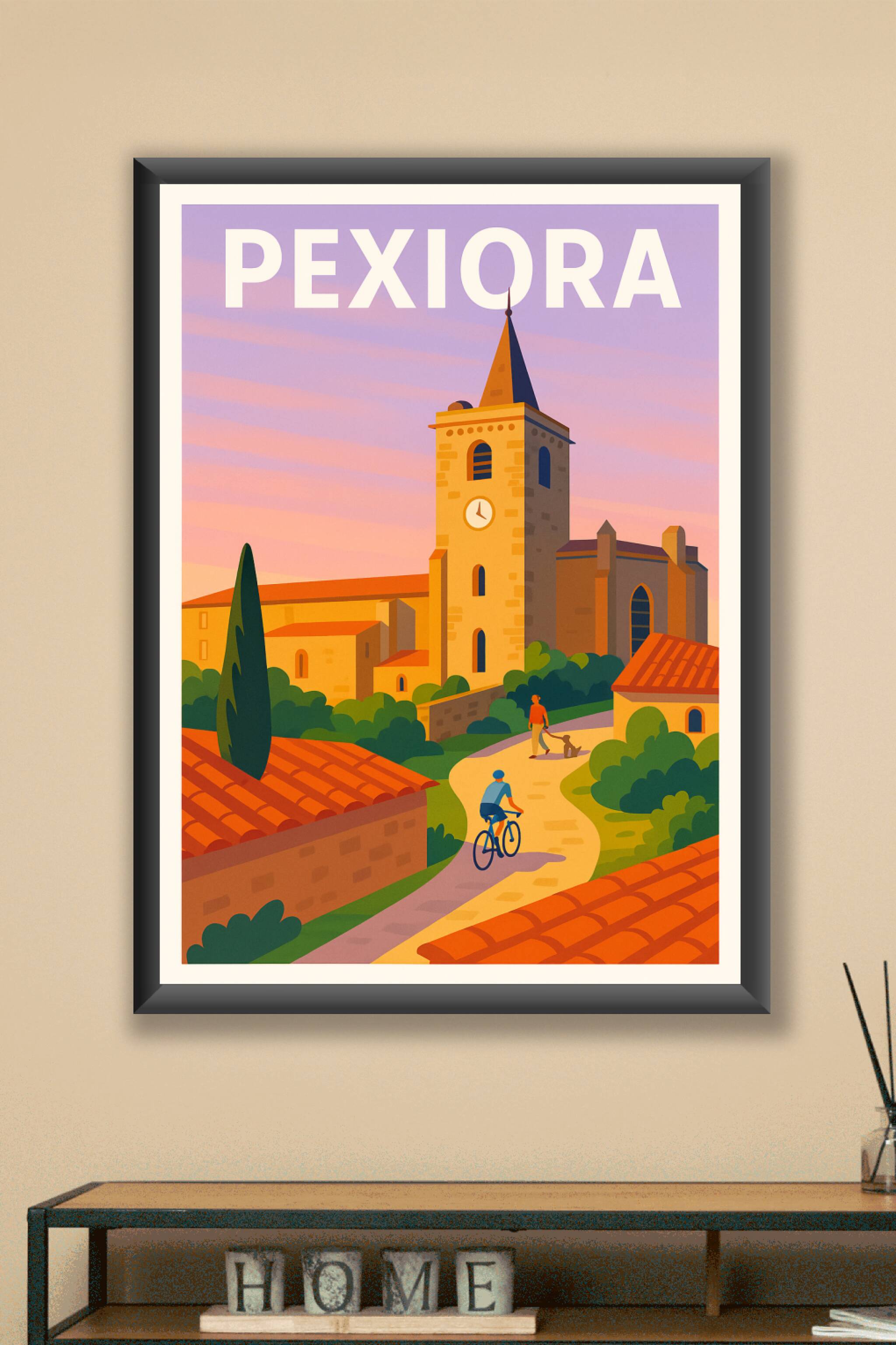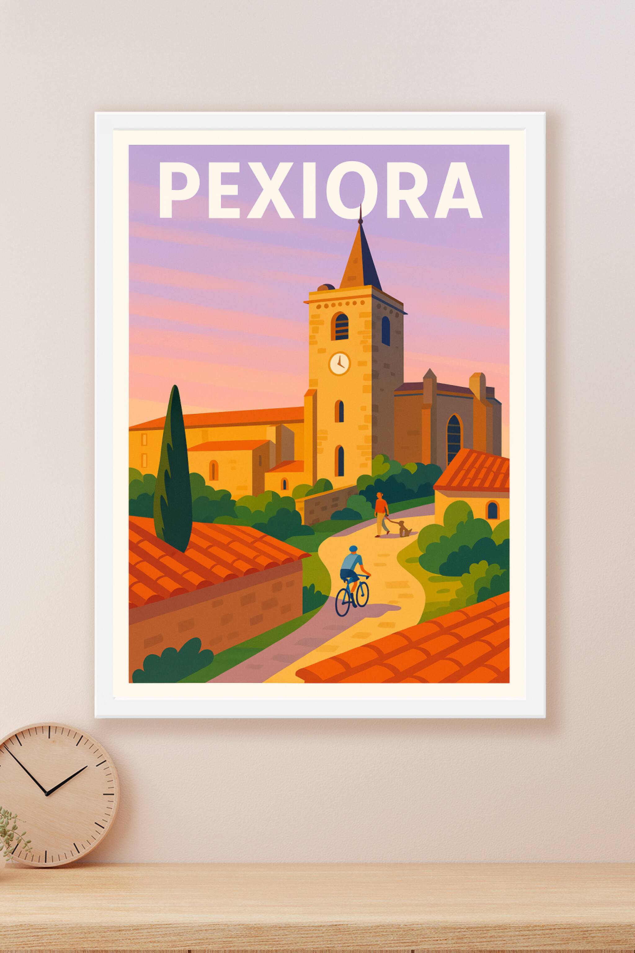 Découvrez l'atmosphère paisible et chaleureuse de Pexiora à travers cette affiche illustrée avec des couleurs douces et un style épuré. Le poster m...