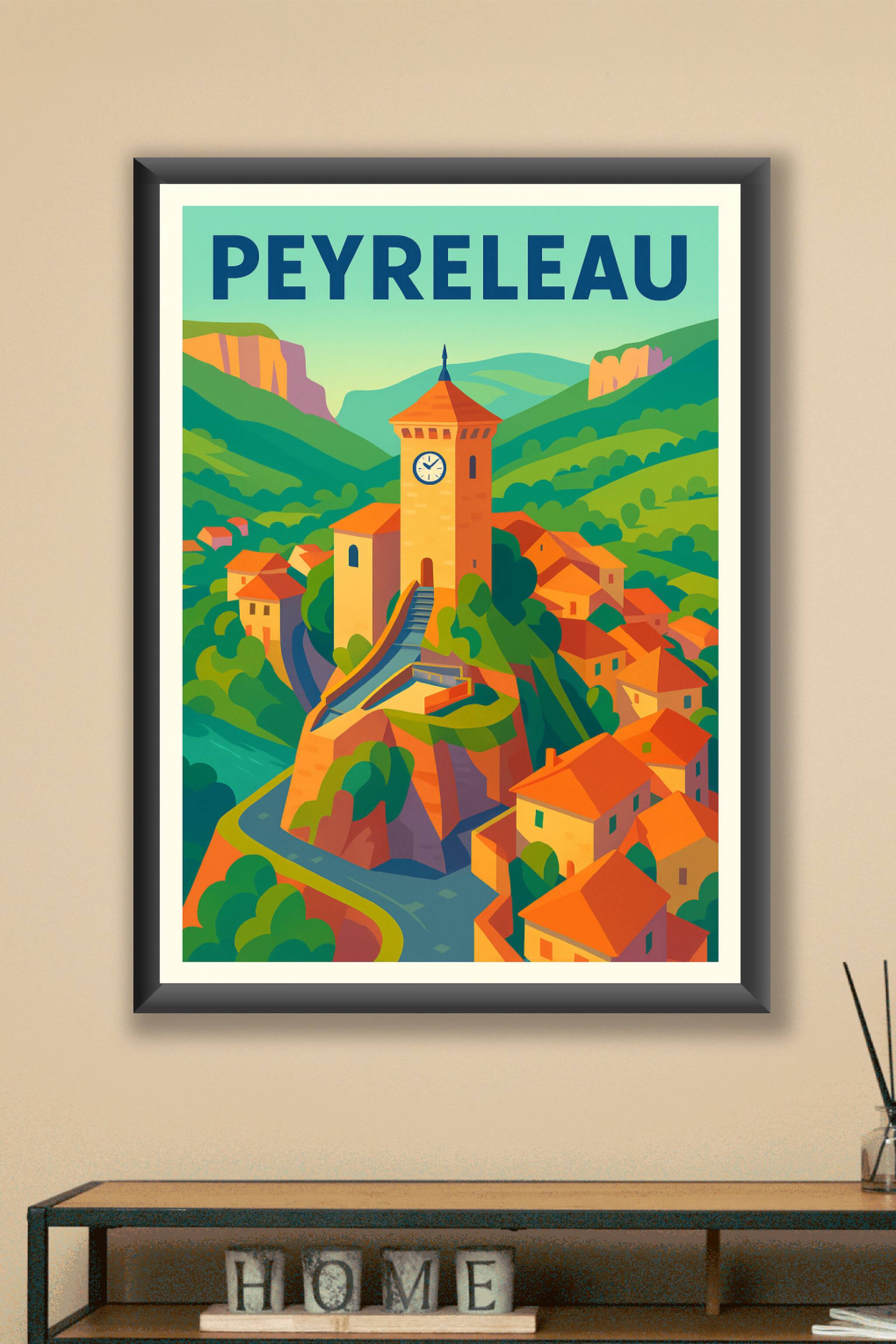 Découvrez l'authenticité de Peyreleau avec cette affiche illustrée qui met en valeur la tour emblématique et les toits orangés nichés dans un écrin de verdure. Ce poster au style coloré et chaleureux transporte l'esprit dans ce village au charme unique, entouré de paysages montagneux remarquables. Imprimée en tirage "Fine Art" sur papier 305g coton, cette affiche garantit une qualité d'impression exceptionnelle et des couleurs vibrantes.Disponible en formats A1 à A4, avec ou sans cadre, elle s'adapte parfaitement à votre décoration intérieure pour apporter une note d'évasion et de douceur. Offrez-vous ou offrez un souvenir raffiné de cette perle du Sud de la France, avec la garantie d'une fabrication premium 100% française.