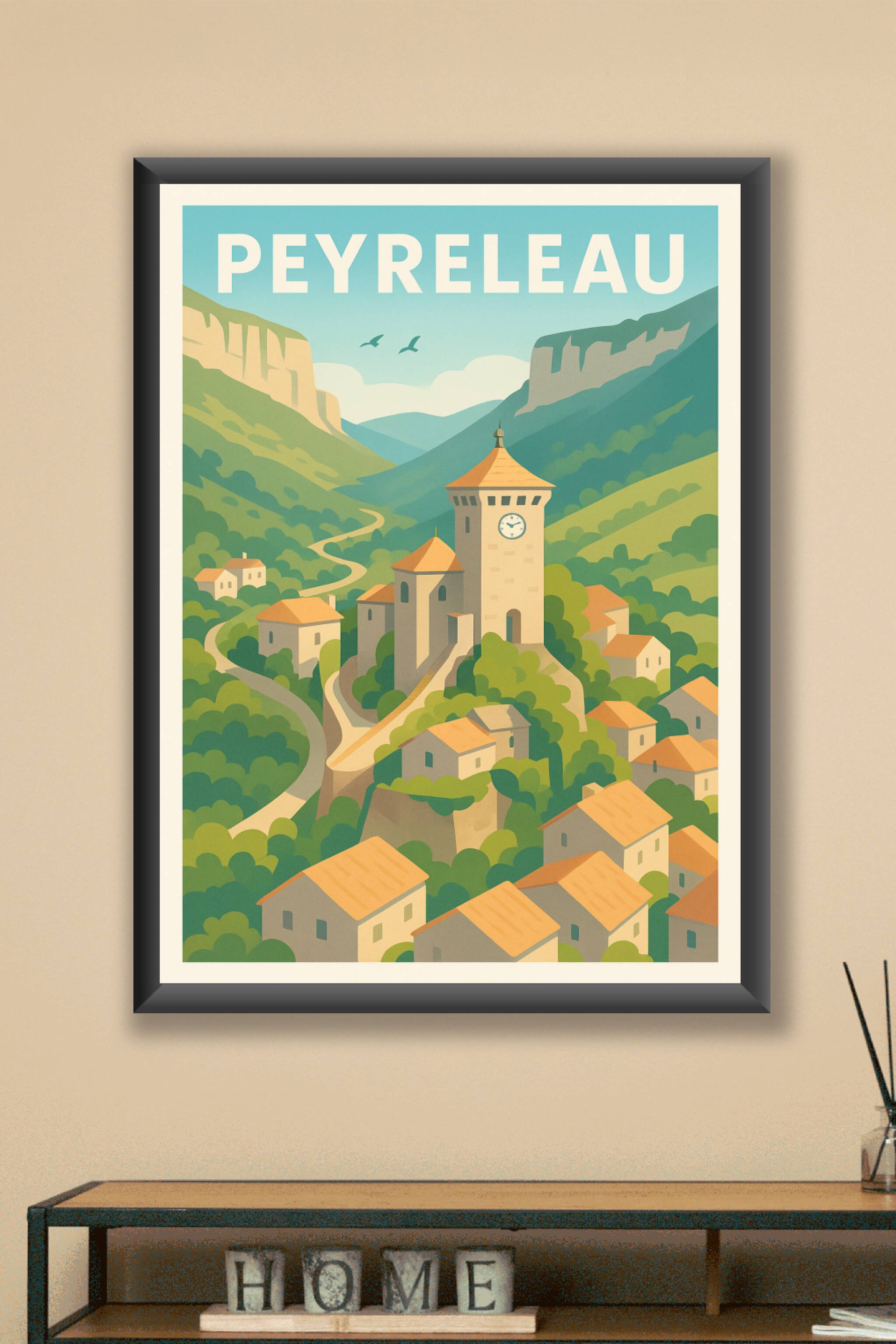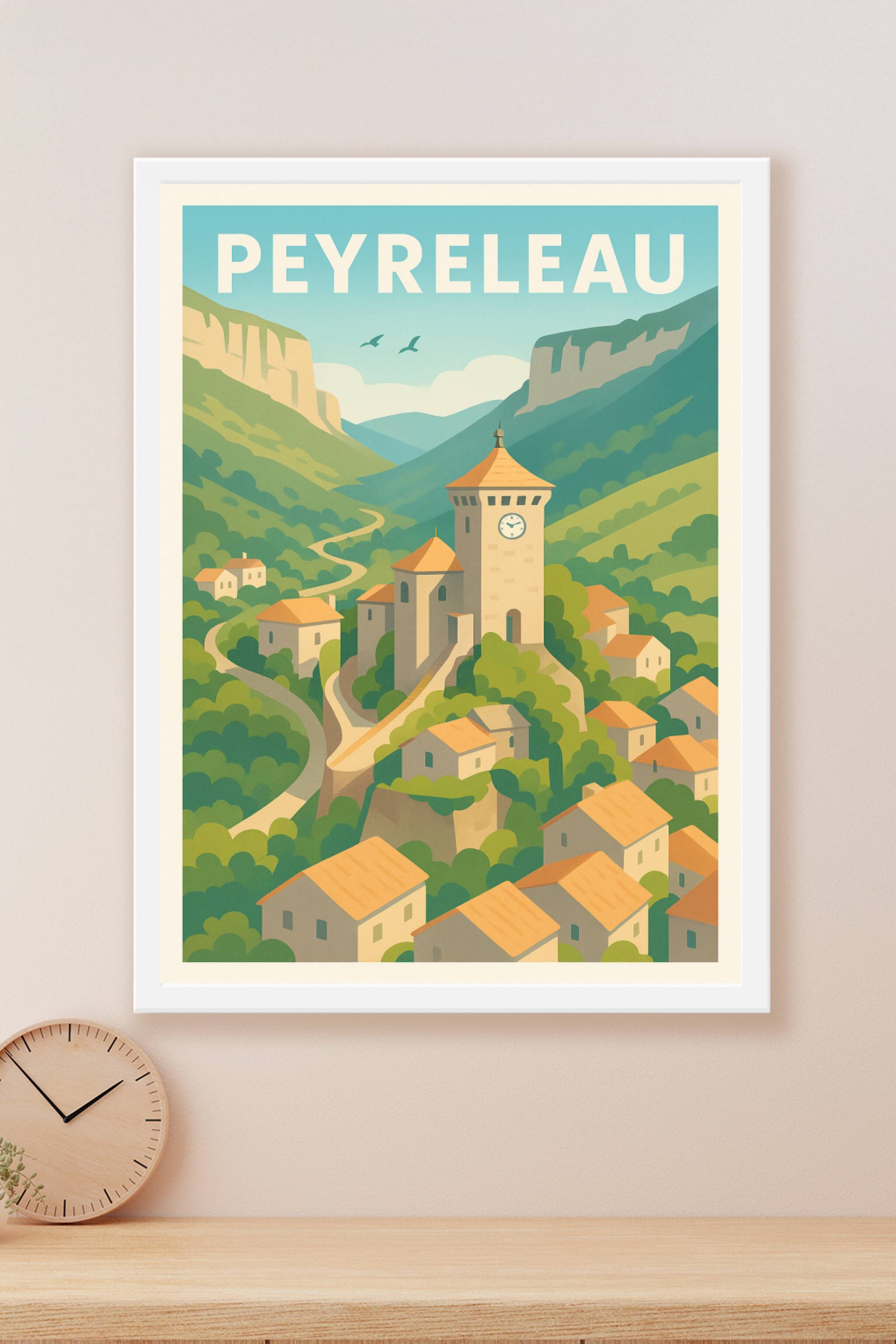 Découvrez l’élégance paisible de Peyreleau à travers cette affiche illustrée aux couleurs douces et harmonieuses. Cette représentation captivante m...
