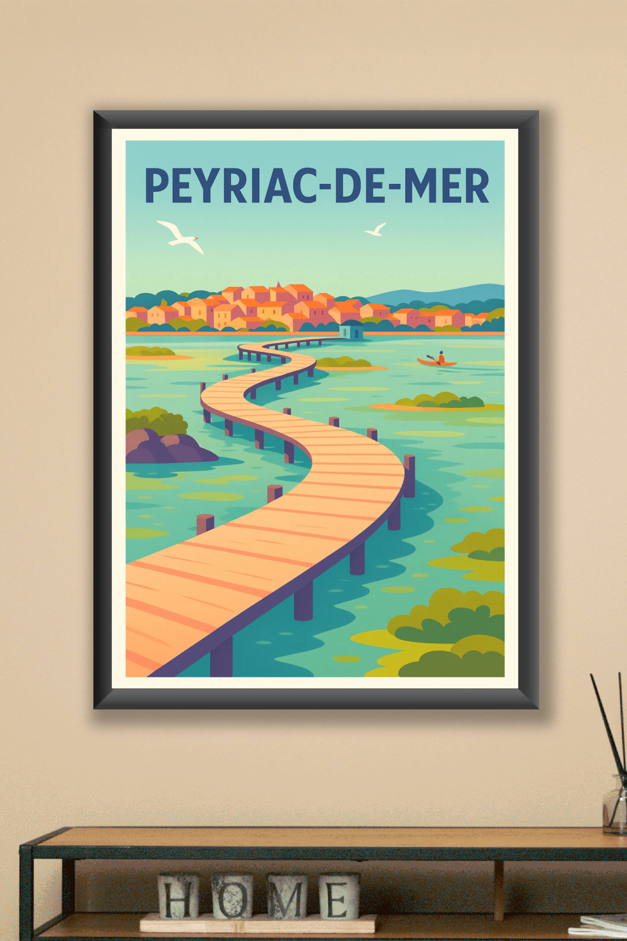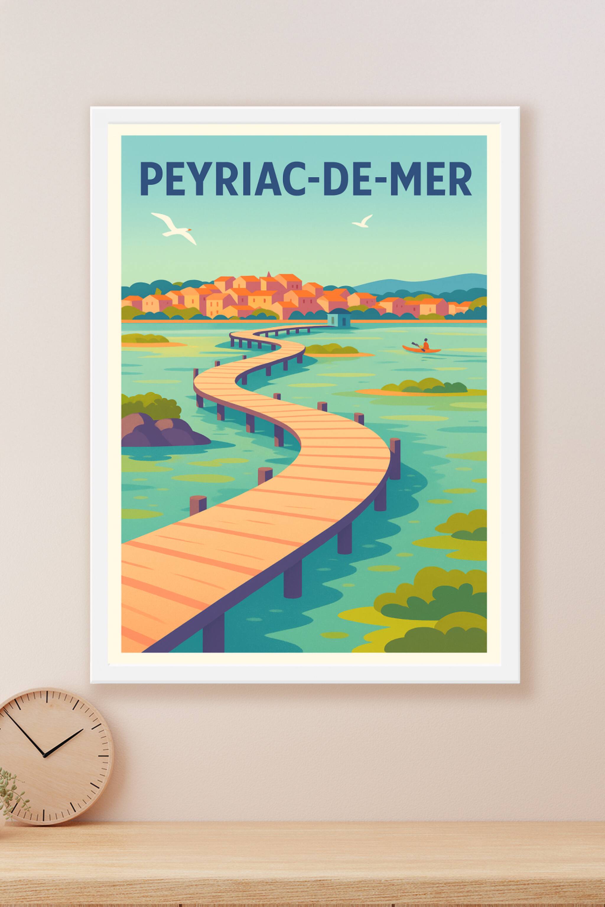 Découvrez l'élégance et la sérénité de Peyriac-de-Mer à travers cette affiche illustrée aux couleurs douces et apaisantes. Ce poster met en avant l...