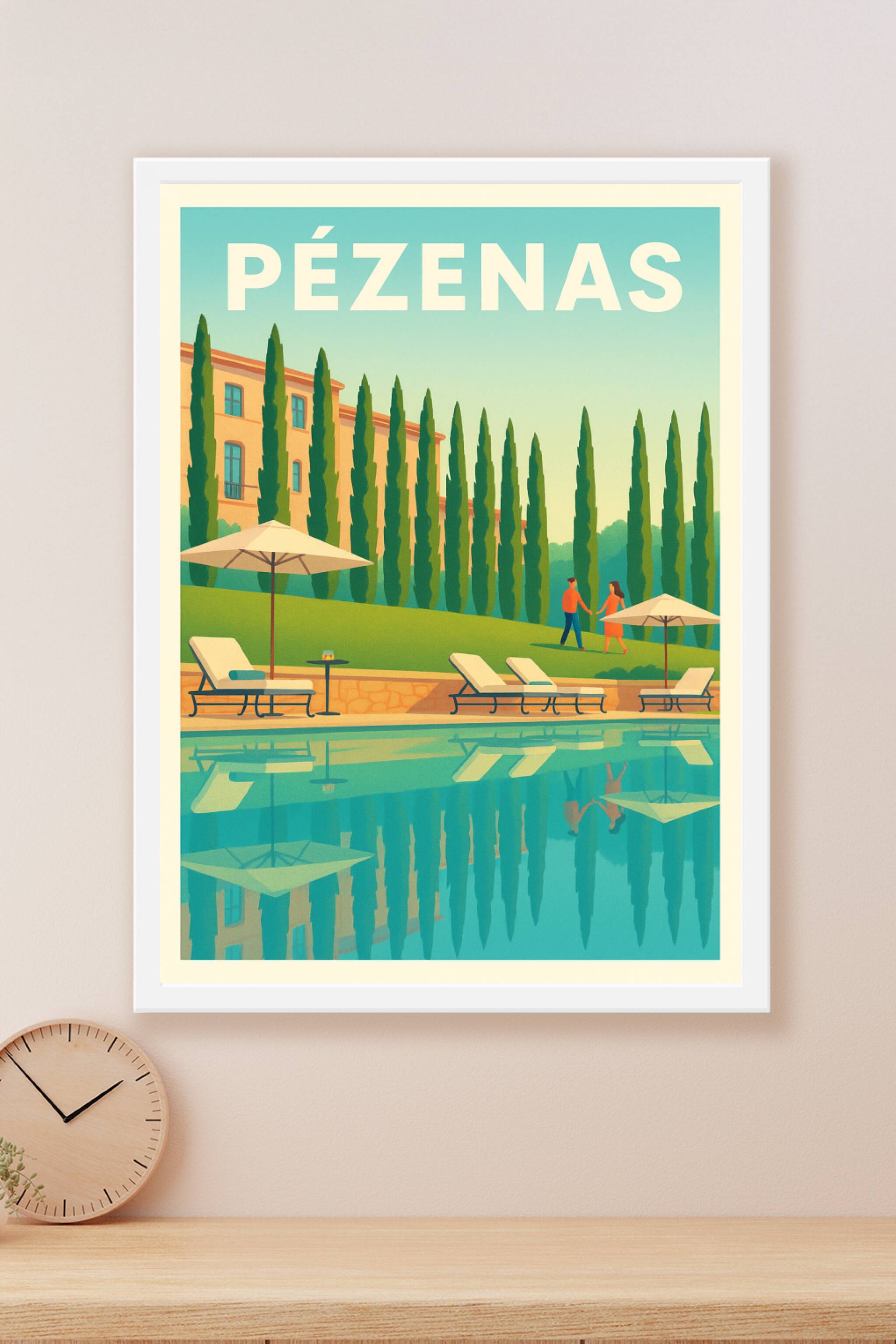 Offrez-vous une escapade visuelle au cœur de Pézenas avec cette affiche vintage mettant en scène une piscine bordée de chaises longues et parasols,...