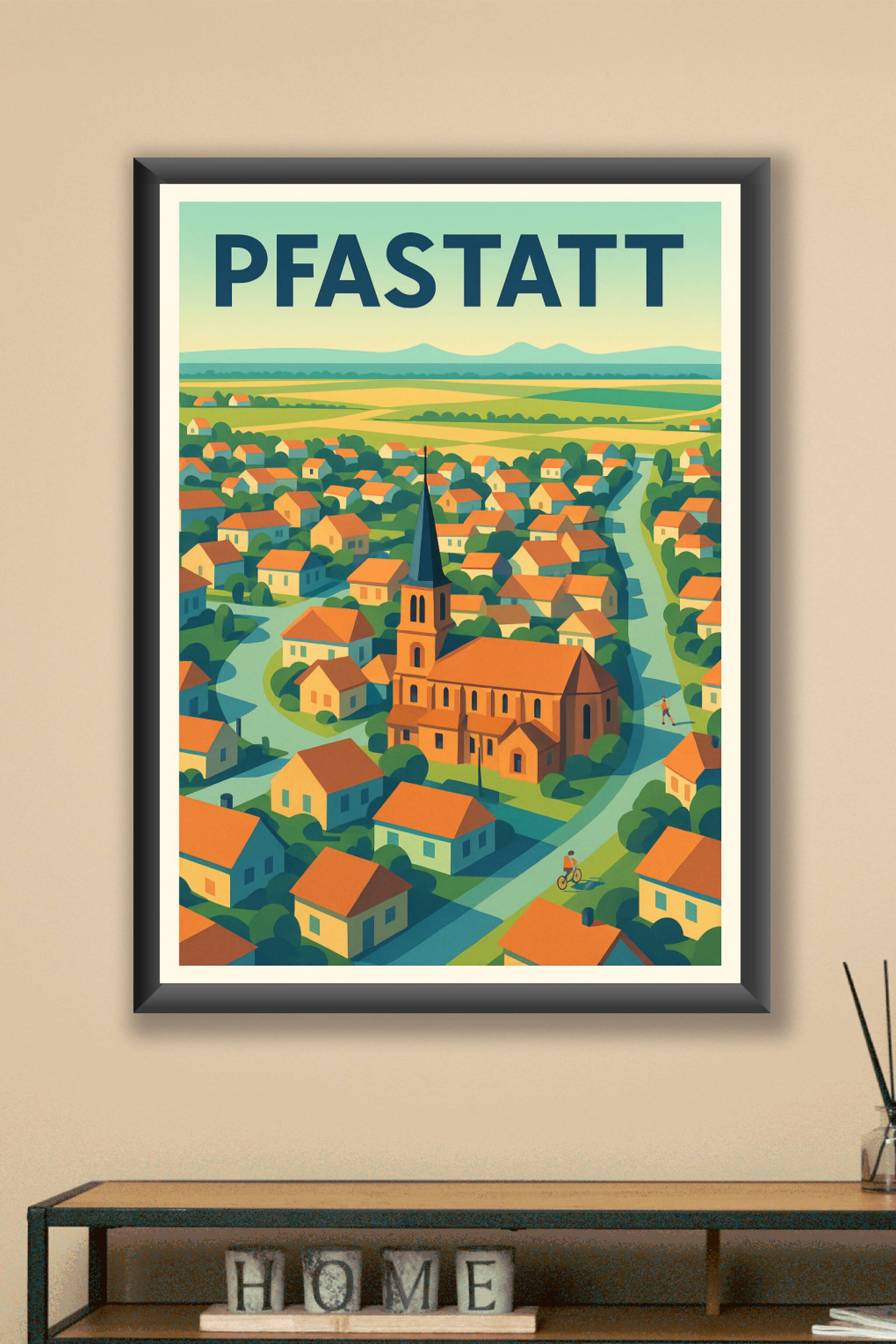 Découvrez le charme authentique de Pfastatt à travers cette affiche illustrée aux couleurs douces et apaisantes. Ce poster met en avant l'architecture typique du village avec ses maisons aux toits orangés et son église centrale, le tout dans un paysage bucolique et lumineux. Imprimée en tirage "Fine Art" sur un papier 305g coton de haute qualité, cette affiche offre une finesse d'impression et des couleurs éclatantes qui sublimeront votre intérieur. Disponible en formats A1 à A4, avec ou sans cadre, ce poster est parfait pour apporter une touche chaleureuse et artistique à votre décoration ou pour offrir un cadeau unique aux passionnés d'Alsace et de paysages traditionnels.