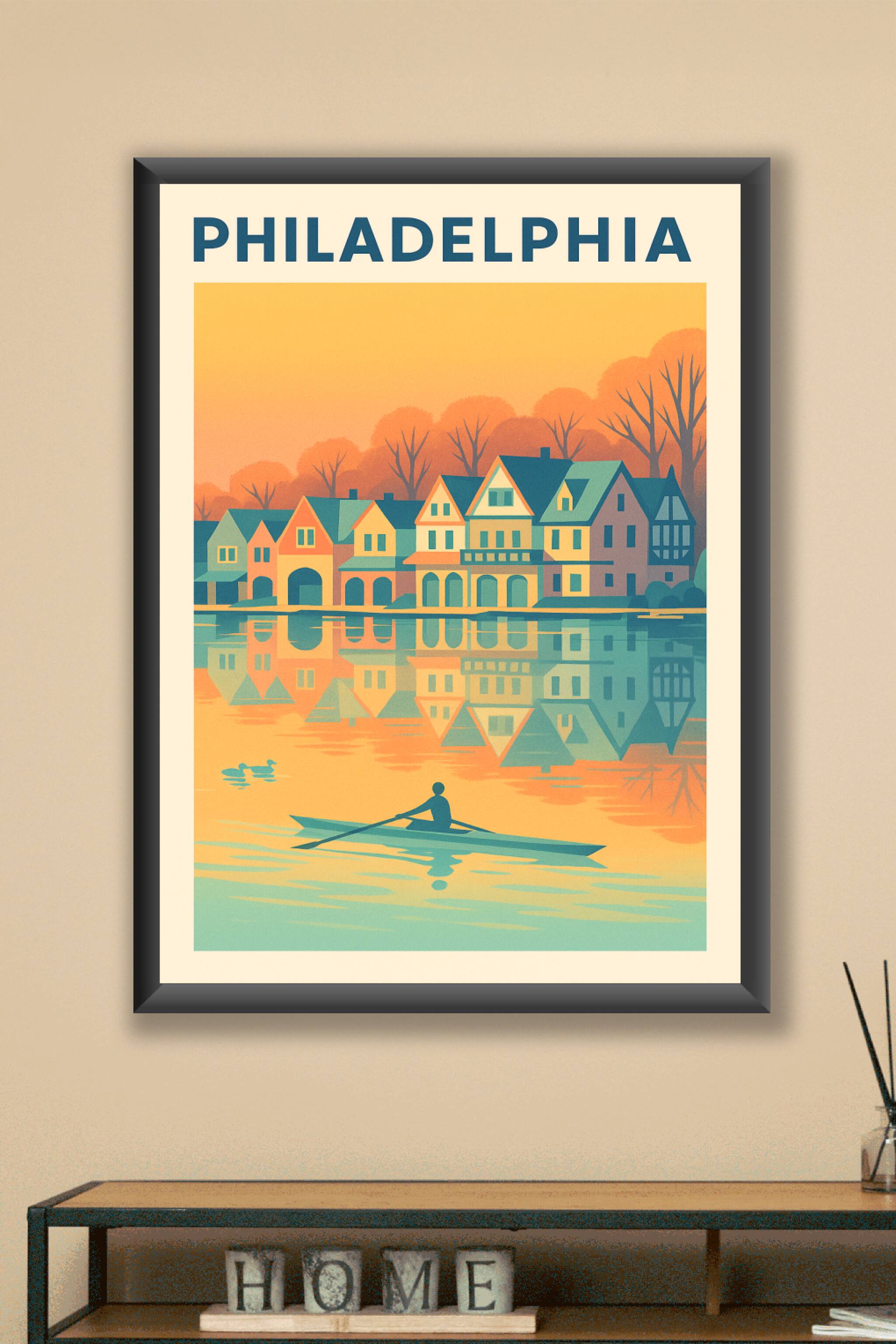 Découvrez une scène paisible et colorée de Philadelphia avec cette affiche au style rétro et doux. L'illustration met en avant les maisons typiques au bord de l'eau, leur reflet parfait dans la rivière ainsi qu'un rameur solitaire qui glisse sur la surface calme. Ce poster délicatement travaillé est imprimé en tirage "Fine Art" sur un papier 305g coton offrant une qualité d'impression haut de gamme et une résistance durable dans le temps. Disponible en plusieurs formats allant de A1 à A4, avec ou sans cadre, cette affiche apportera une touche artistique et chaleureuse à votre décoration intérieure. Offrez-vous ou offrez un souvenir unique et raffiné de Philadelphia, admirablement mis en valeur grâce à une impression 100% française.