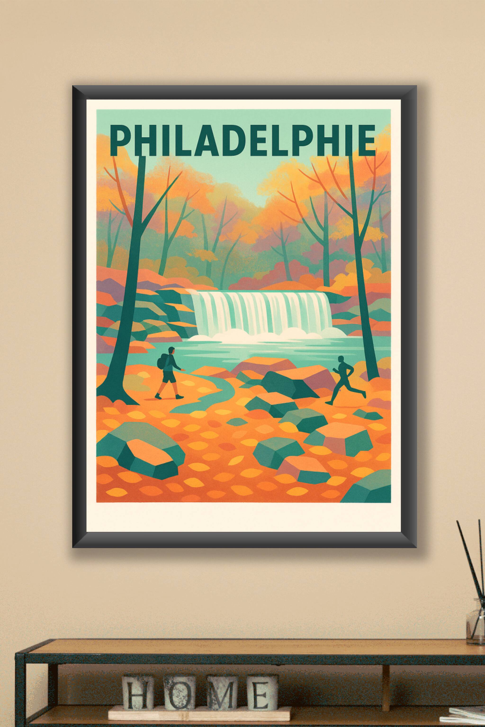 Découvrez la beauté sauvage de Philadelphie avec cette affiche illustrée mettant en scène une cascade majestueuse entourée de forêts aux couleurs c...