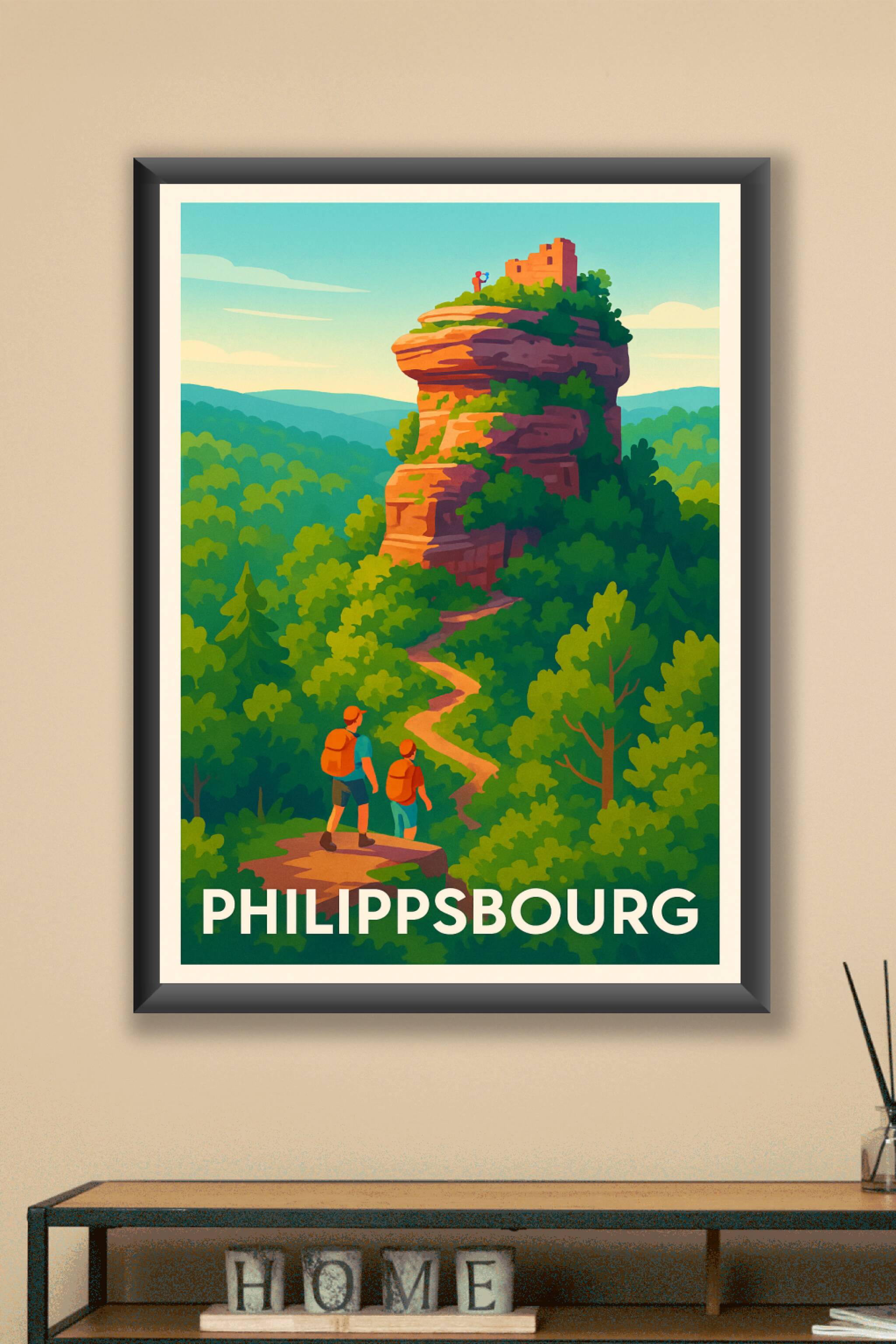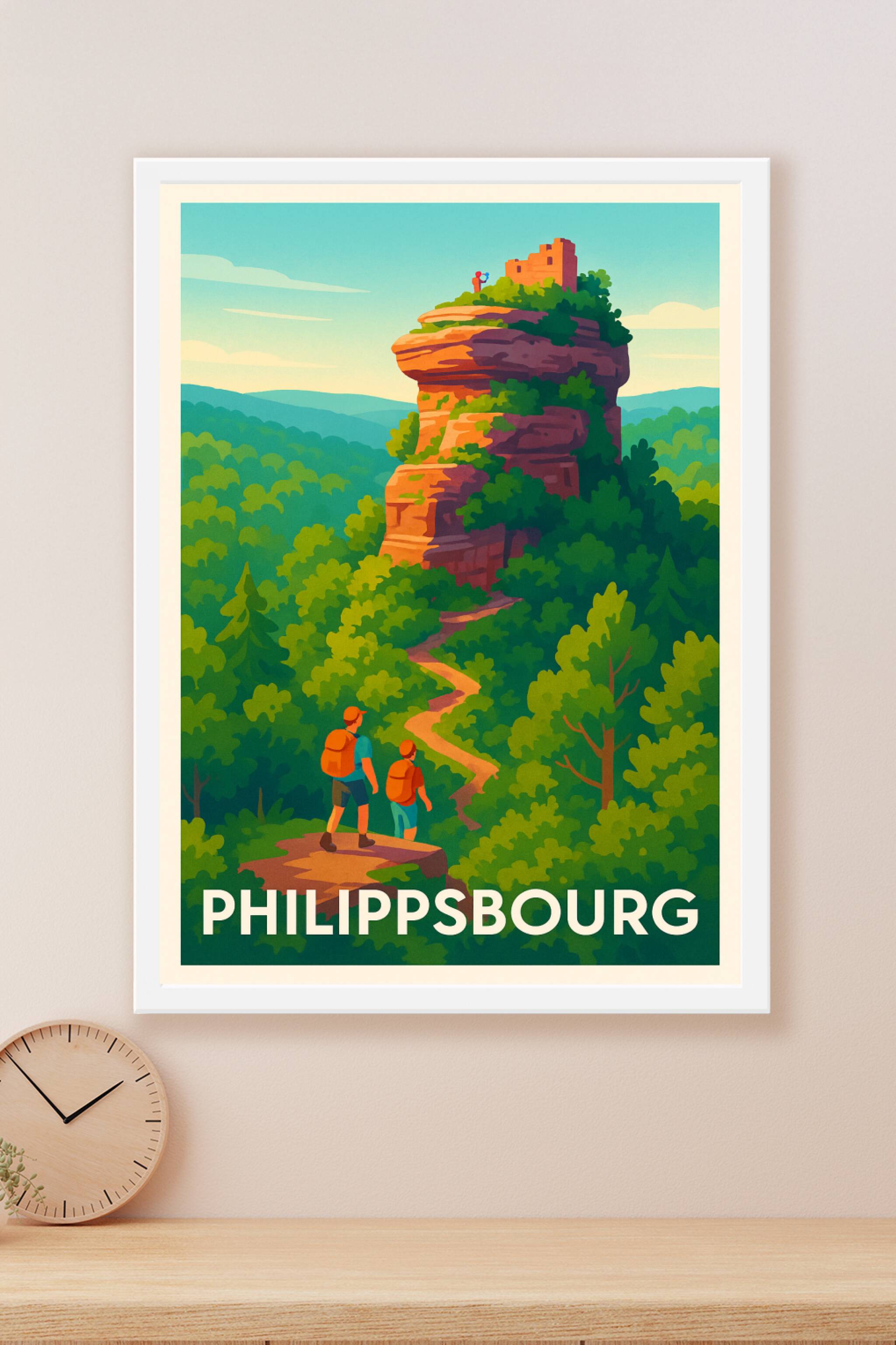 Découvrez la beauté sauvage de Philippsbourg avec cette affiche illustrant le célèbre Rocher du Dabo, emblème naturel et spectaculaire de la région. Le poster met en scène une randonnée familiale à travers une forêt luxuriante, menant à ce site unique où histoire et nature se rencontrent. Imprimée en tirage "Fine Art" sur un papier 305g coton d'une qualité exceptionnelle, cette affiche est disponible en formats A1 à A4, avec ou sans cadre. Apportez une touche authentique et verdoyante à votre intérieur grâce à ce poster d'exception, fabriqué avec soin en France pour un rendu haut de gamme.