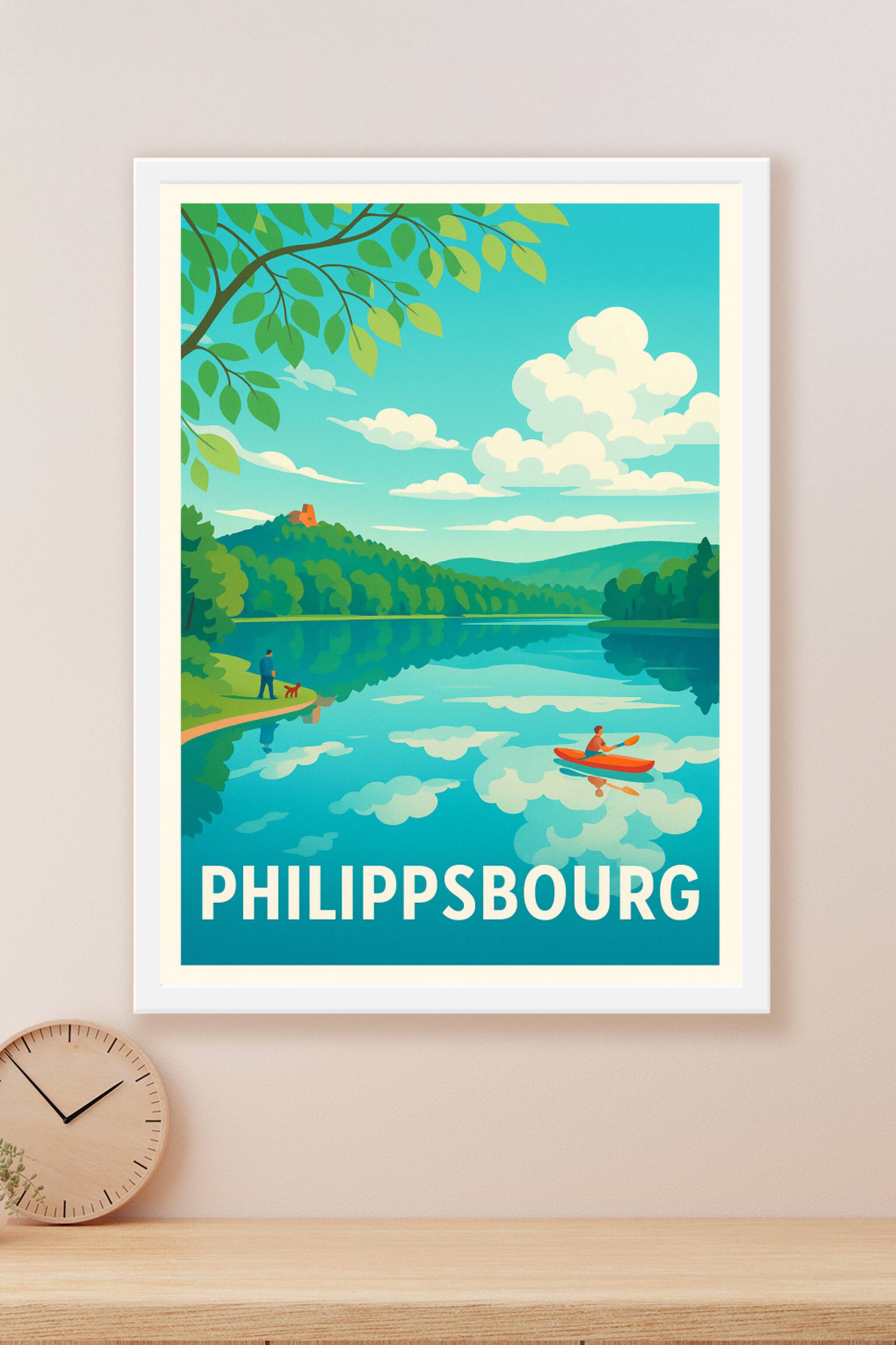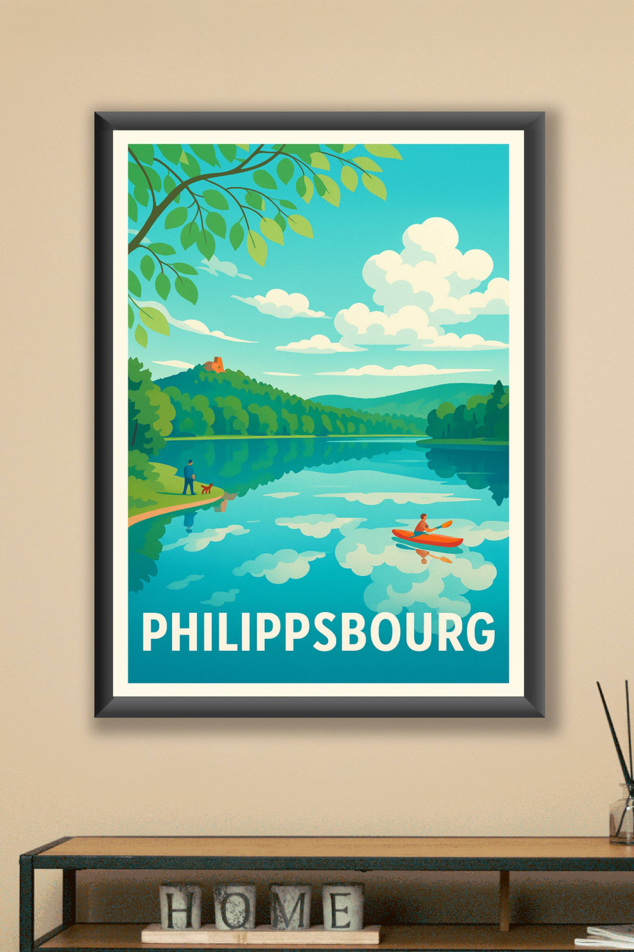Découvrez la sérénité de Philippsbourg avec cette affiche illustrée qui capture la quiétude d'un paysage naturel entre forêts verdoyantes et eaux c...