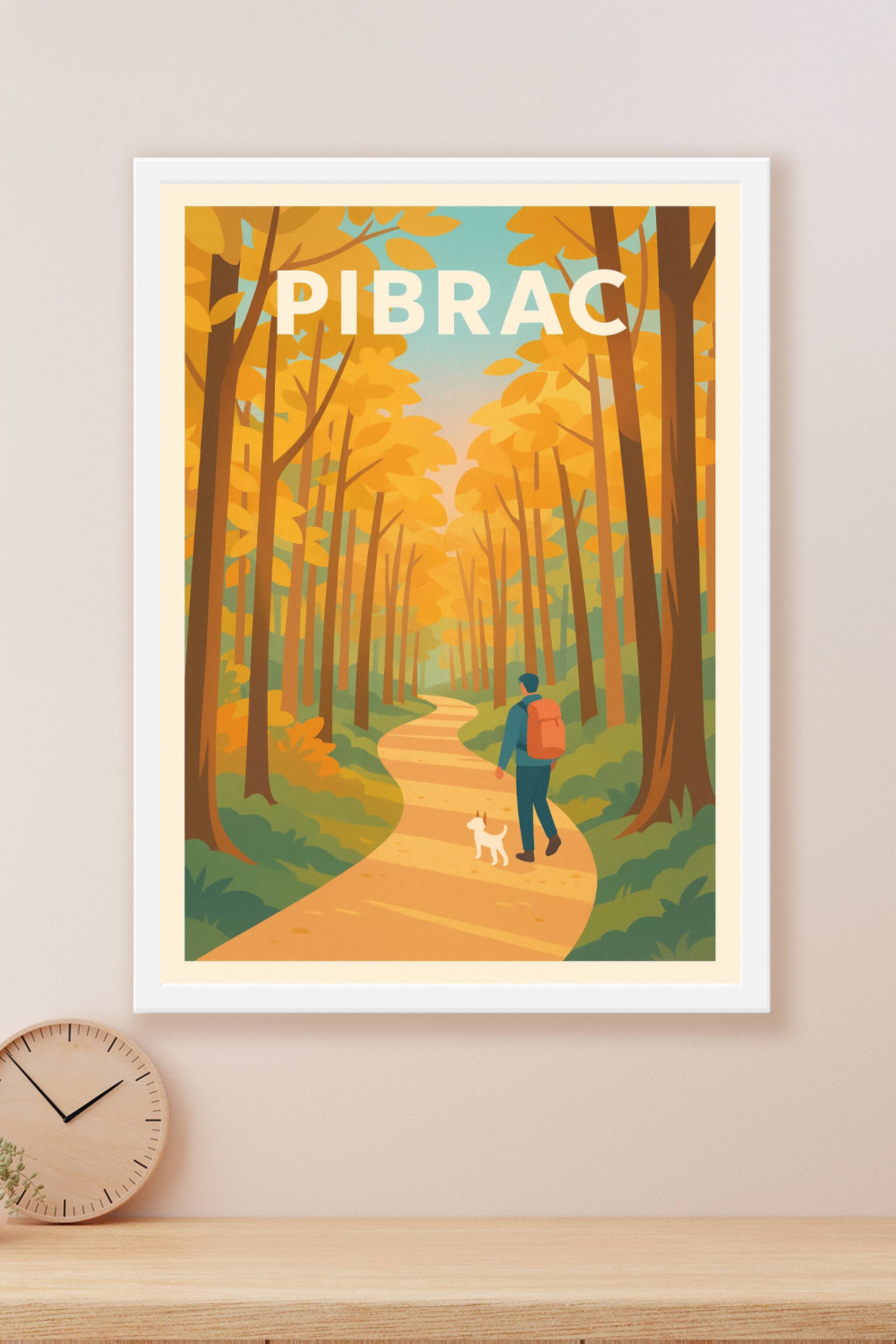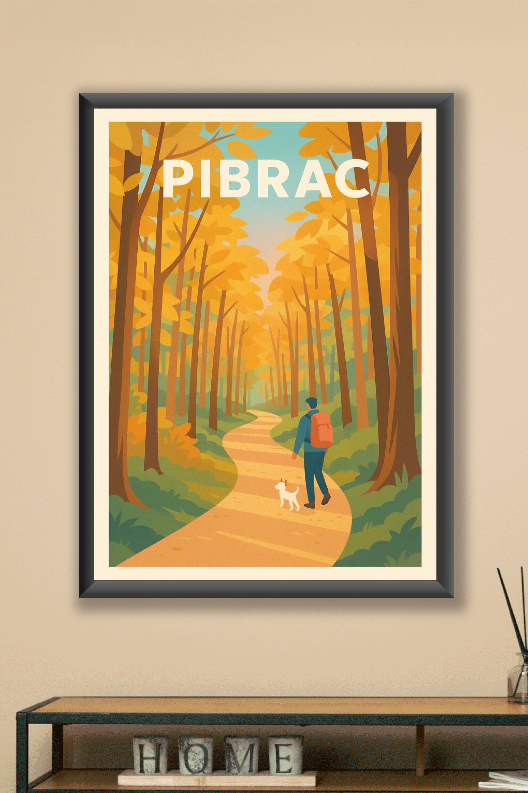 Découvrez la sérénité d'une balade en forêt aux couleurs chaudes de l'automne avec cette affiche illustrée mettant en scène un promeneur et son chien sur un chemin sinueux. L'ambiance apaisante et les teintes dorées capturent parfaitement l'esprit paisible de Pibrac en saison automnale. Ce poster est imprimé en tirage "Fine Art" sur papier 305g coton, garantissant une qualité d'impression supérieure et une durabilité optimale. Disponible en formats A1 à A4, avec ou sans cadre, cette affiche apportera une touche naturelle et chaleureuse à votre décoration intérieure. Une création élégante, idéale pour offrir ou pour sublimer votre espace de vie avec une ambiance relaxante et authentique.