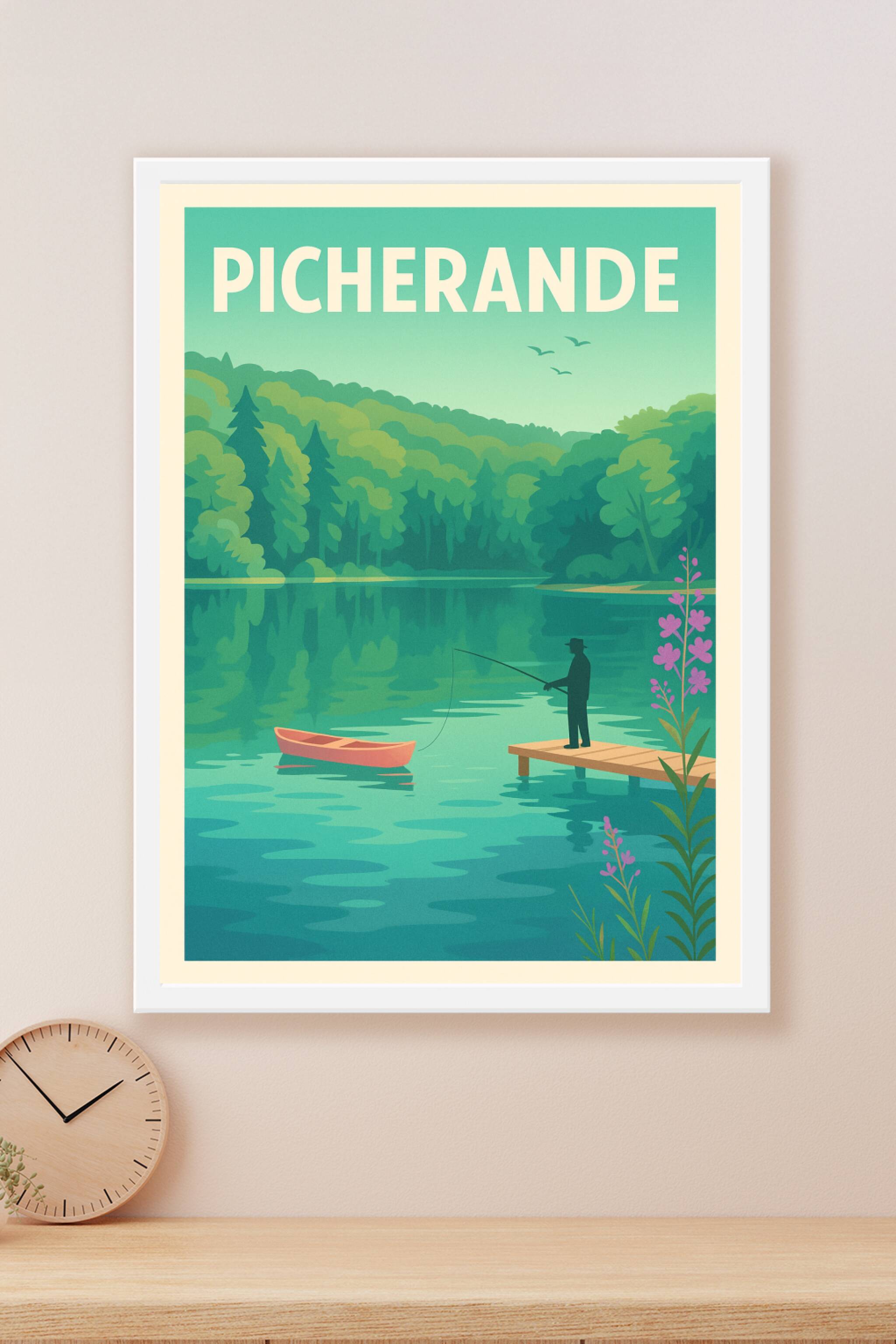 Découvrez la quiétude de Picherande avec cette affiche illustrant un pêcheur au bord d'un lac serein, entouré de forêts verdoyantes. Ce poster évoq...