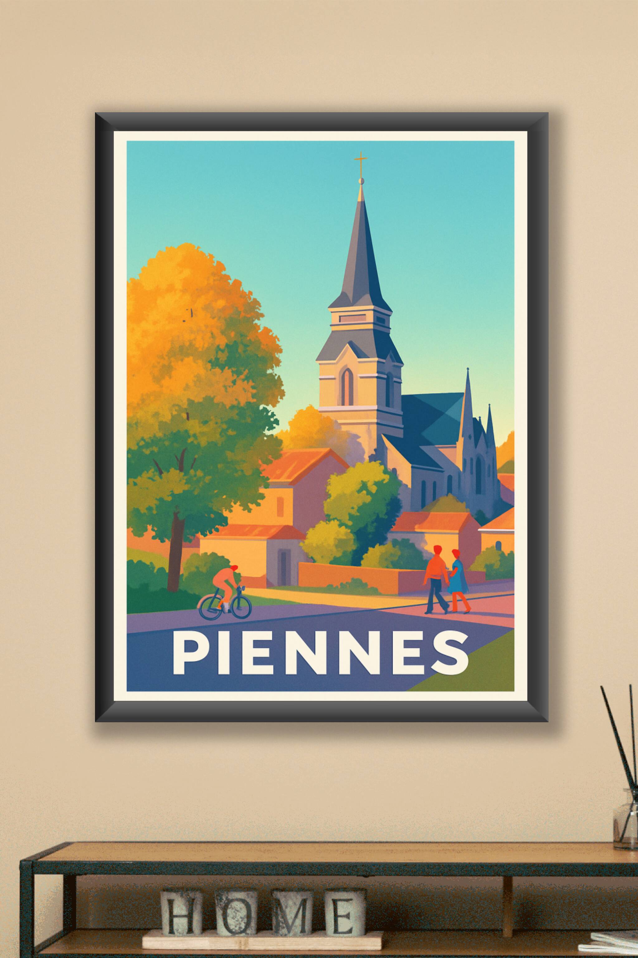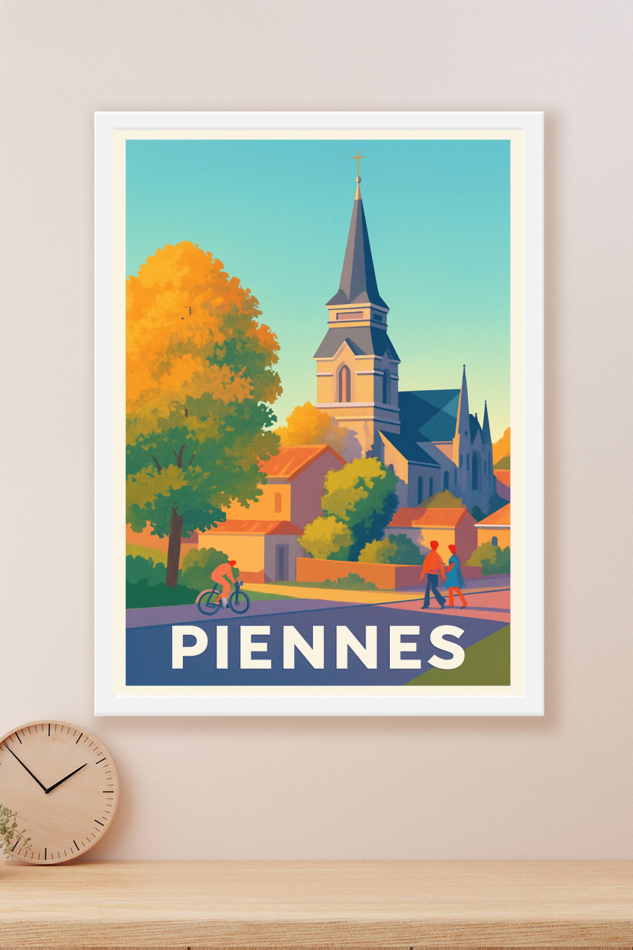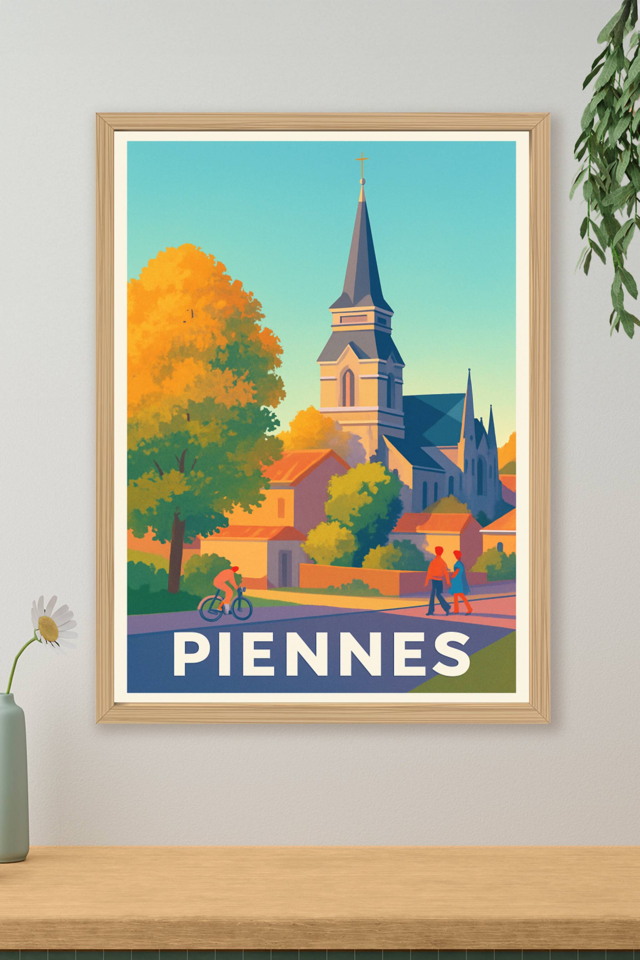 Découvrez le charme authentique de Piennes avec cette affiche illustrée mettant en avant l'élégante église dominée par son clocher et l'ambiance pa...