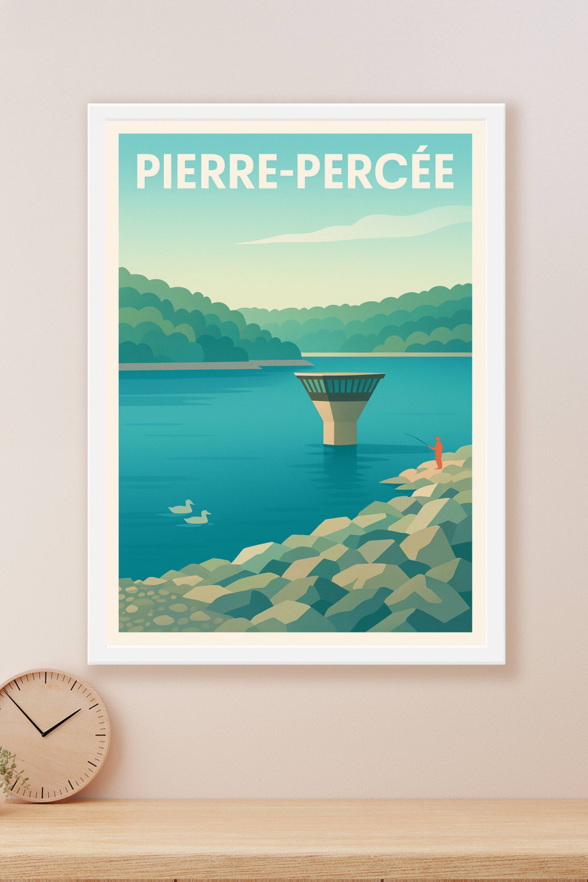 Découvrez la tranquillité et le charme naturel de Pierre-Percée avec cette affiche illustrée mettant en scène un paysage apaisant au bord du lac. L...