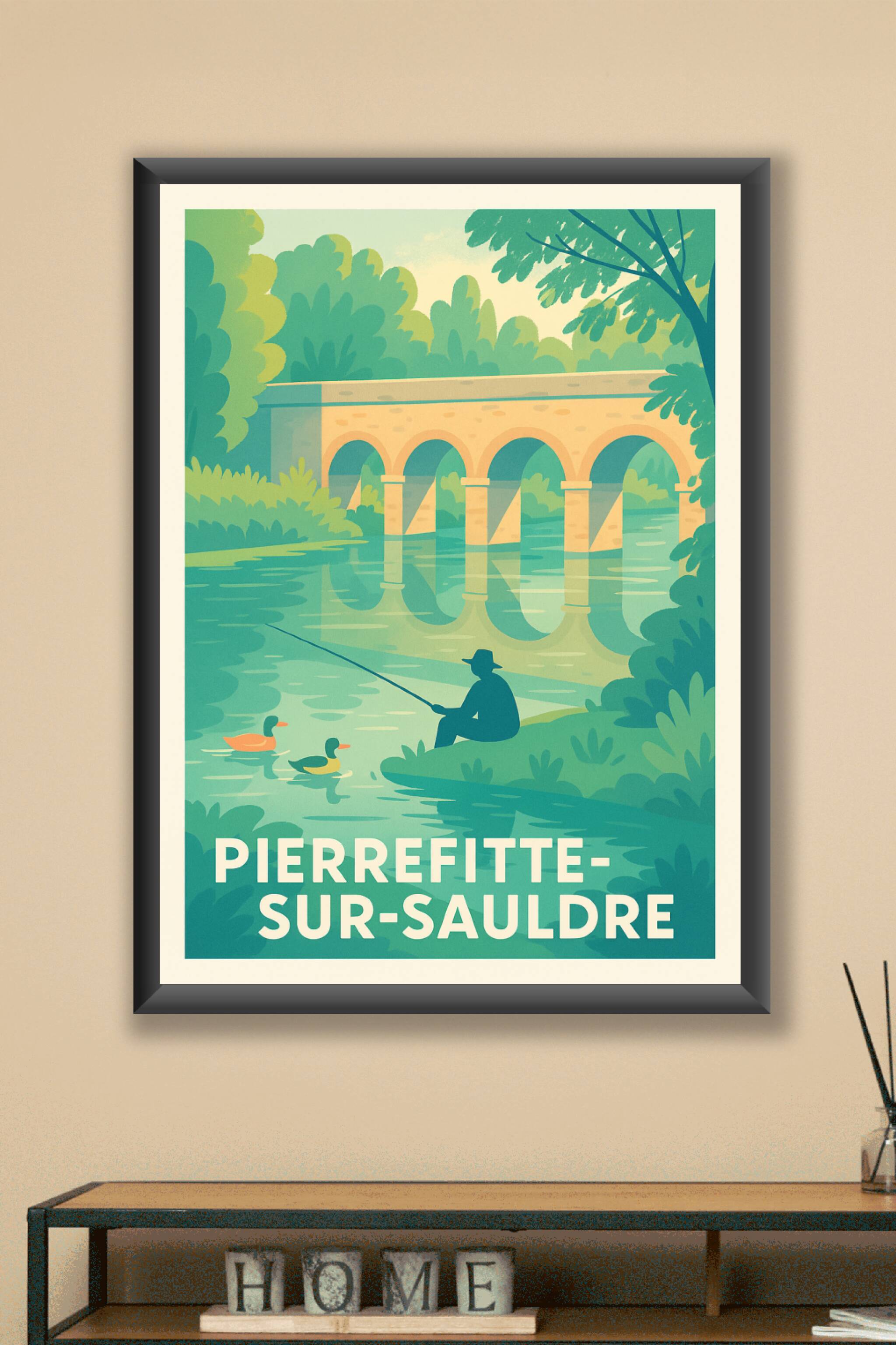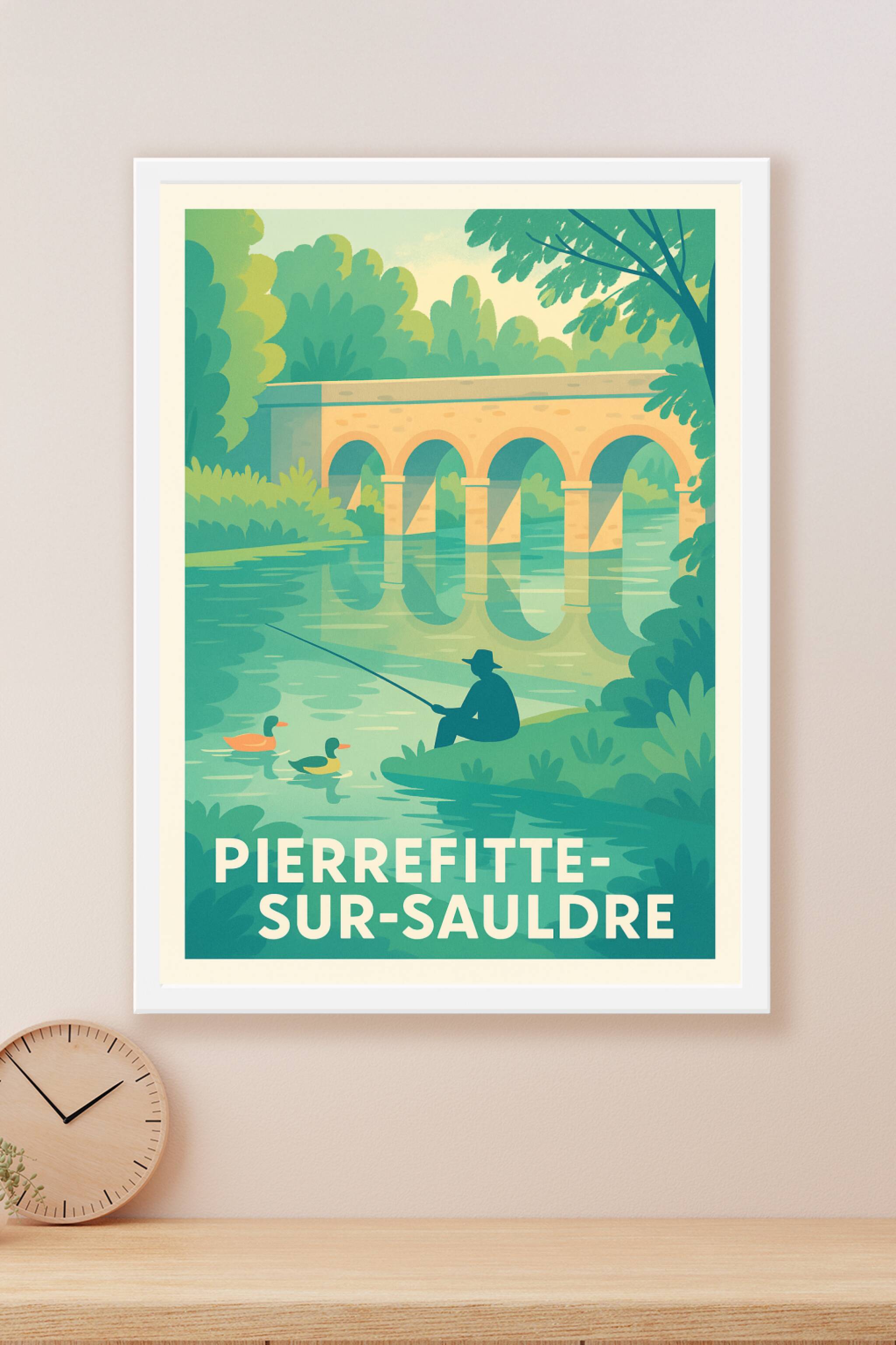 Découvrez la quiétude de Pierrefitte-sur-Sauldre à travers cette affiche illustrant un pêcheur paisible au bord de l'eau, sous un pont ancien, ento...