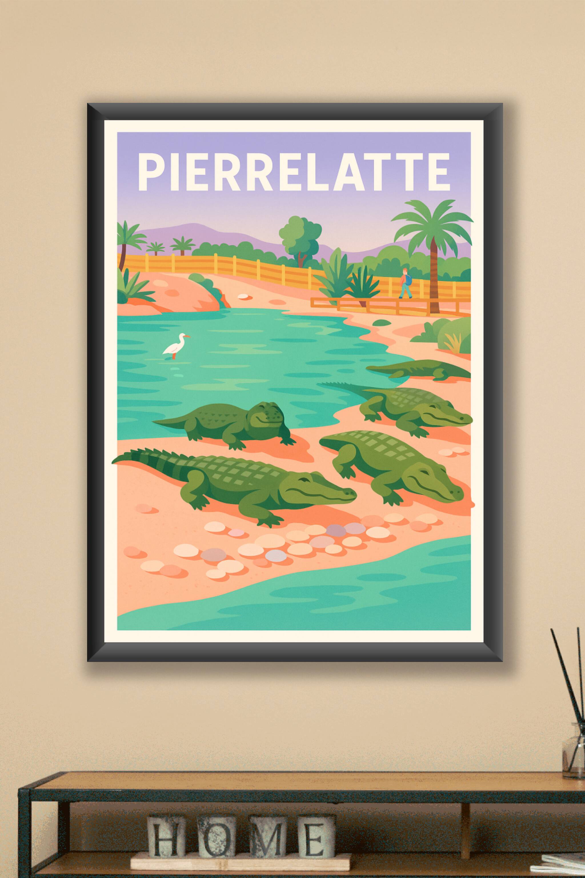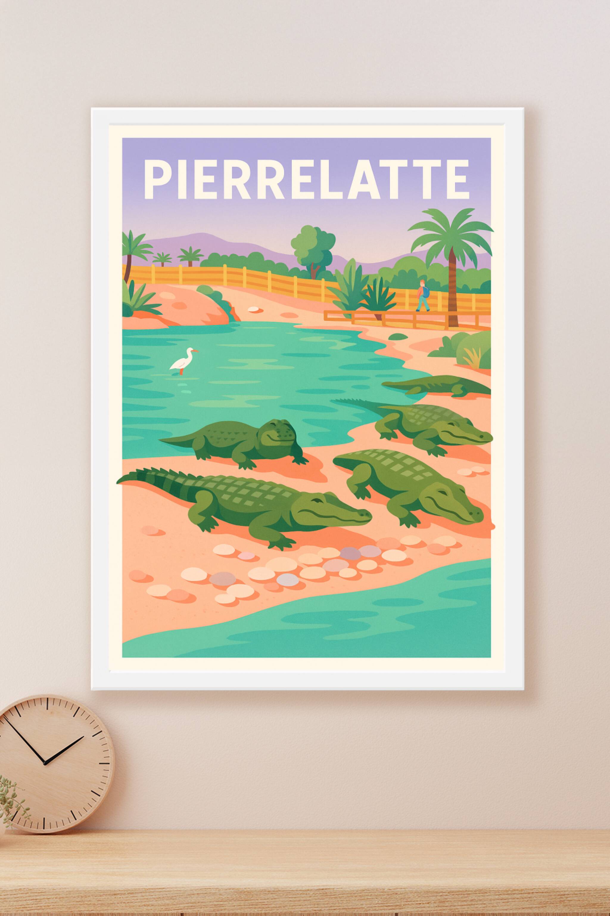 Découvrez la douceur de la nature autour de Pierrelatte avec cette affiche illustrée aux tons pastel mettant en scène des crocodiles au bord d'un é...