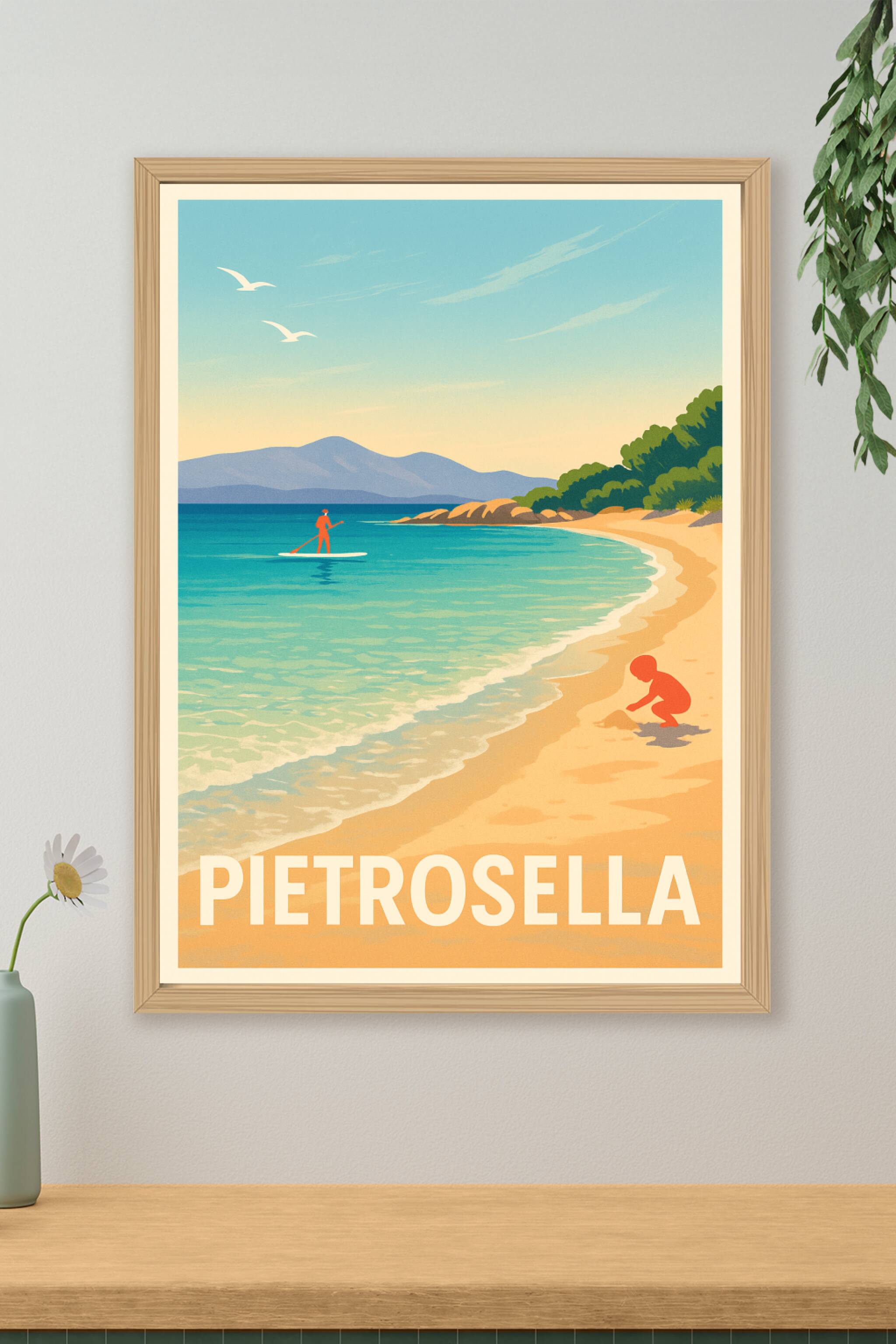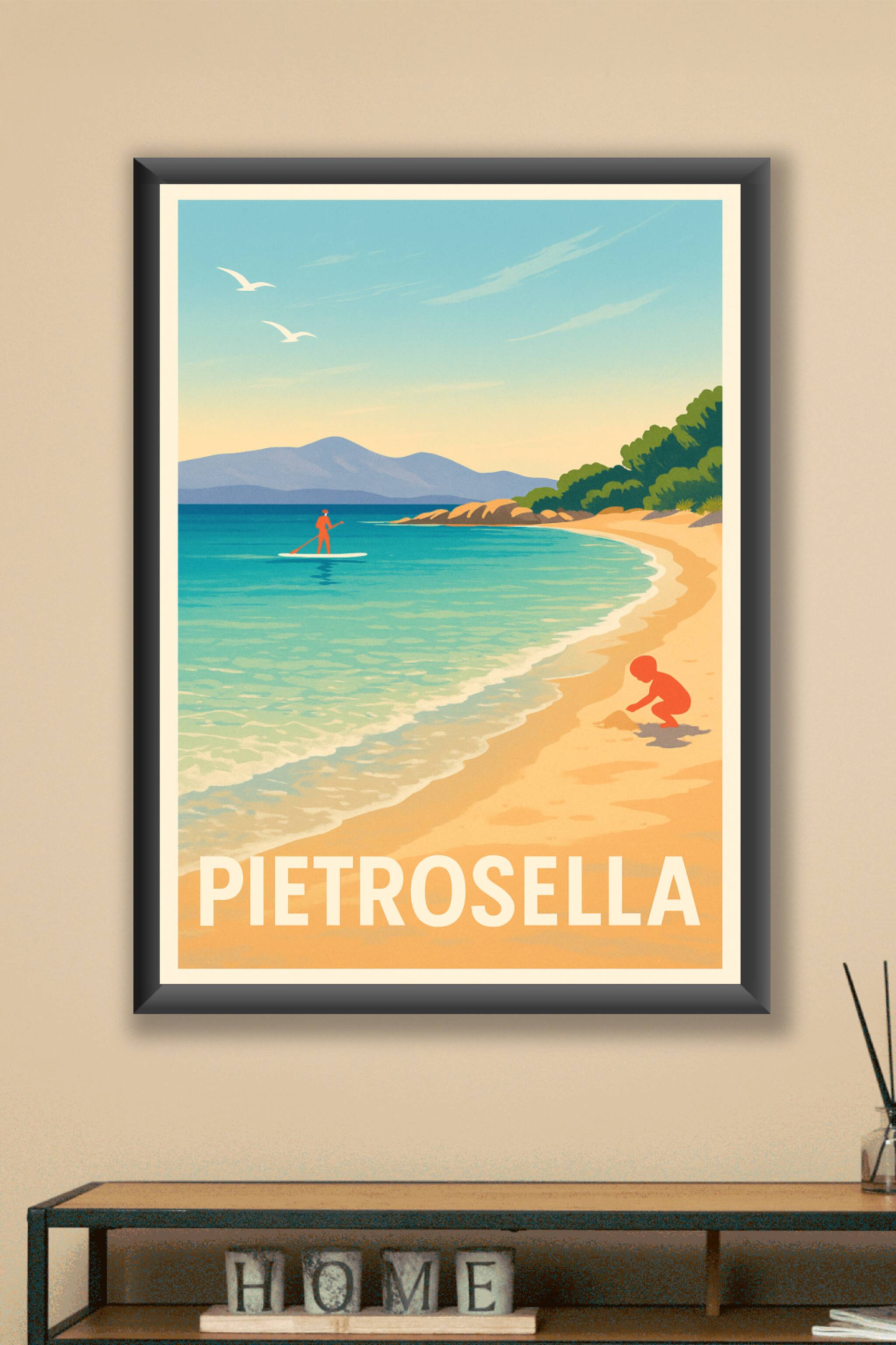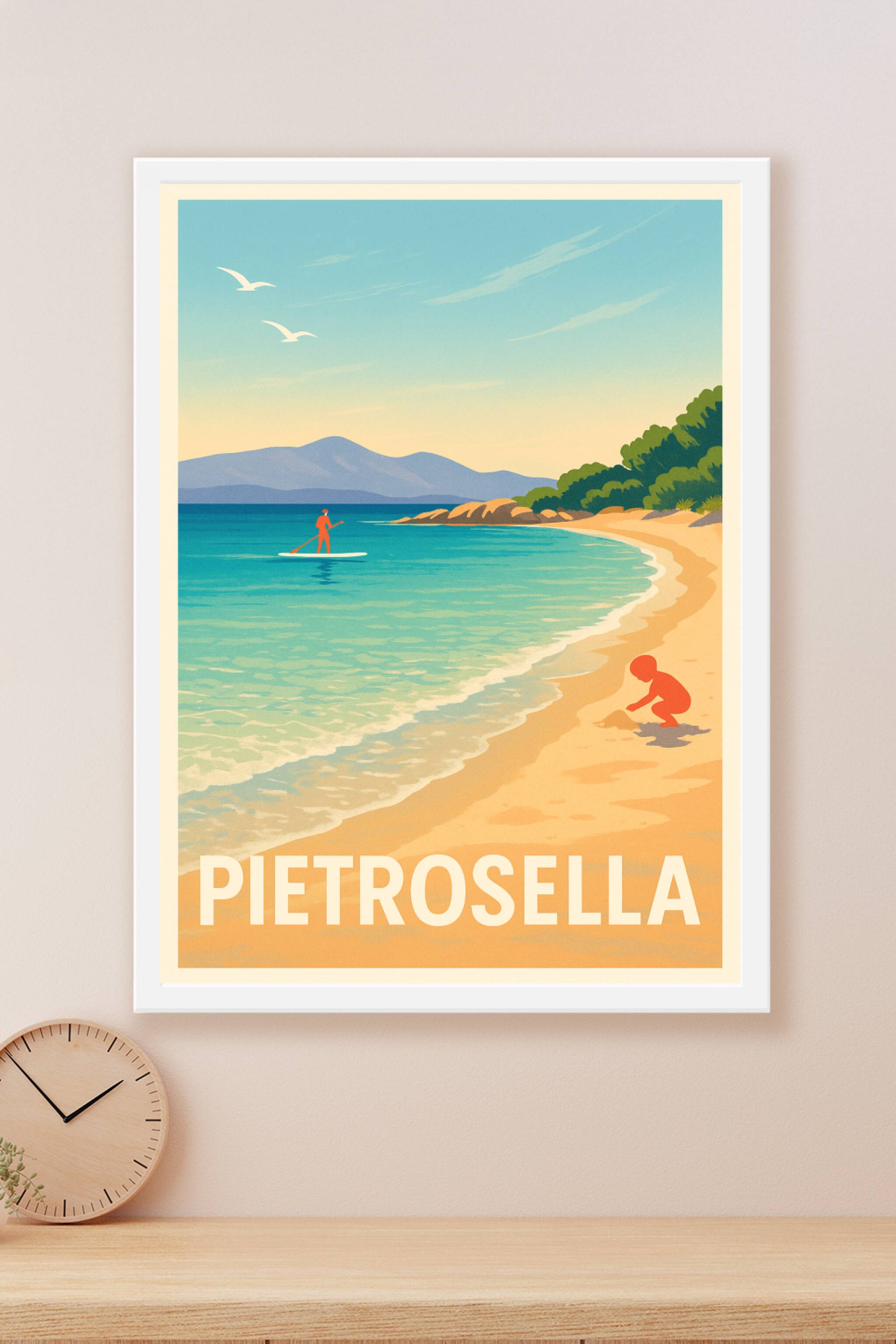 Laissez-vous transporter sur les rivages idylliques de Pietrosella avec cette affiche vintage au charme doux et apaisant. Cette illustration met en...