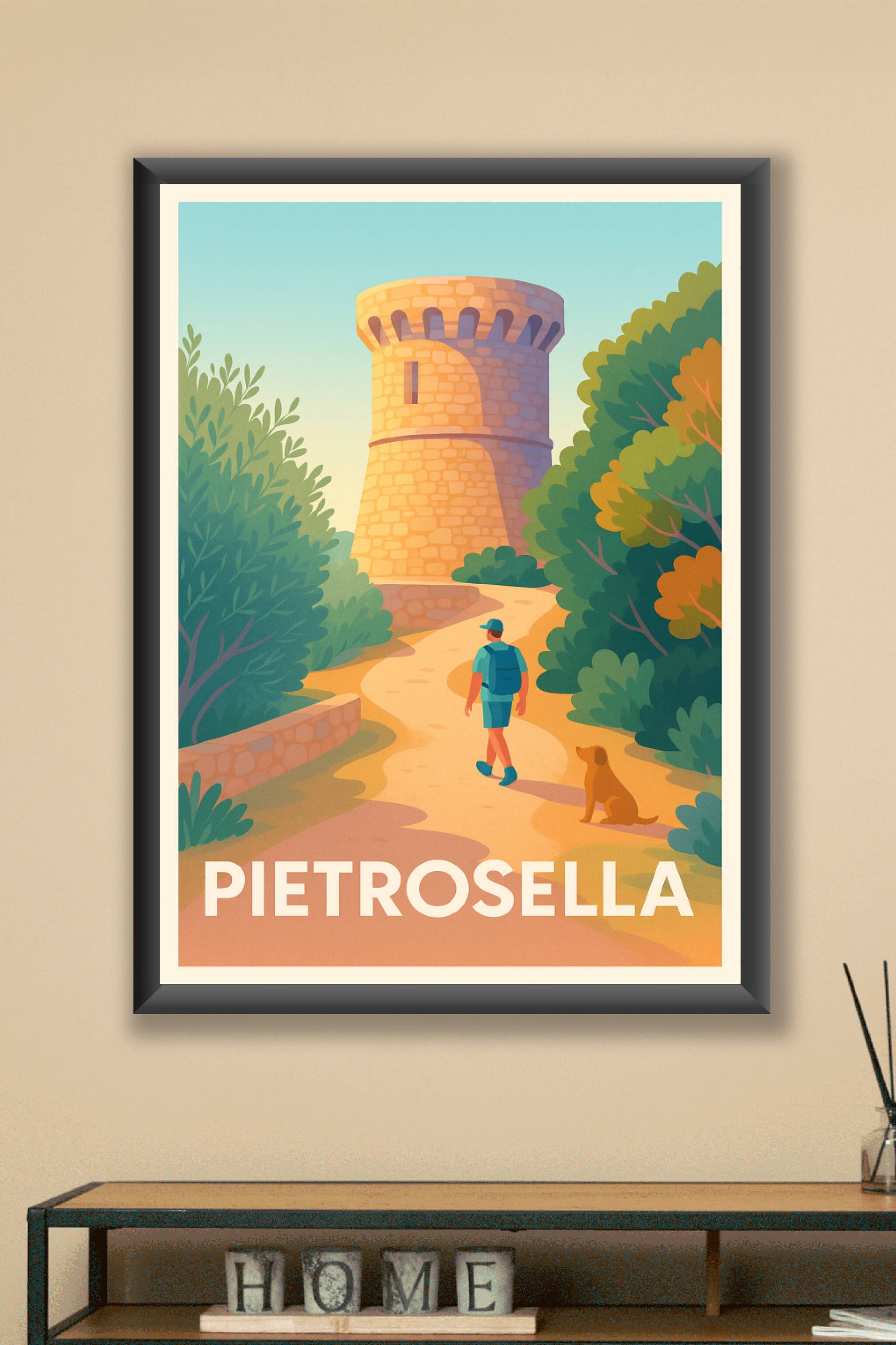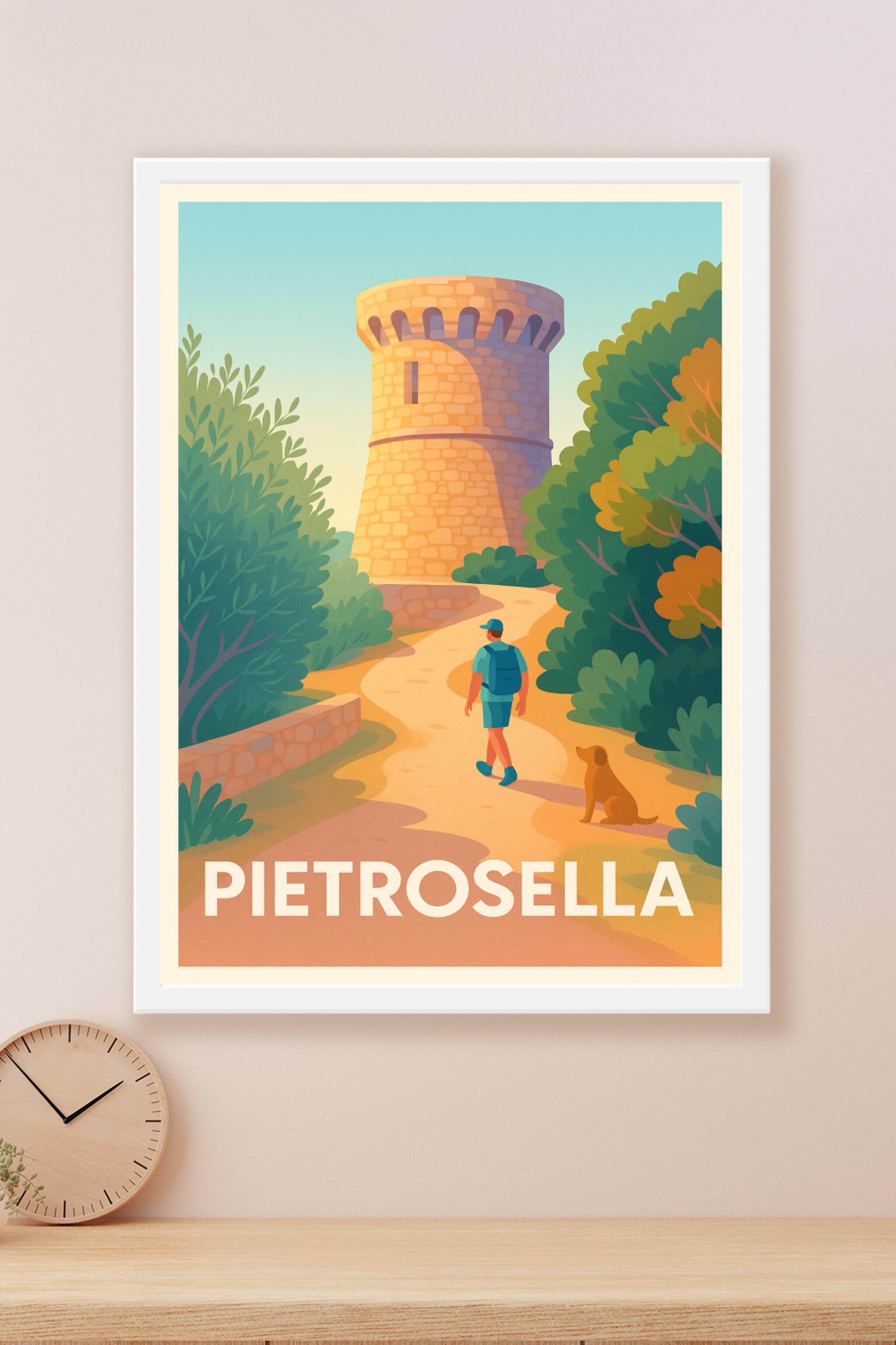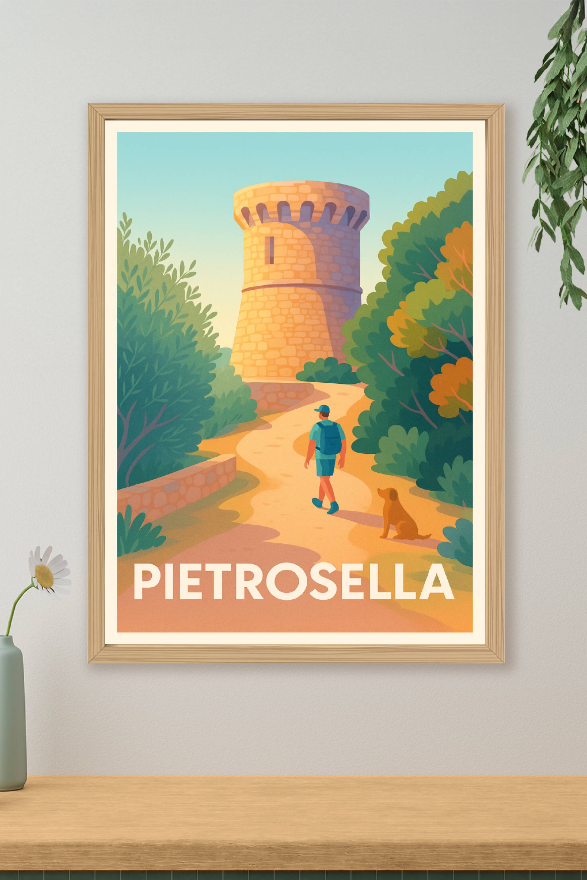 Découvrez la douceur de vivre corse avec cette affiche illustrant une balade paisible vers la tour emblématique de Pietrosella, entourée de verdure...
