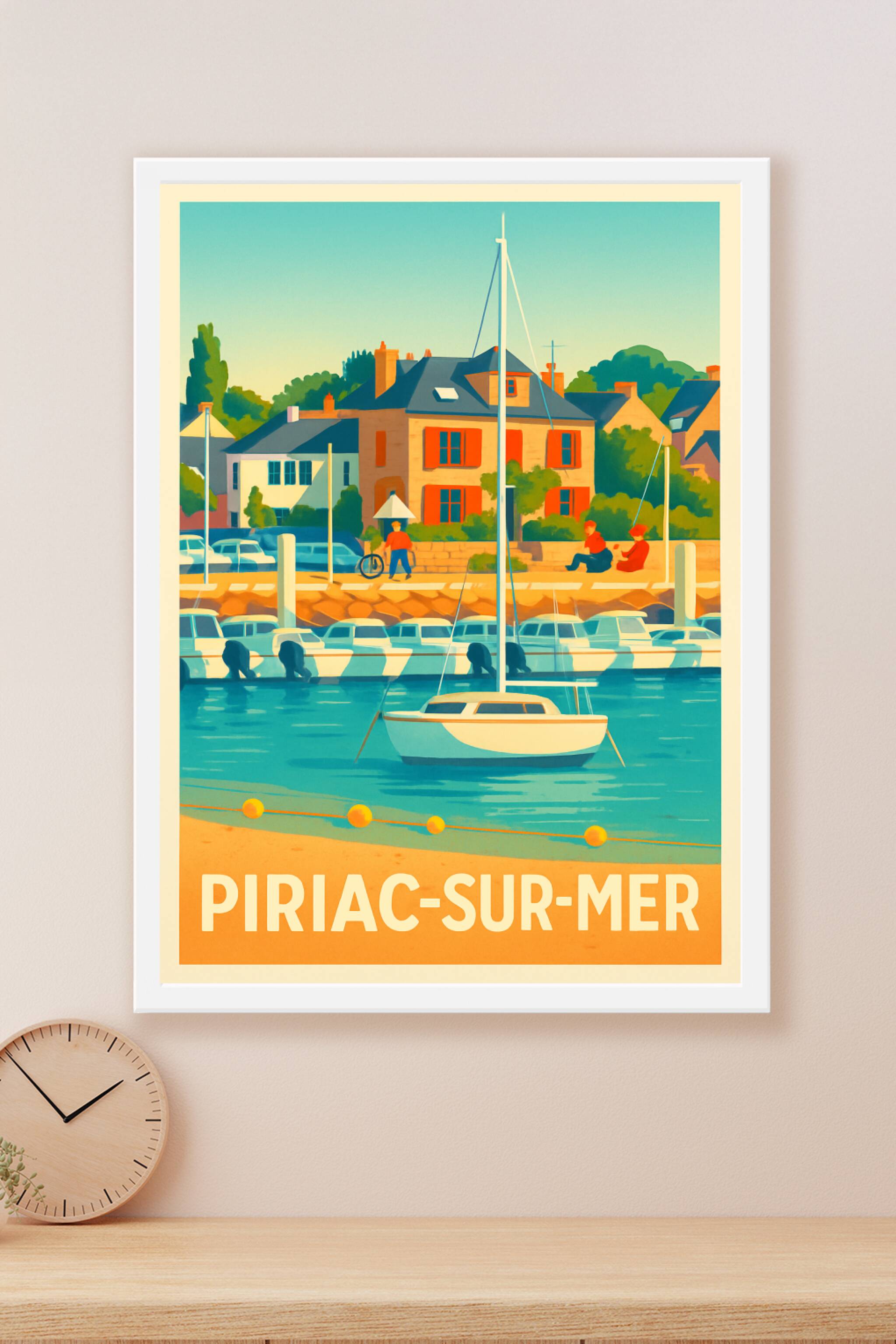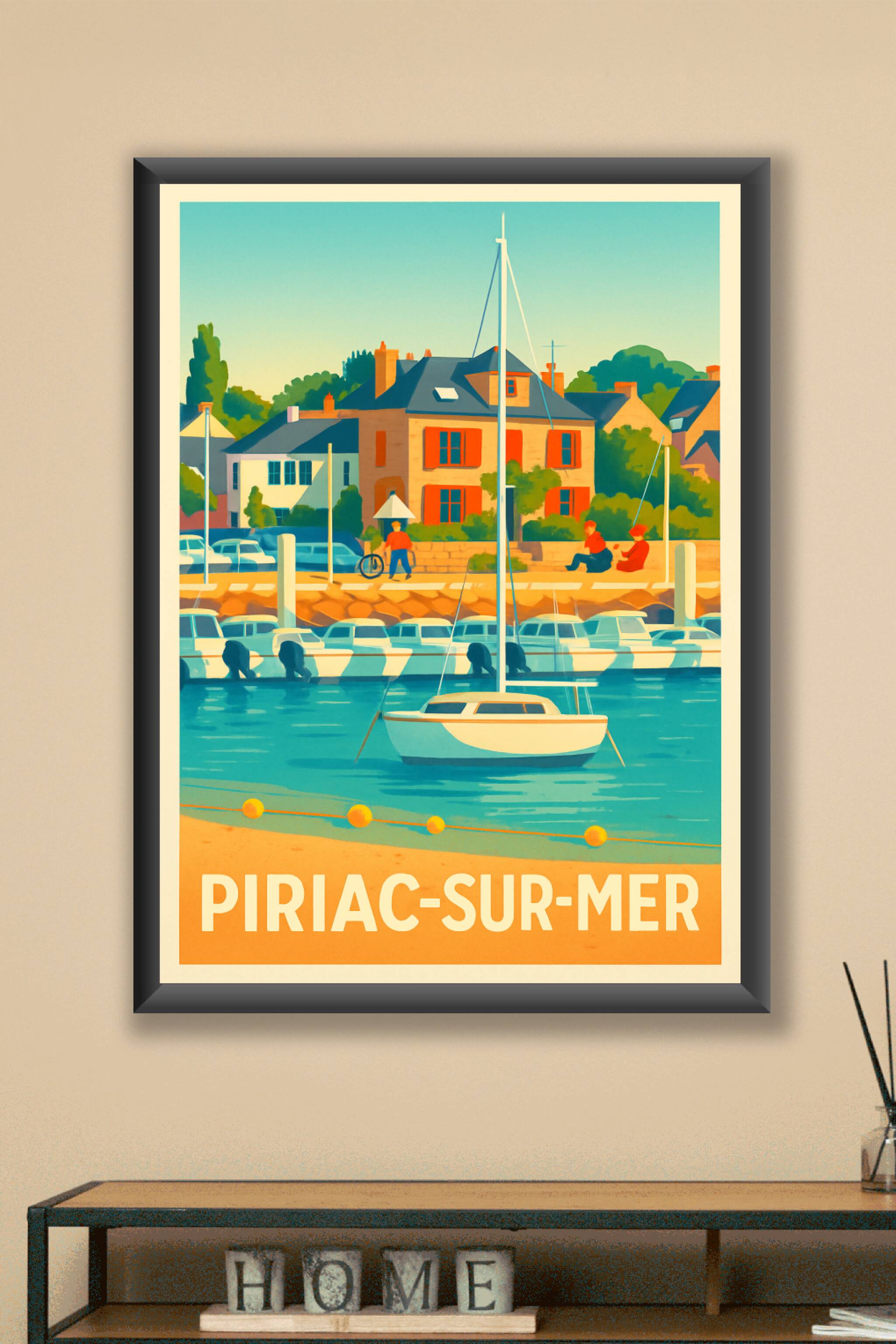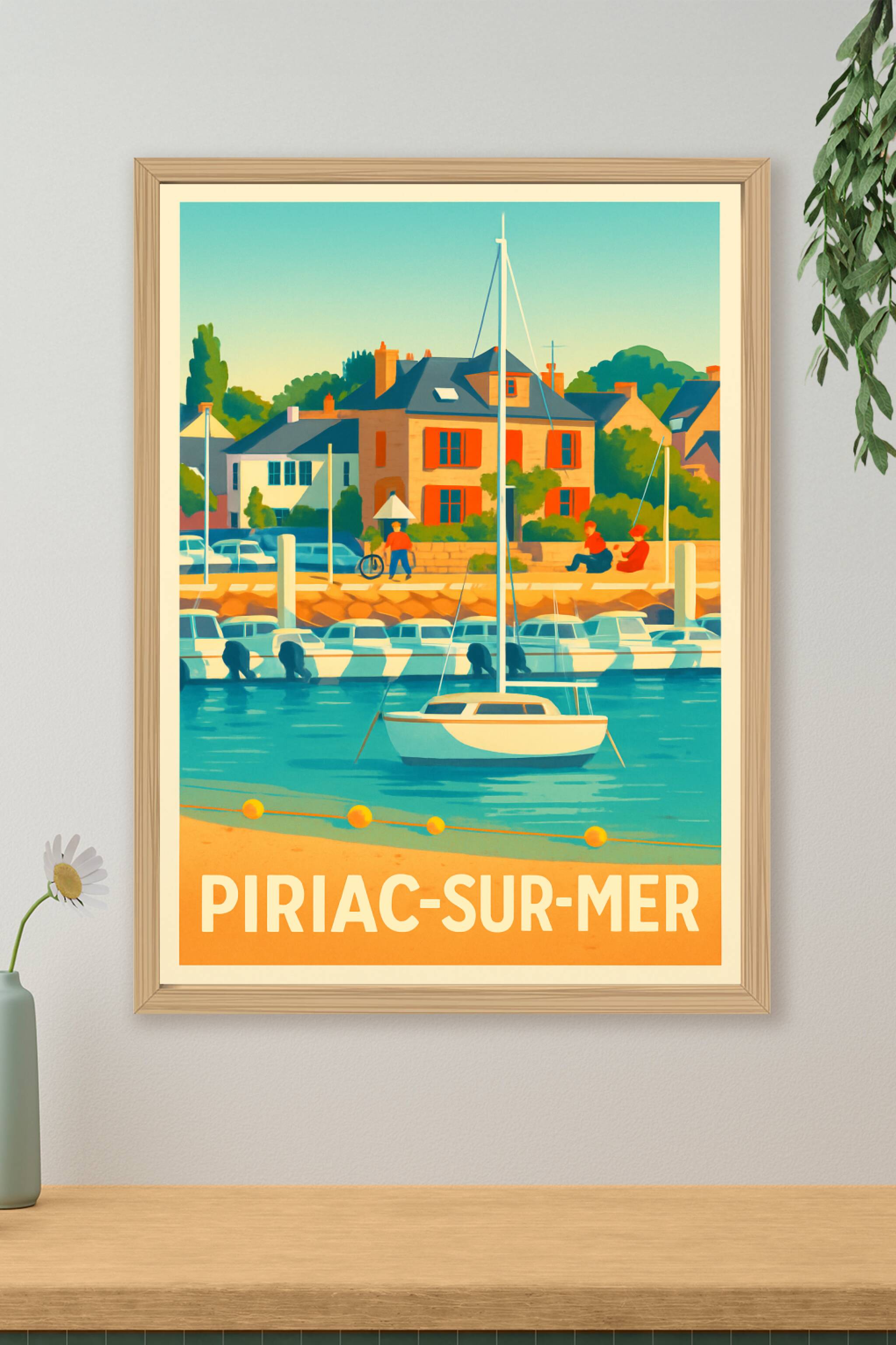 Découvrez l'atmosphère paisible et colorée de Piriac-sur-Mer avec cette affiche au style vintage qui met en scène un voilier dans le port et les ma...