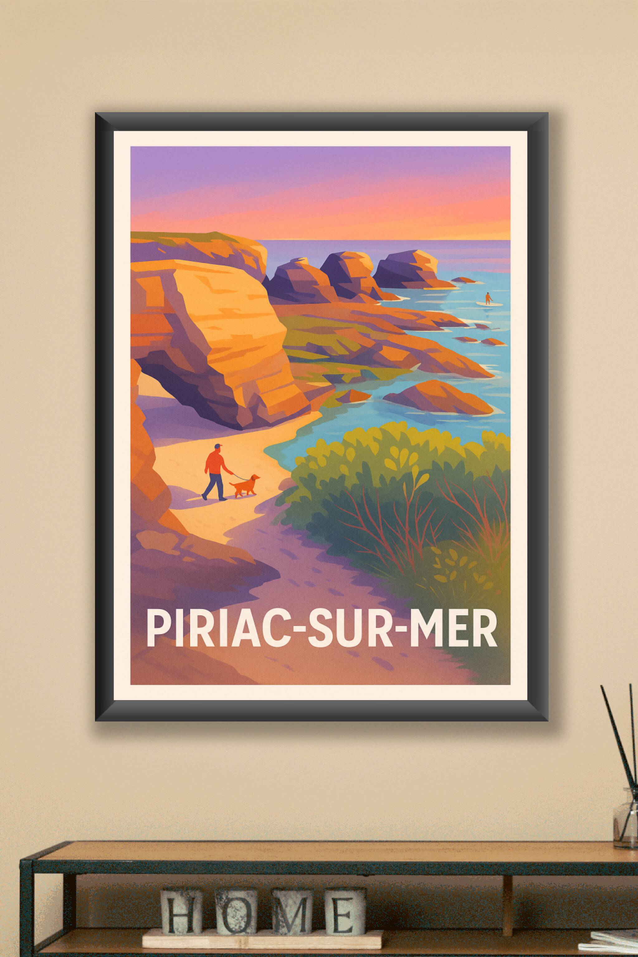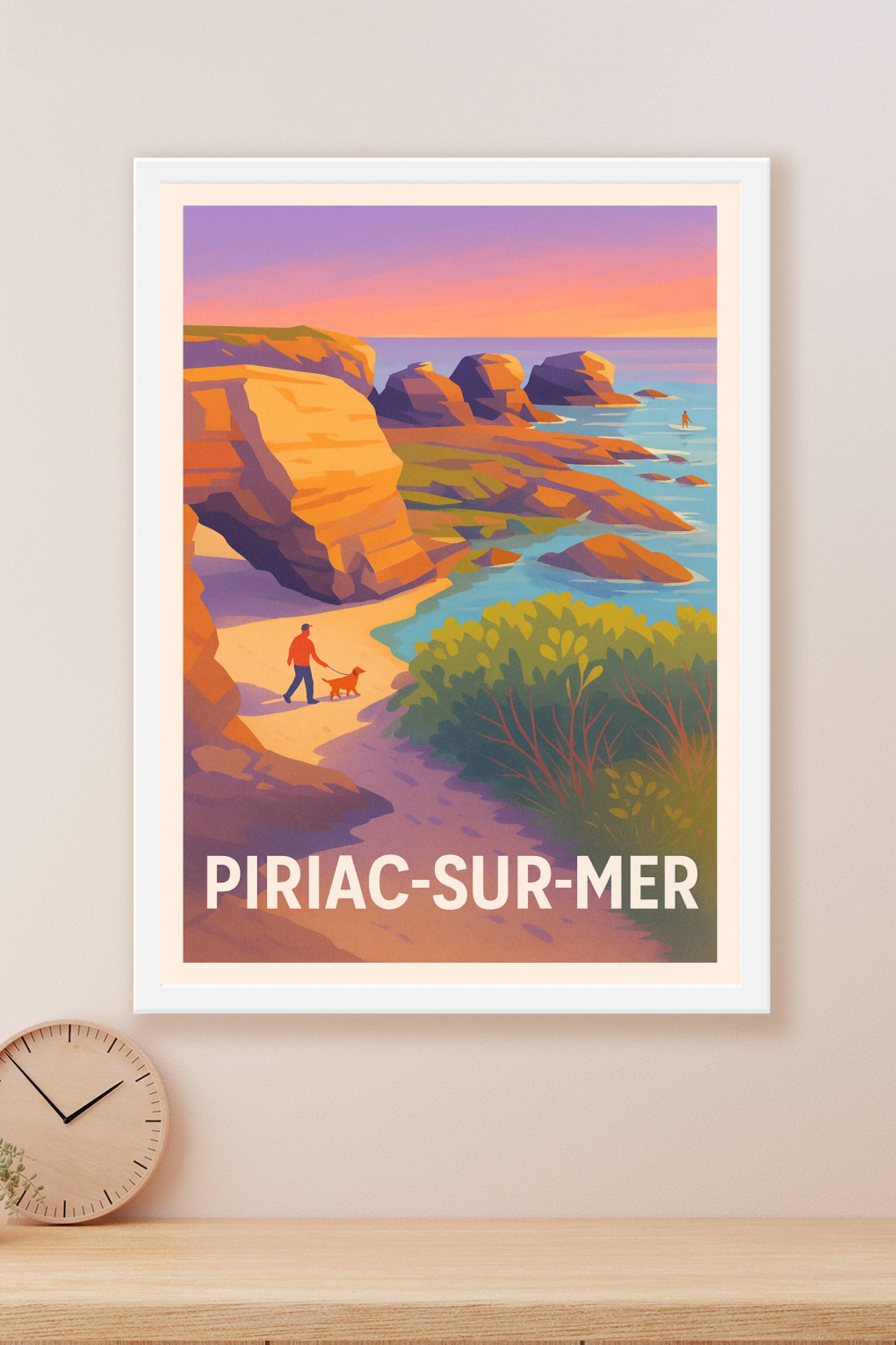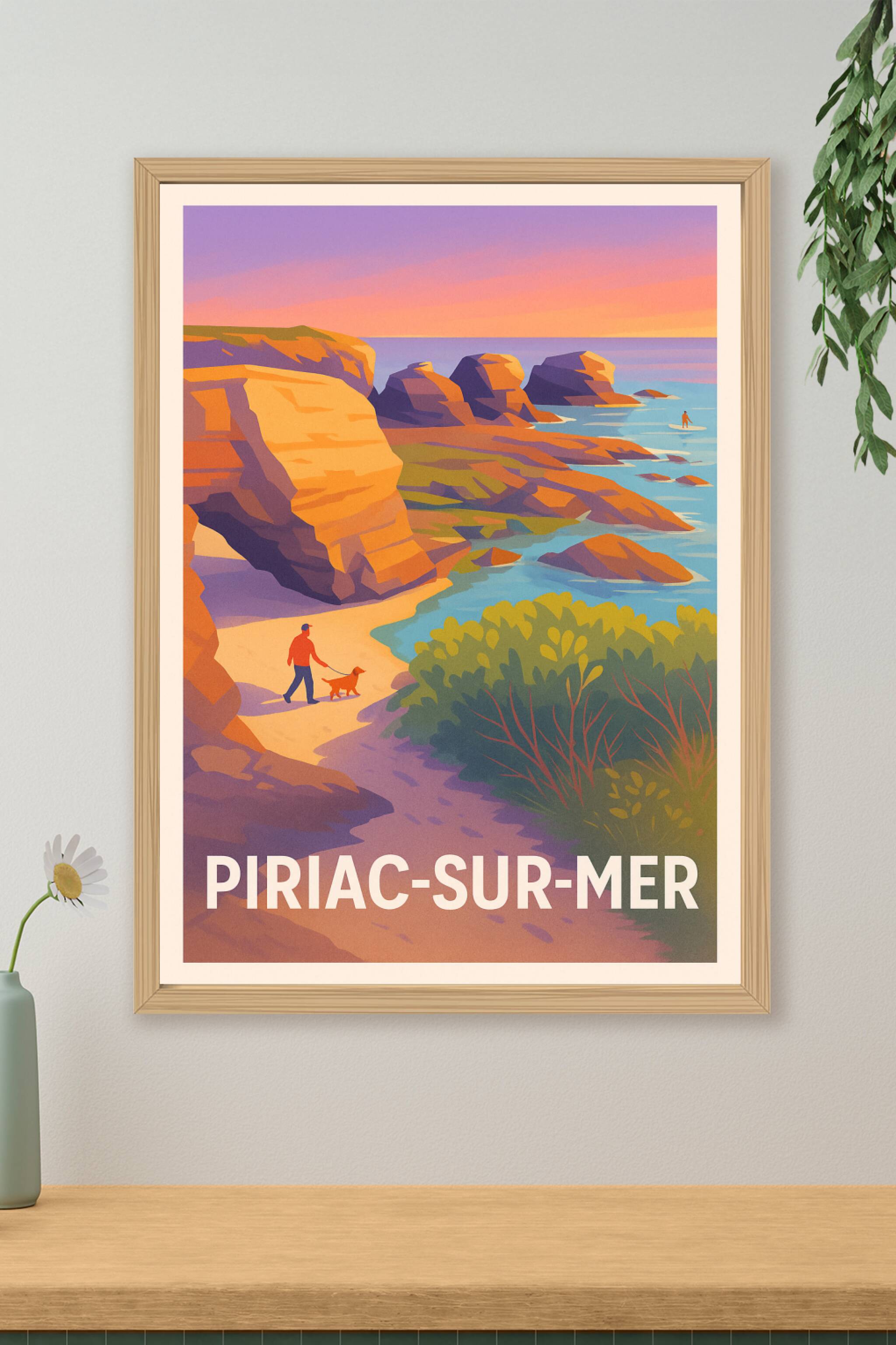 Découvrez la beauté saisissante des paysages côtiers de Piriac-sur-Mer avec cette affiche illustrée aux teintes chaudes du coucher de soleil. Une s...