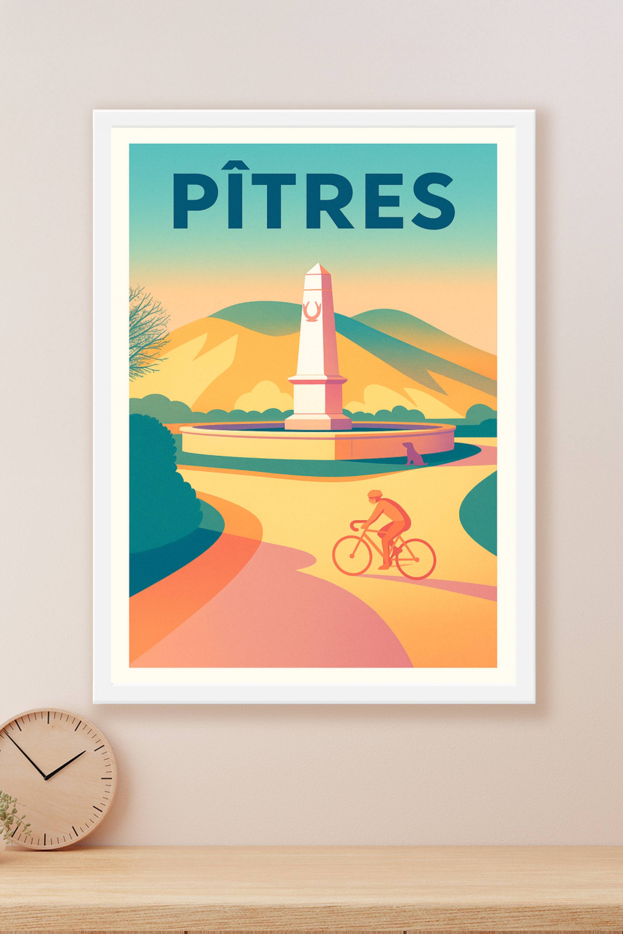 Découvrez cette affiche illustrée mettant en scène une scène paisible à Pîtres, avec son obélisque emblématique et un cycliste en pleine balade sou...