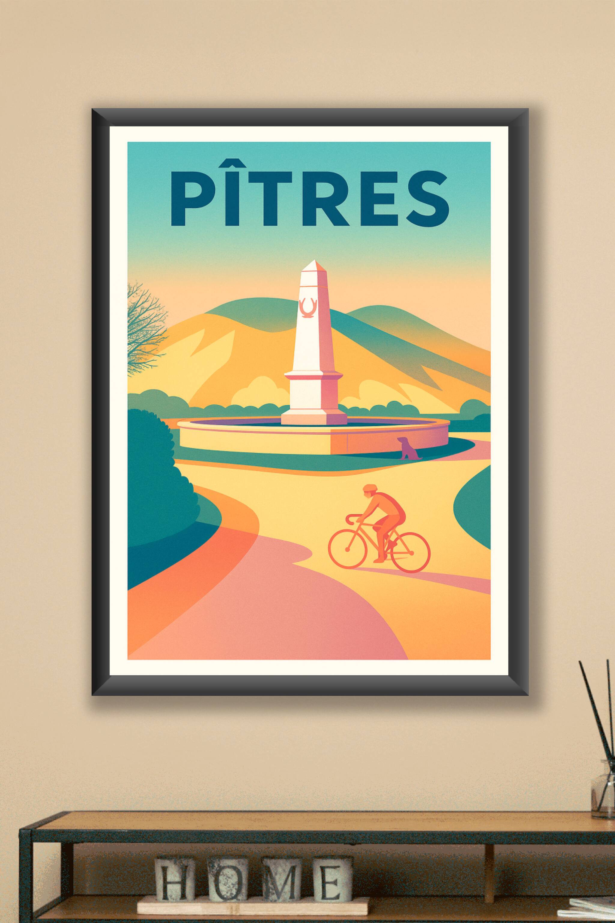 Découvrez cette affiche illustrée mettant en scène une scène paisible à Pîtres, avec son obélisque emblématique et un cycliste en pleine balade sous une lumière douce et colorée. Ce poster capture l'esprit tranquille et naturel de la ville, parfait pour embellir vos murs.Uniquement imprimée en tirage "Fine Art" sur papier 305g coton, cette affiche garantit une qualité d'impression exceptionnelle, aux couleurs vives et durables. Disponible du format A1 à A4, vous pouvez choisir votre préférences avec ou sans cadre pour une décoration intérieure raffinée. Apportez une touche d'art et de sérénité à votre intérieur ou offrez ce poster comme un souvenir élégant de Pîtres.