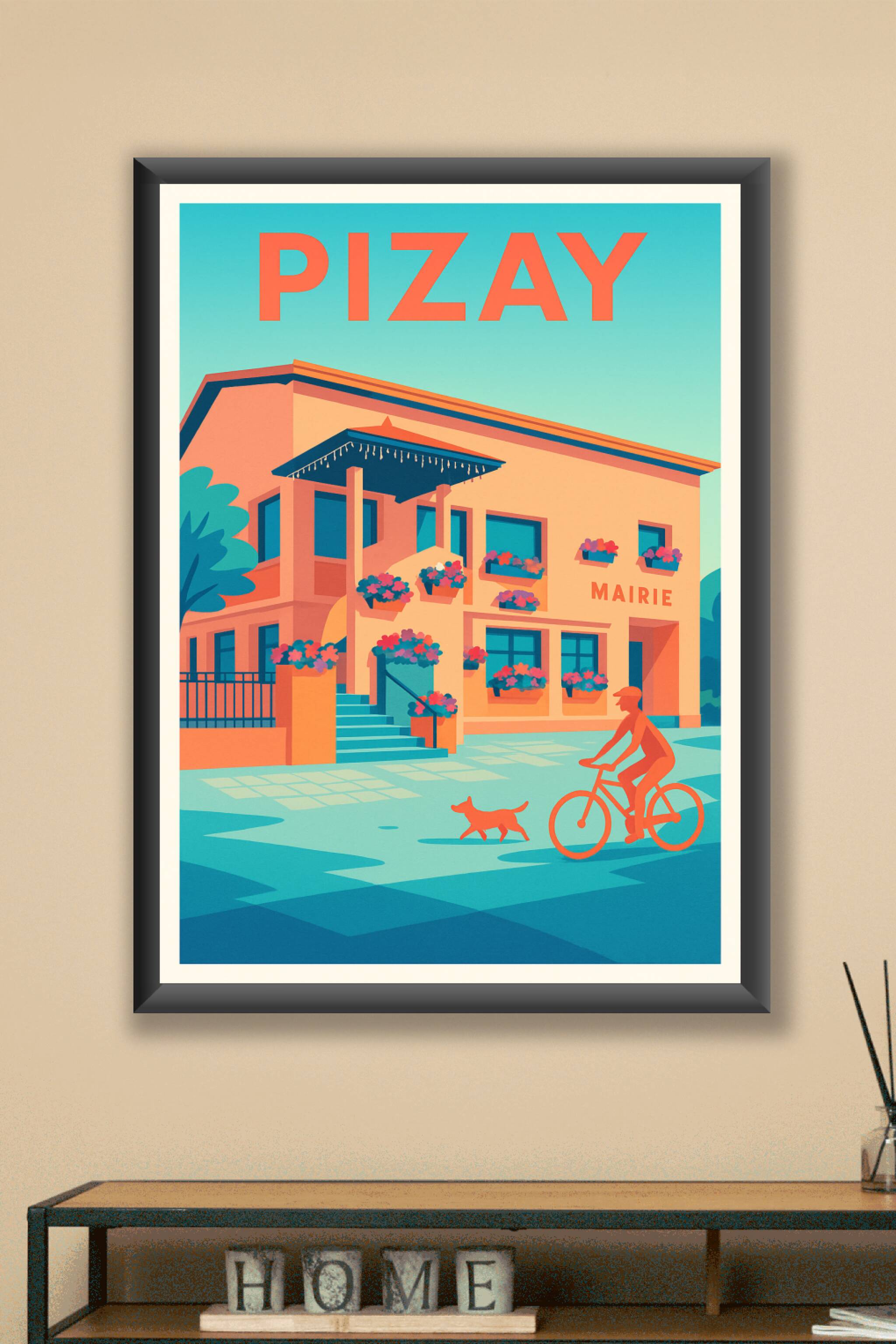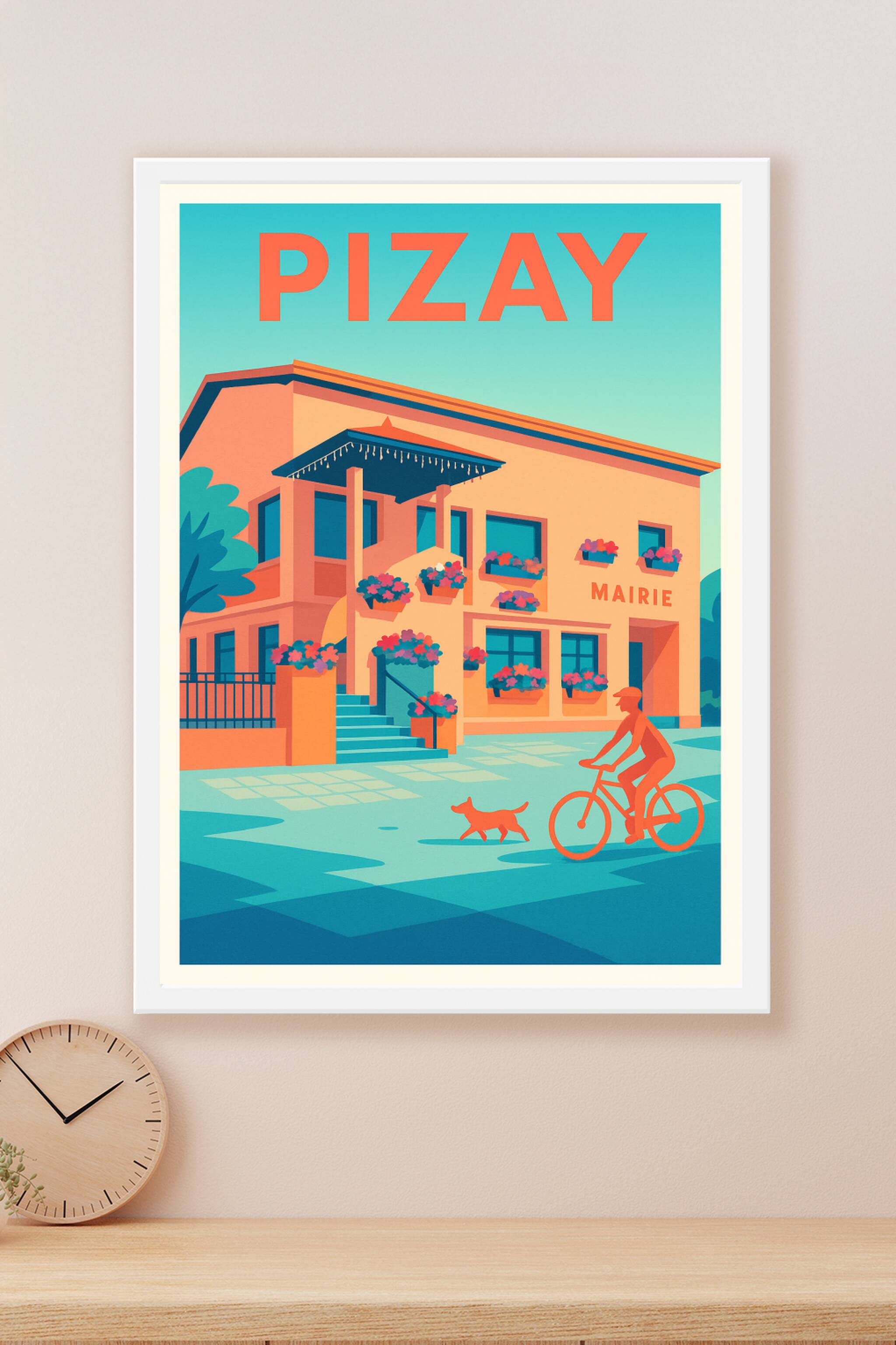 Découvrez l’atmosphère paisible et colorée de Pizay à travers cette affiche illustrée mettant en scène la mairie fleurie et une ambiance de village...
