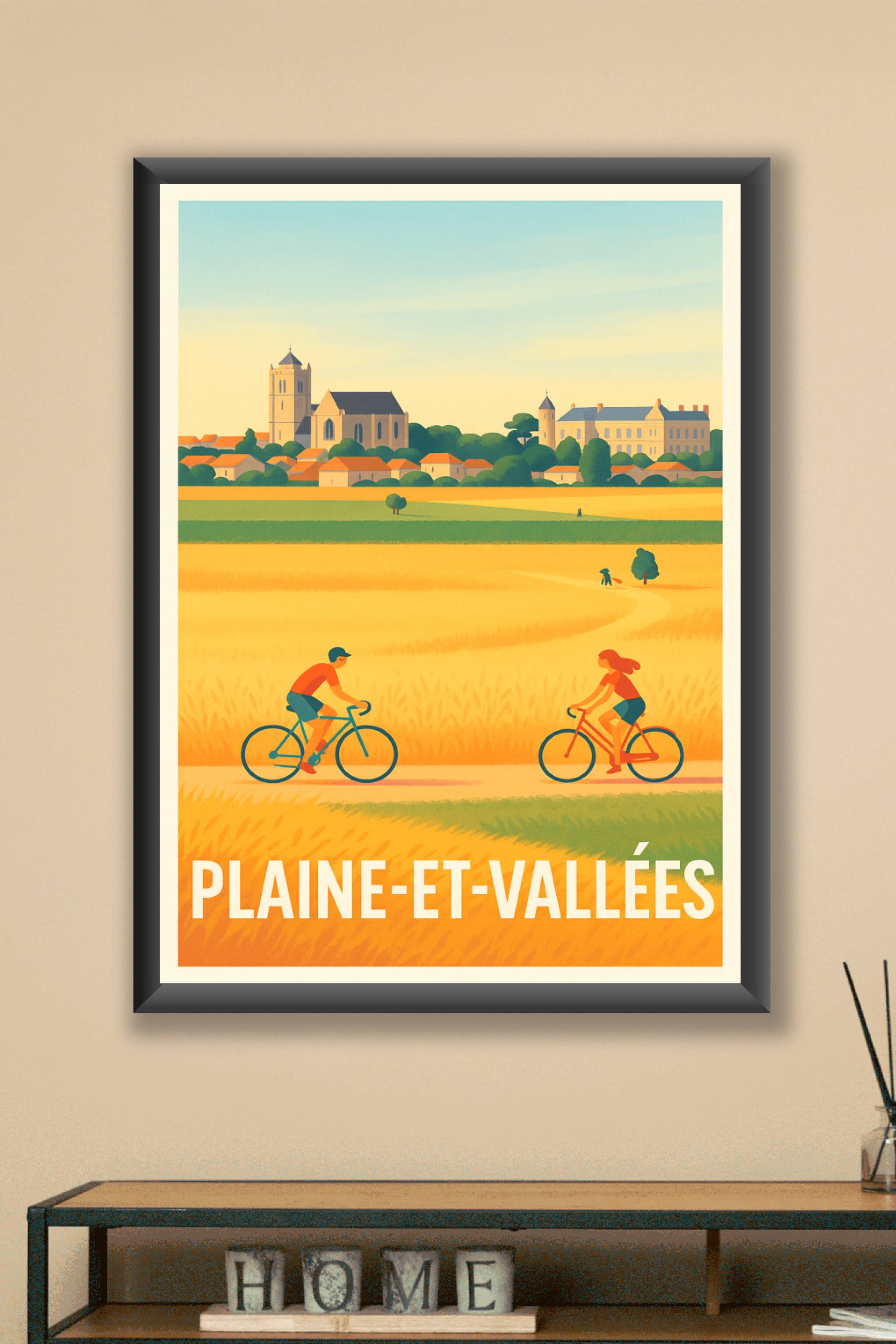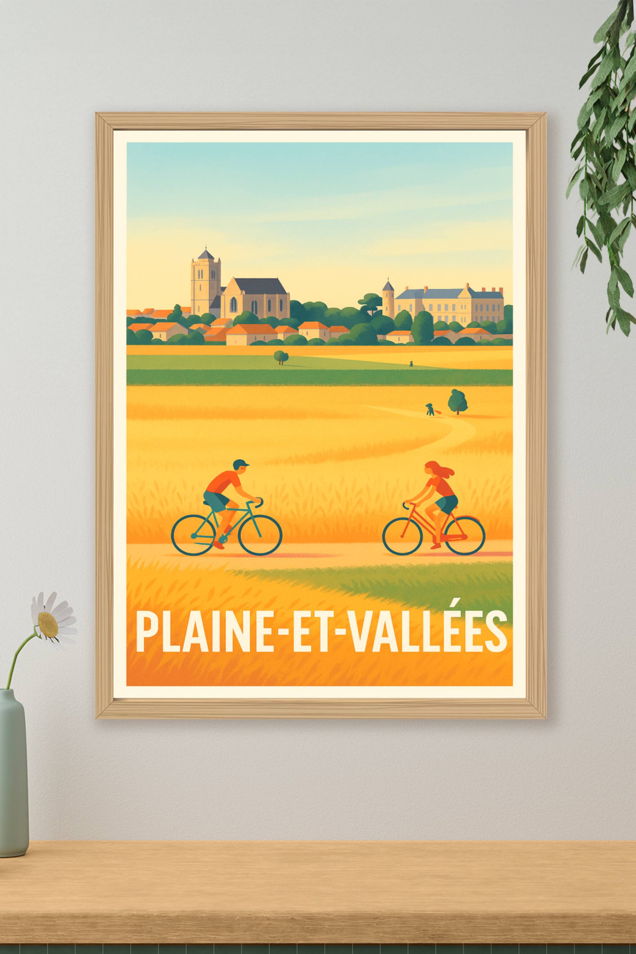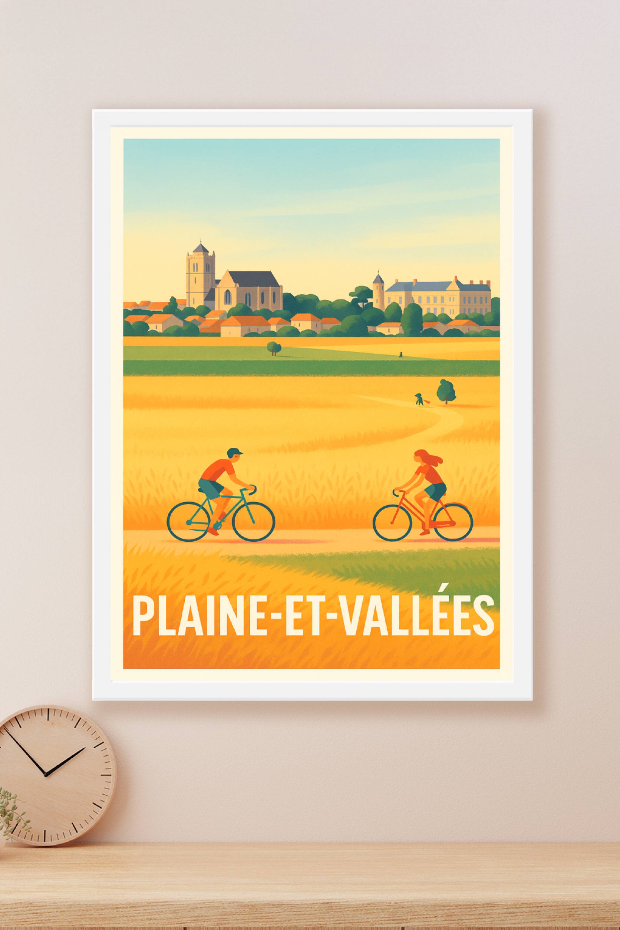 Découvrez la sérénité et la beauté bucolique de Plaine-et-Vallées avec cette affiche illustrée aux couleurs chaudes et apaisantes. Ce poster met en scène deux cyclistes traversant les champs dorés, avec le charme historique du village en arrière-plan. Imprimée en tirage "Fine Art" sur papier 305g coton, cette affiche vous garantit une qualité d'impression exceptionnelle, riche en détails et en nuances. Disponible en formats A1 à A4, avec ou sans cadre, elle s'adapte parfaitement à tous vos espaces de vie. Offrez-vous ou à vos proches ce poster de caractère, 100% fabriqué en France, pour sublimer votre décoration intérieure avec une touche artistiquement locale.