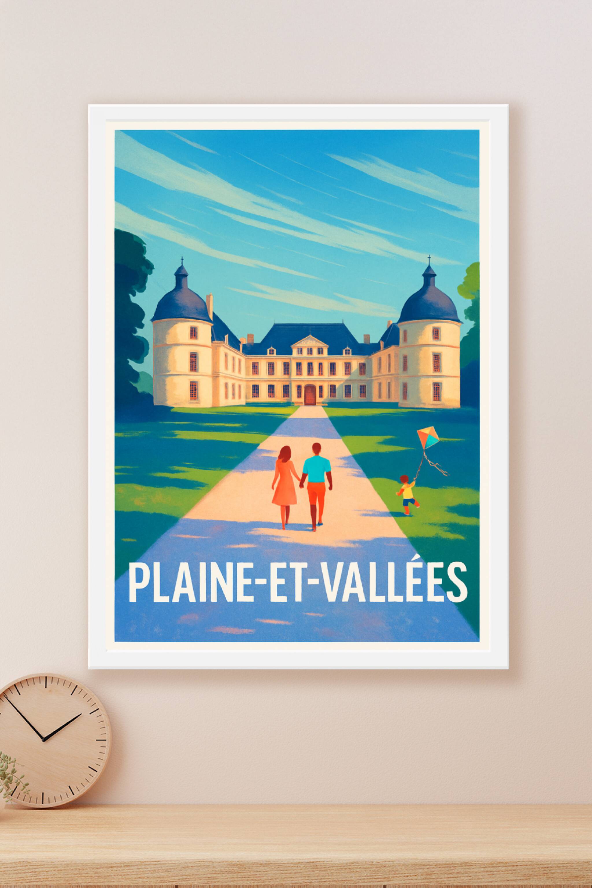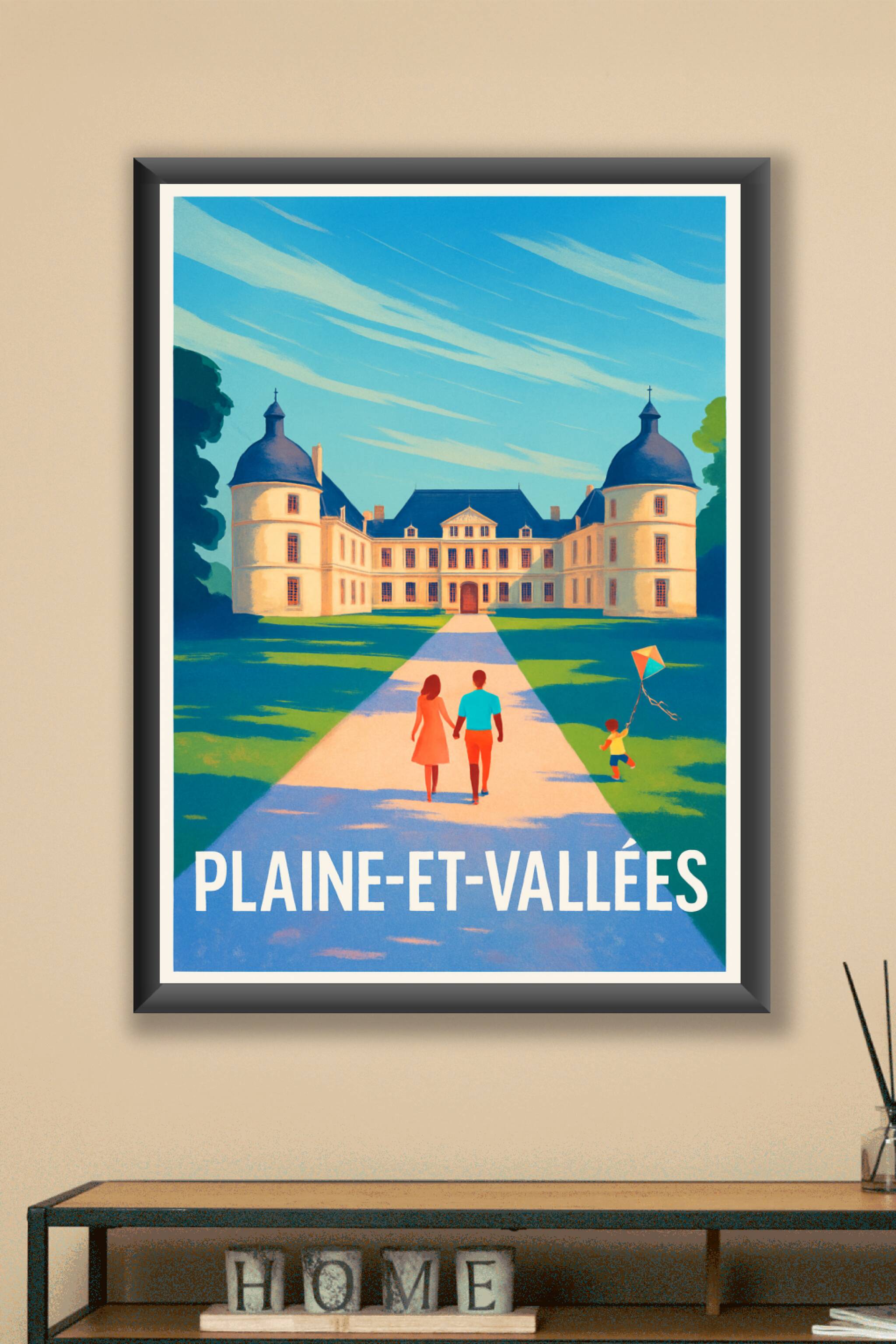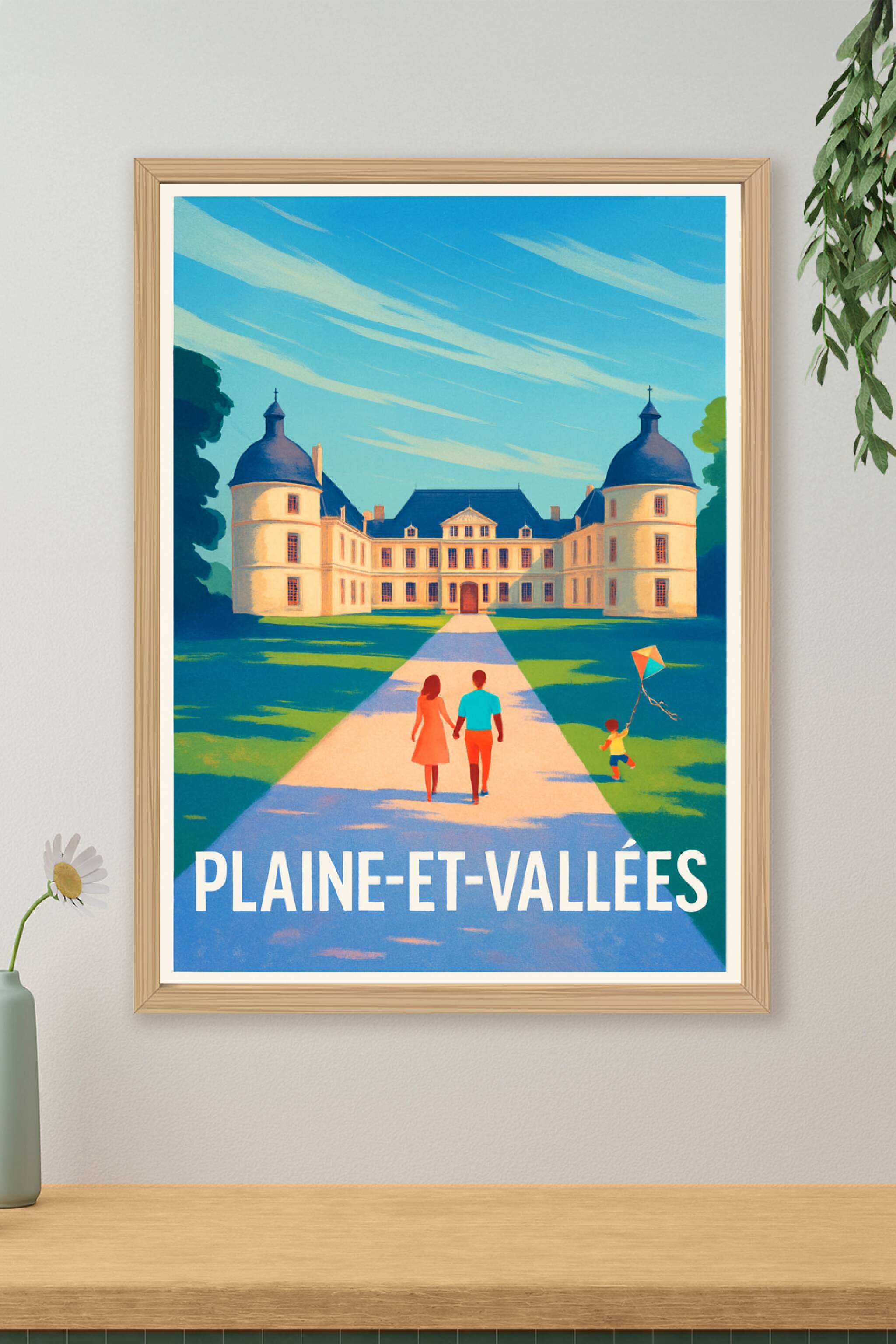 Découvrez la douceur et le charme de Plaine-et-Vallées avec cette affiche illustrée représentant une famille marchant vers le majestueux château so...