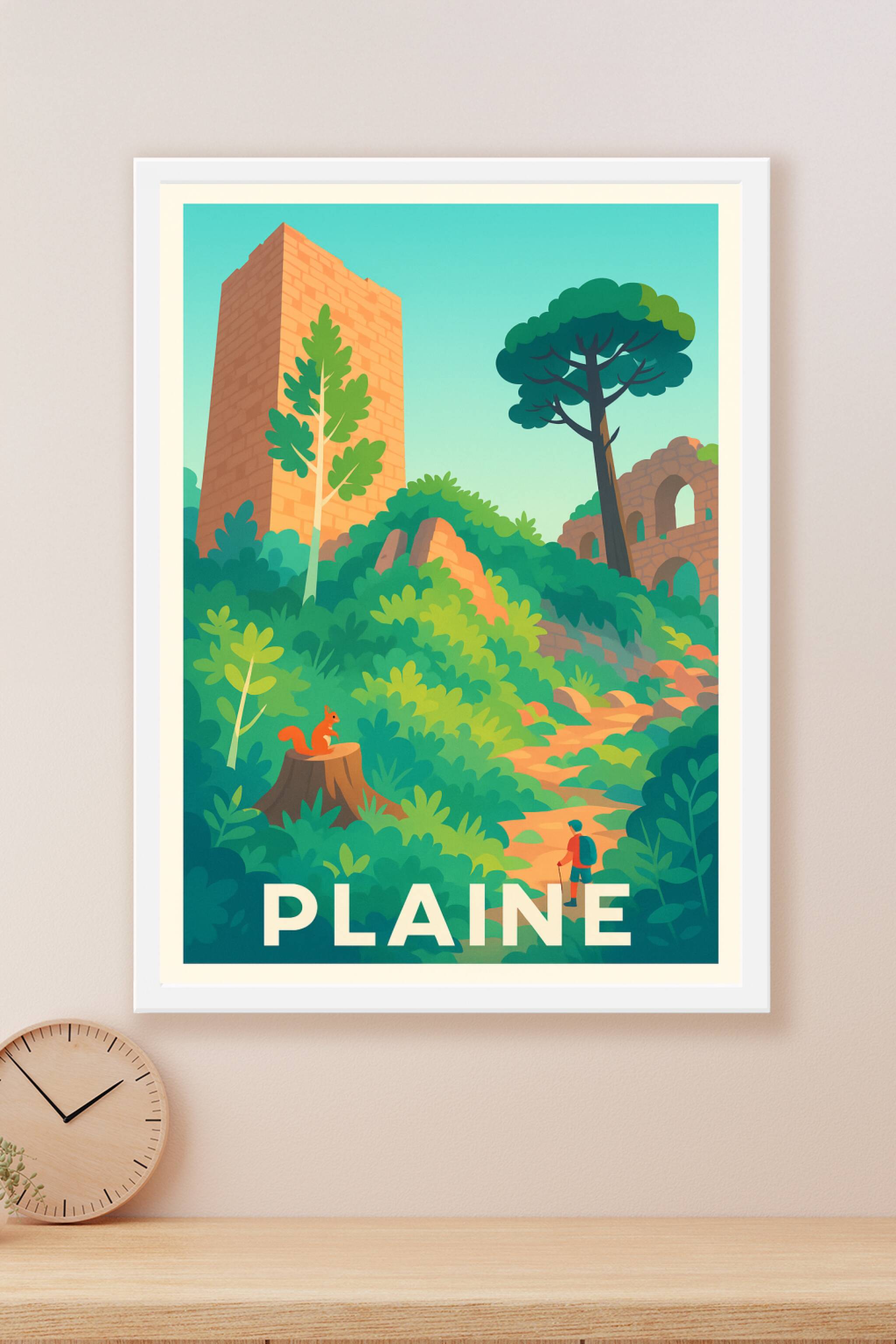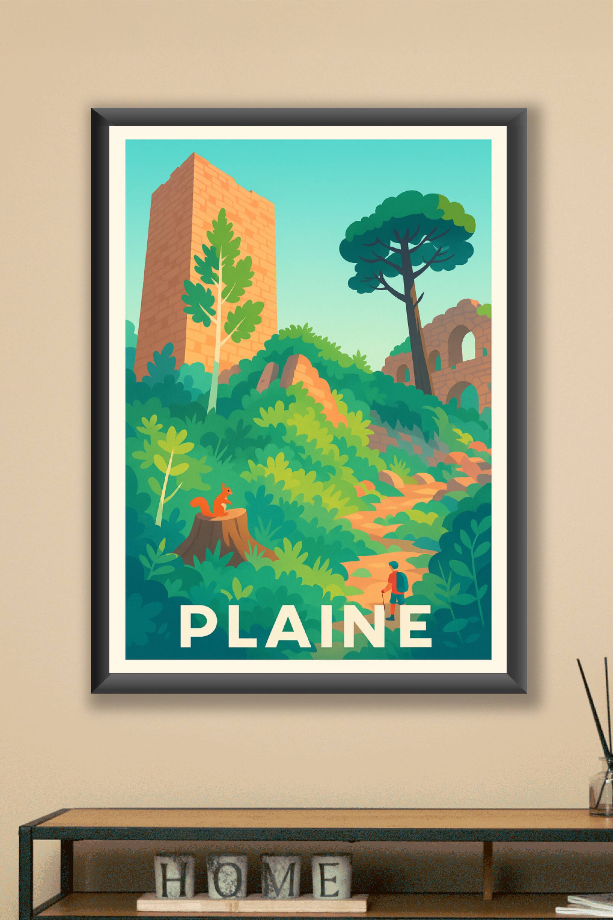 Découvrez l'atmosphère apaisante et verdoyante de Plaine avec cette affiche illustrée mettant en scène un sentier sauvage bordé de ruines anciennes...