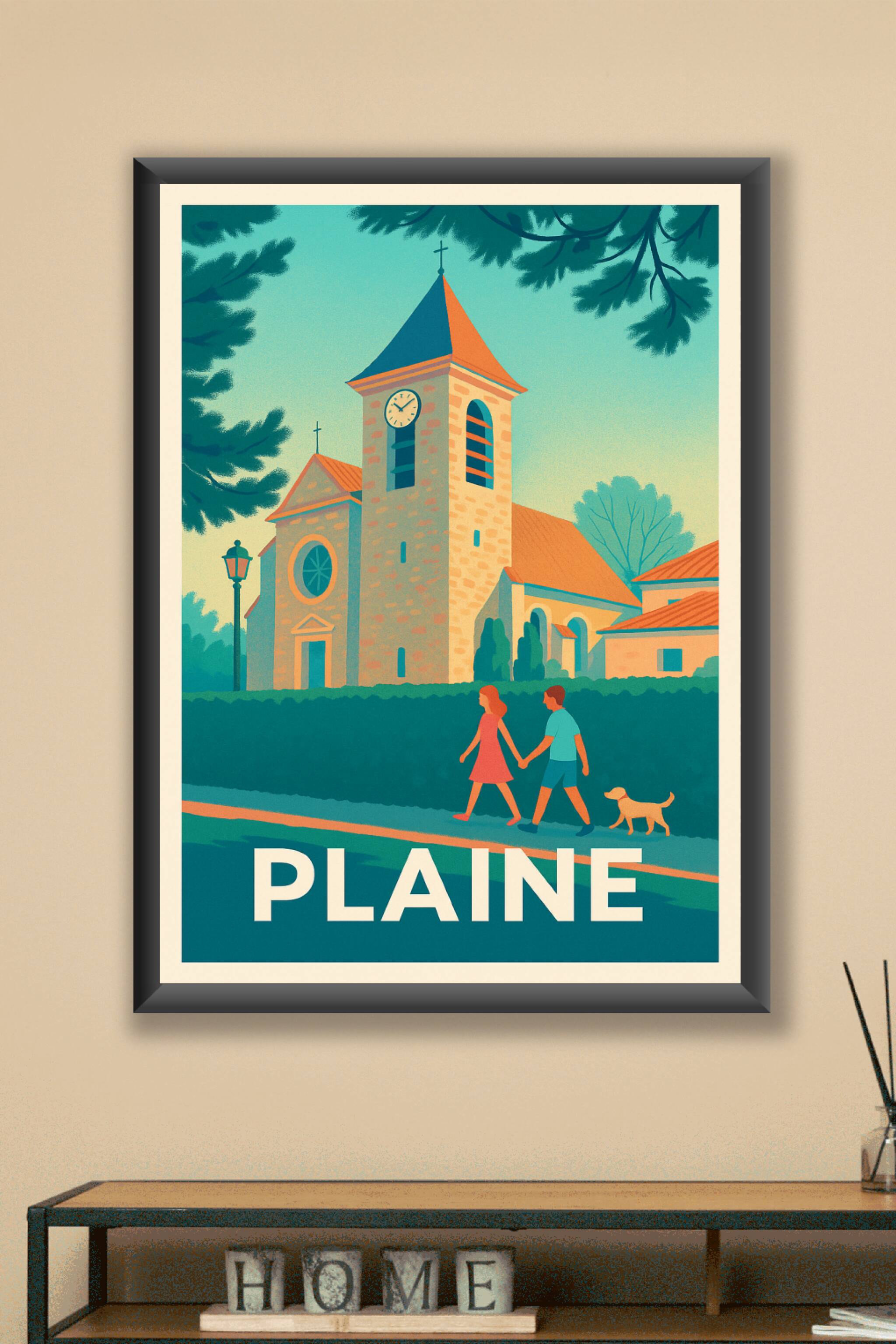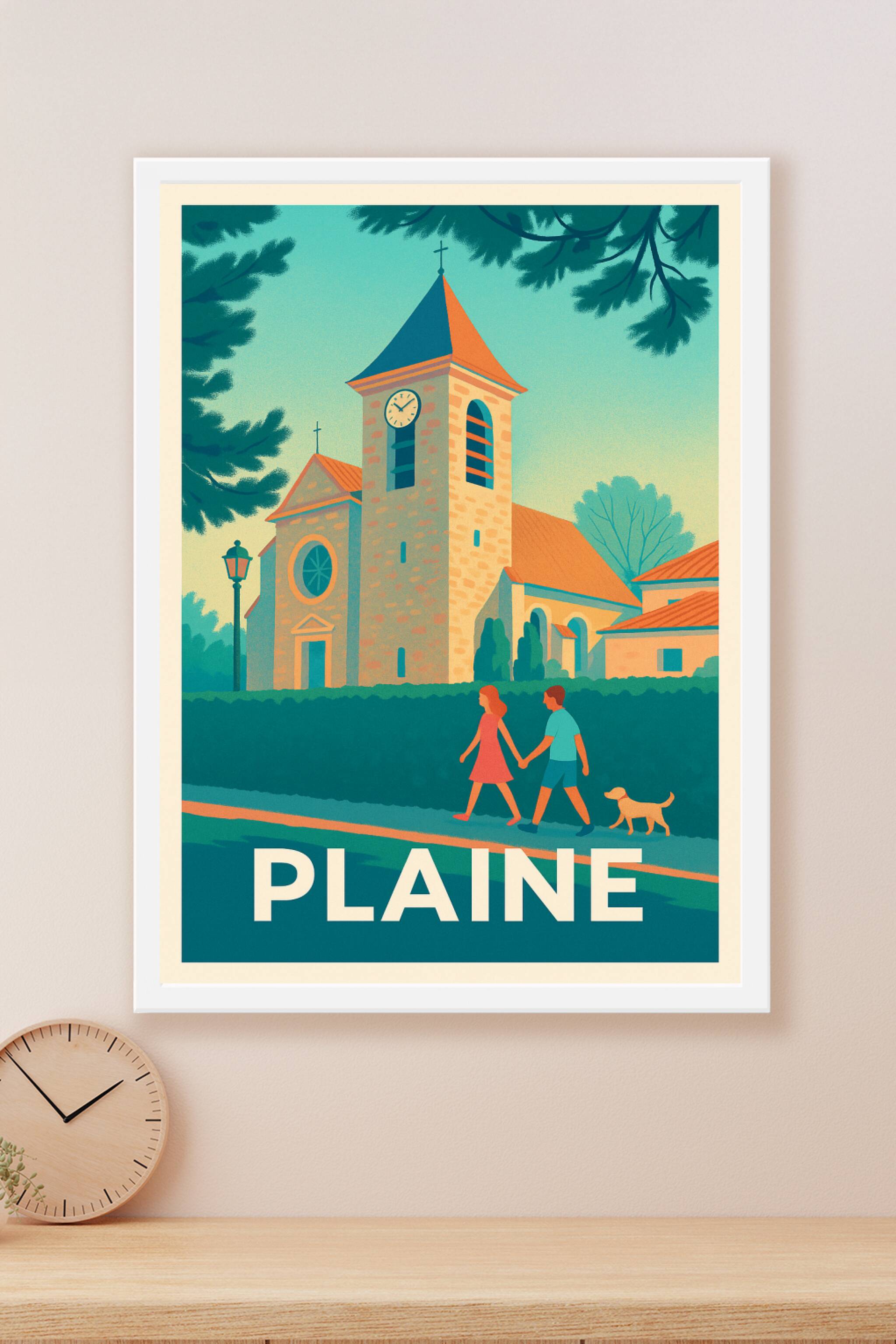 Découvrez le charme tranquille de Plaine avec cette affiche illustrant une scène villageoise typique, où une église au clocher pastel se détache so...