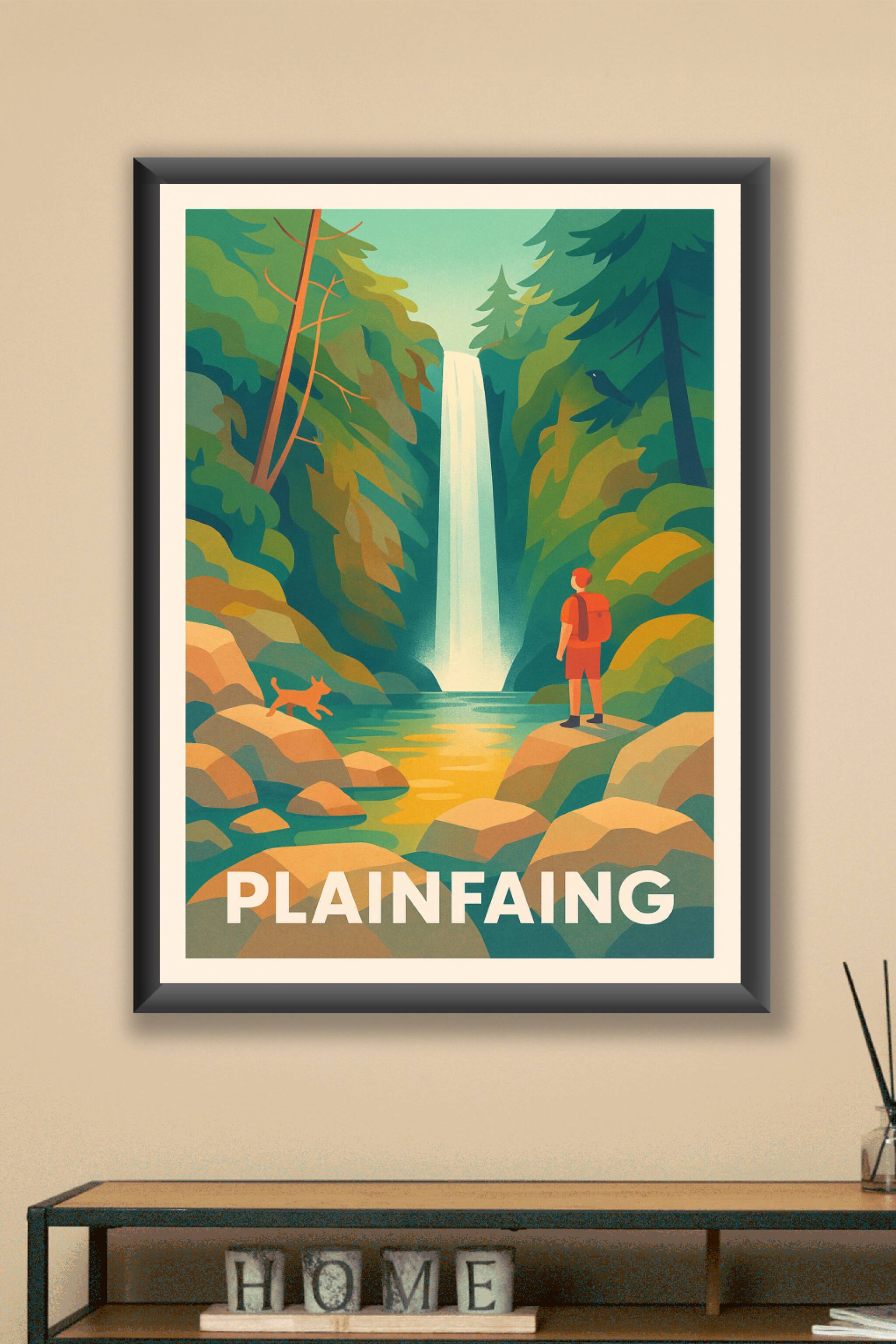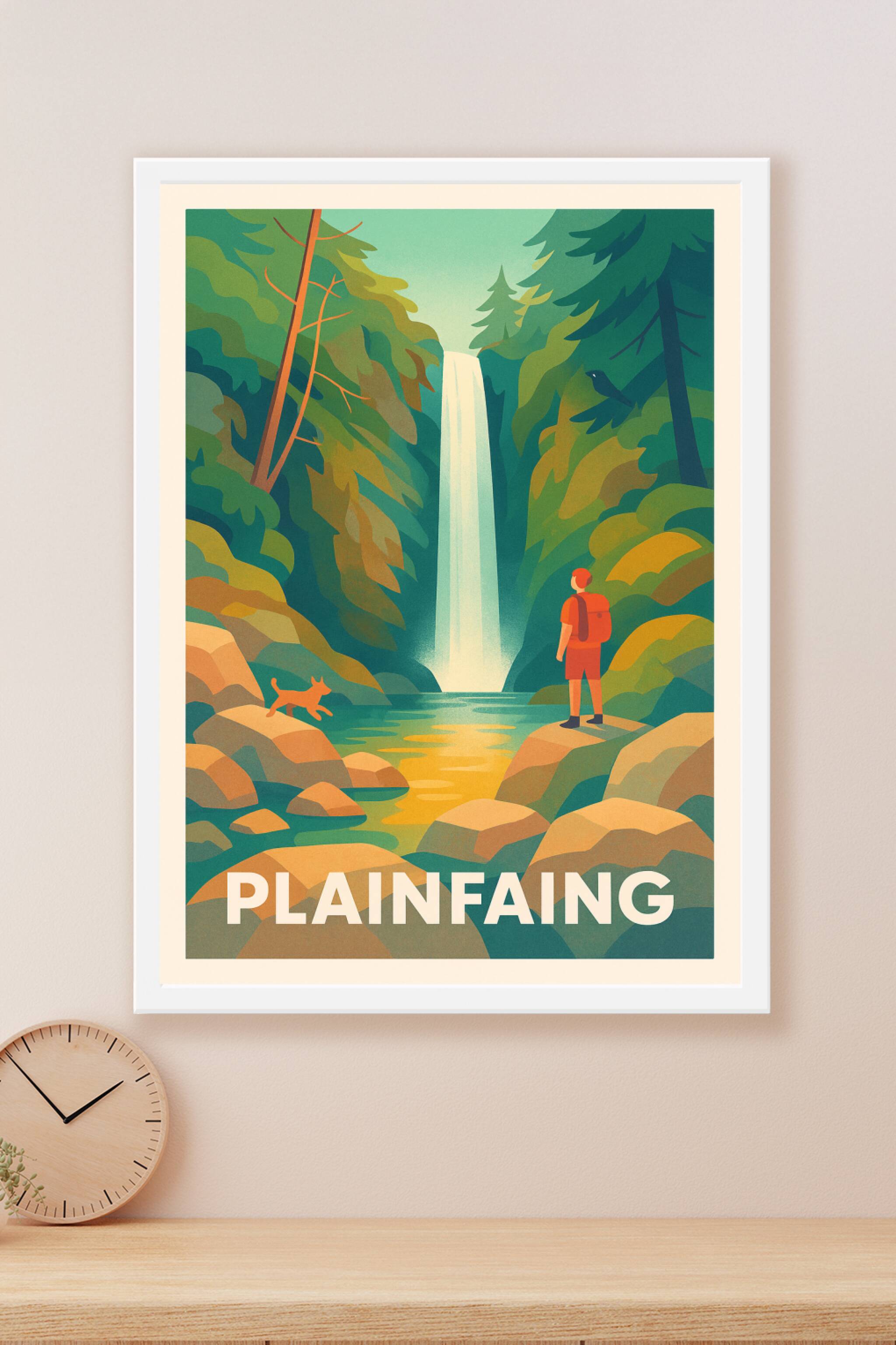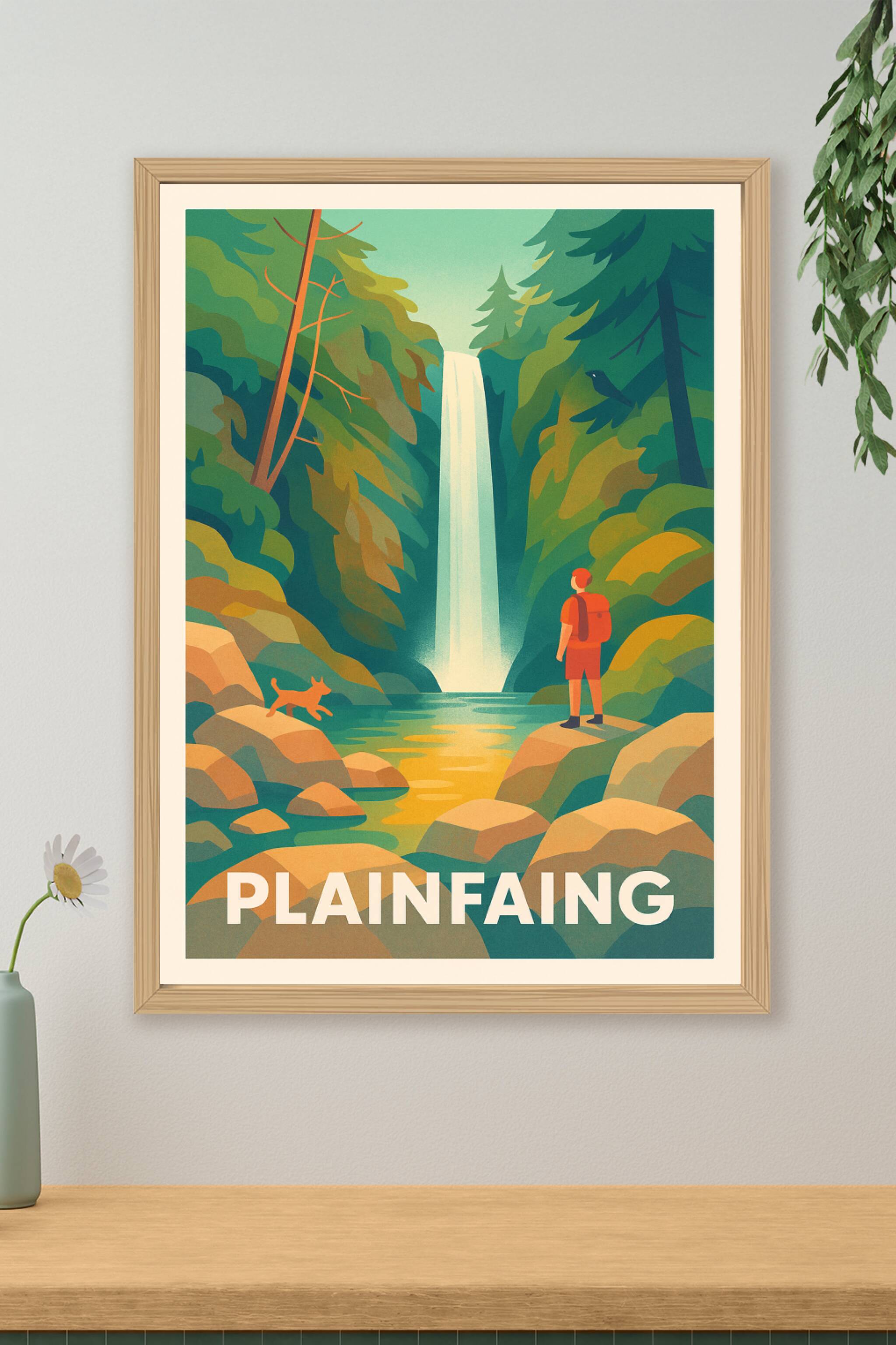 Découvrez la beauté sauvage de Plainfaing avec cette affiche illustrée mettant en scène une cascade majestueuse nichée au milieu d'une forêt luxuri...