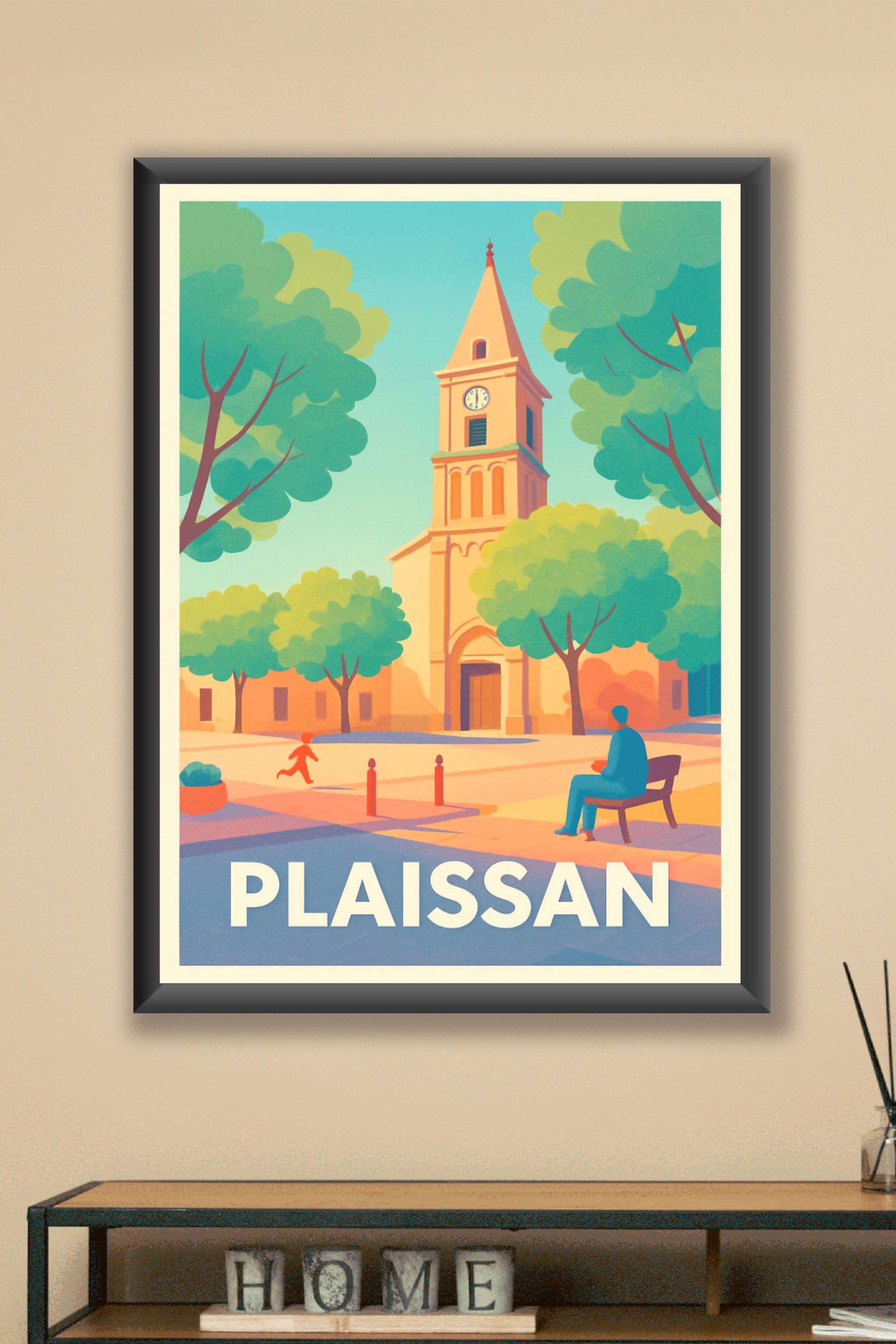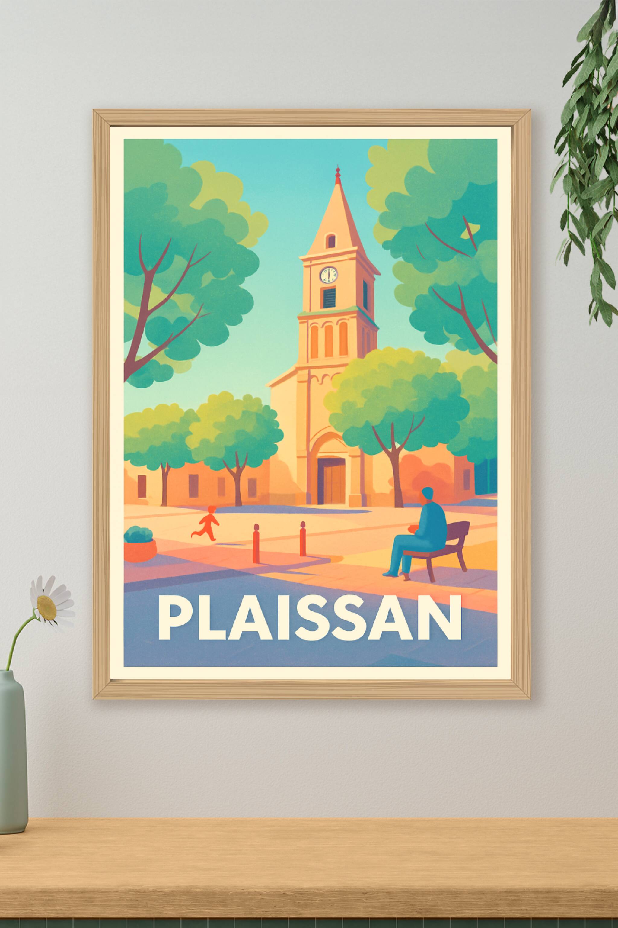 Découvrez l'élégance tranquille de Plaissan avec cette affiche illustrée mettant en scène son église emblématique et la paisible place du village b...