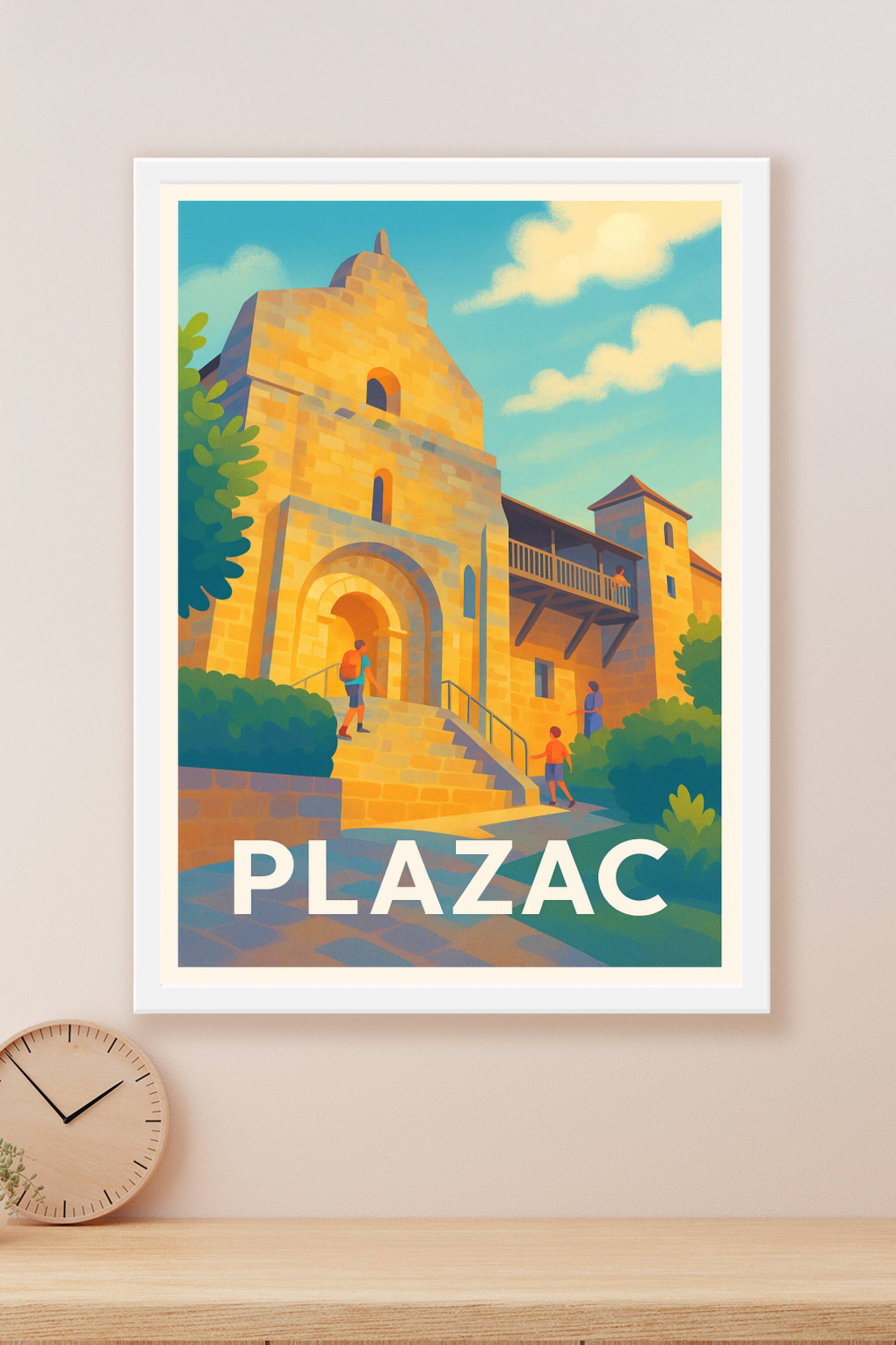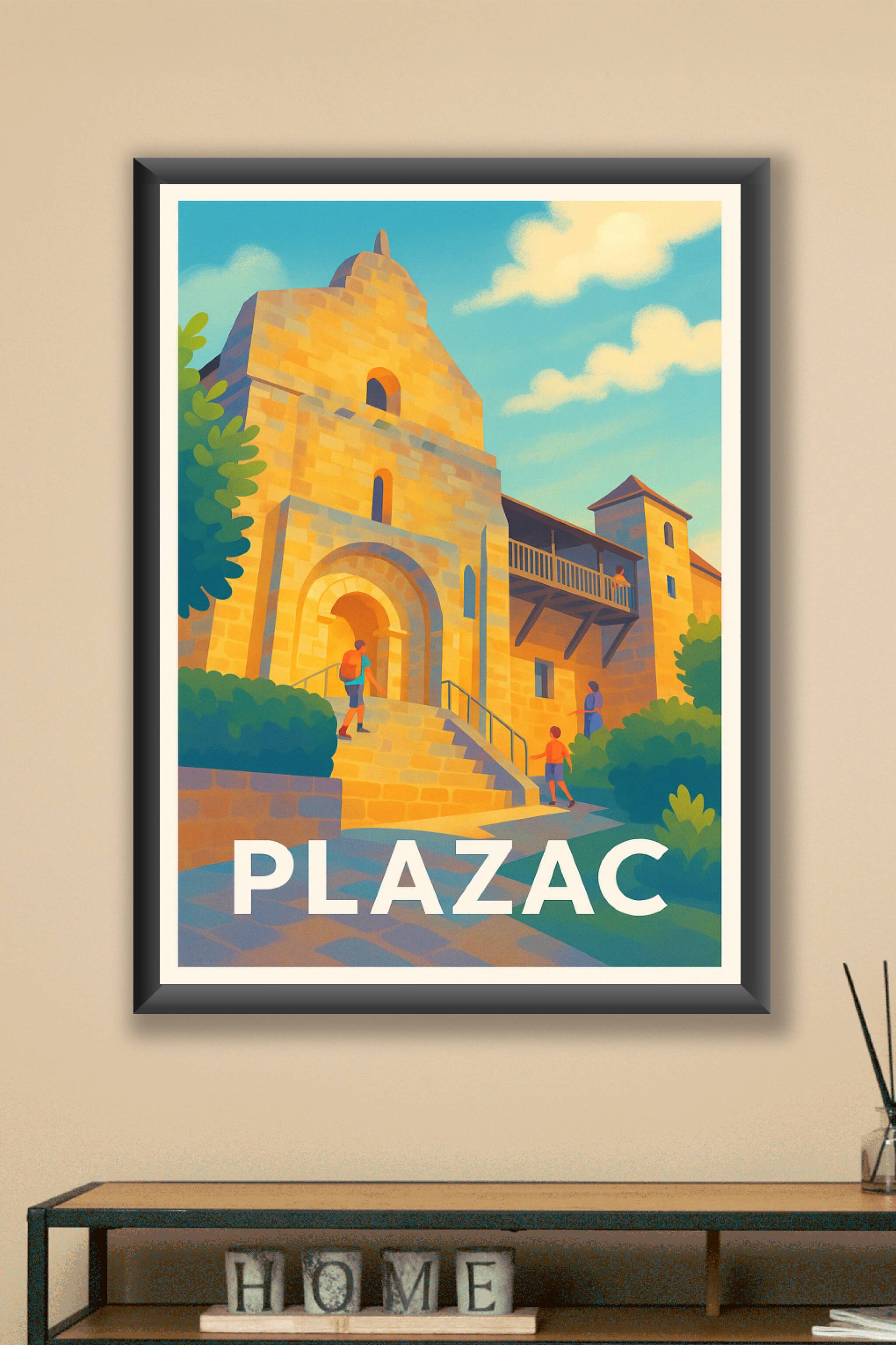 Découvrez l'authenticité chaleureuse de Plazac avec cette affiche illustrée mettant en valeur l'architecture en pierre dorée baignée par une lumièr...