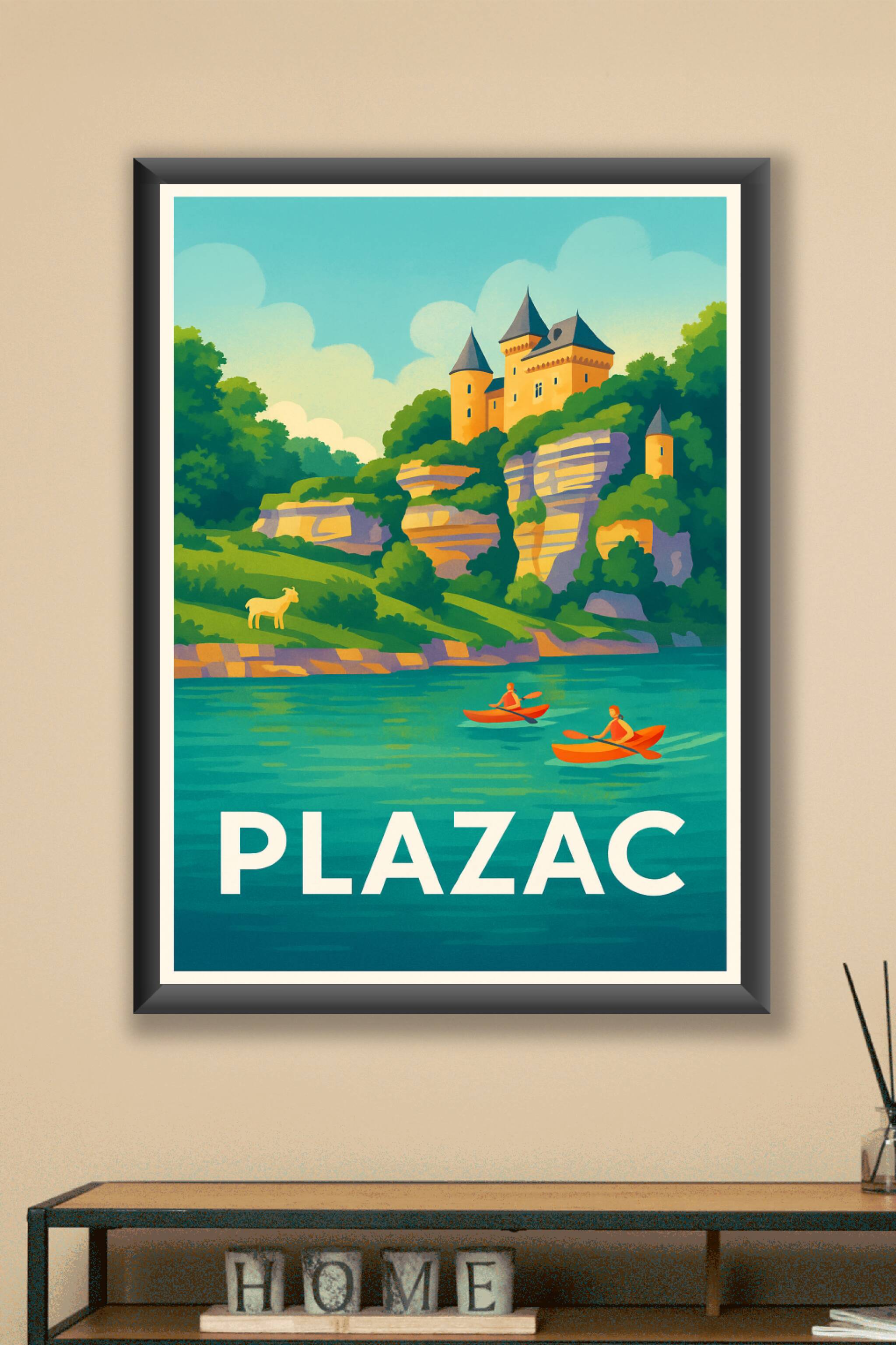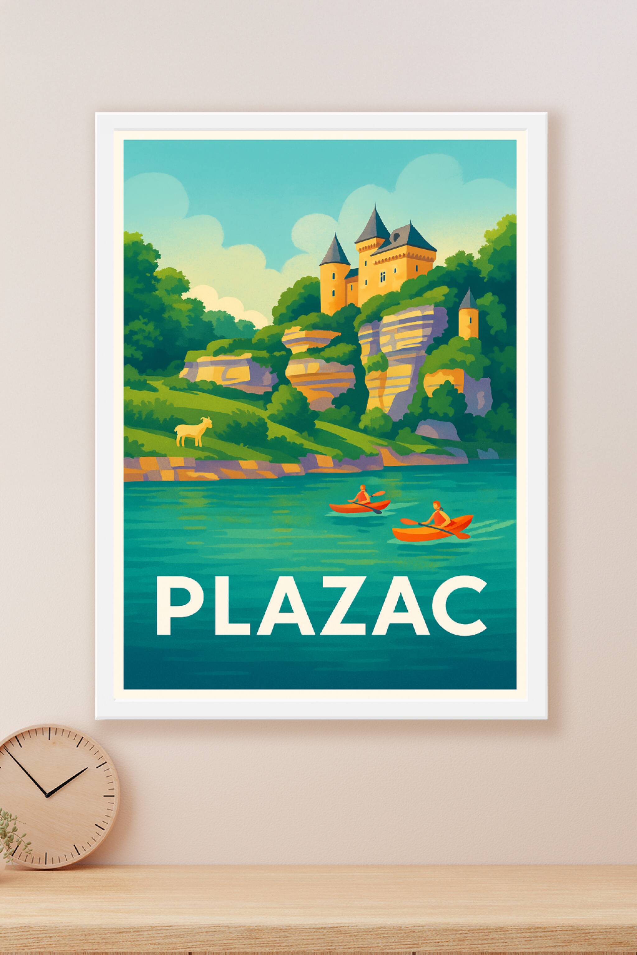 Découvrez l'ambiance paisible et naturelle de Plazac avec cette affiche illustrée mettant en scène un château perché sur des falaises verdoyantes, surplombant une rivière où deux kayakistes glissent paisiblement. Ce poster, aux couleurs vives et style rétro, invite à l'évasion et à l'aventure en pleine nature.Cet affichage est proposé en tirage 'Fine Art' sur papier 305g coton pour garantir une qualité d'impression supérieure et une tenue longue durée. Disponible en formats A1 à A4, avec ou sans cadre, cette affiche apportera une touche authentique et élégante à votre décoration intérieure. 100% fabriquée en France, elle constitue également un cadeau idéal pour les amoureux des paysages naturels et des escapades touristiques.
