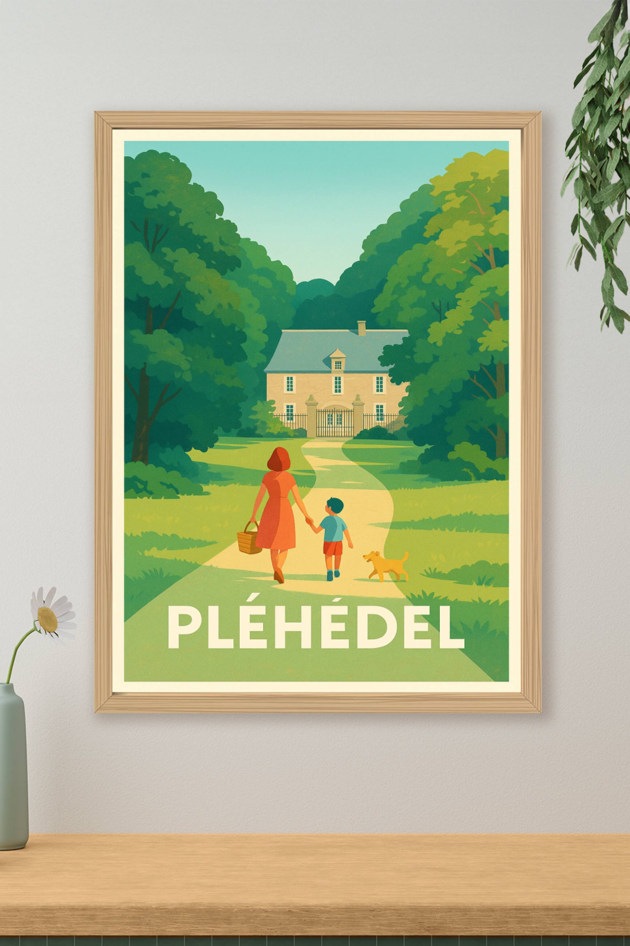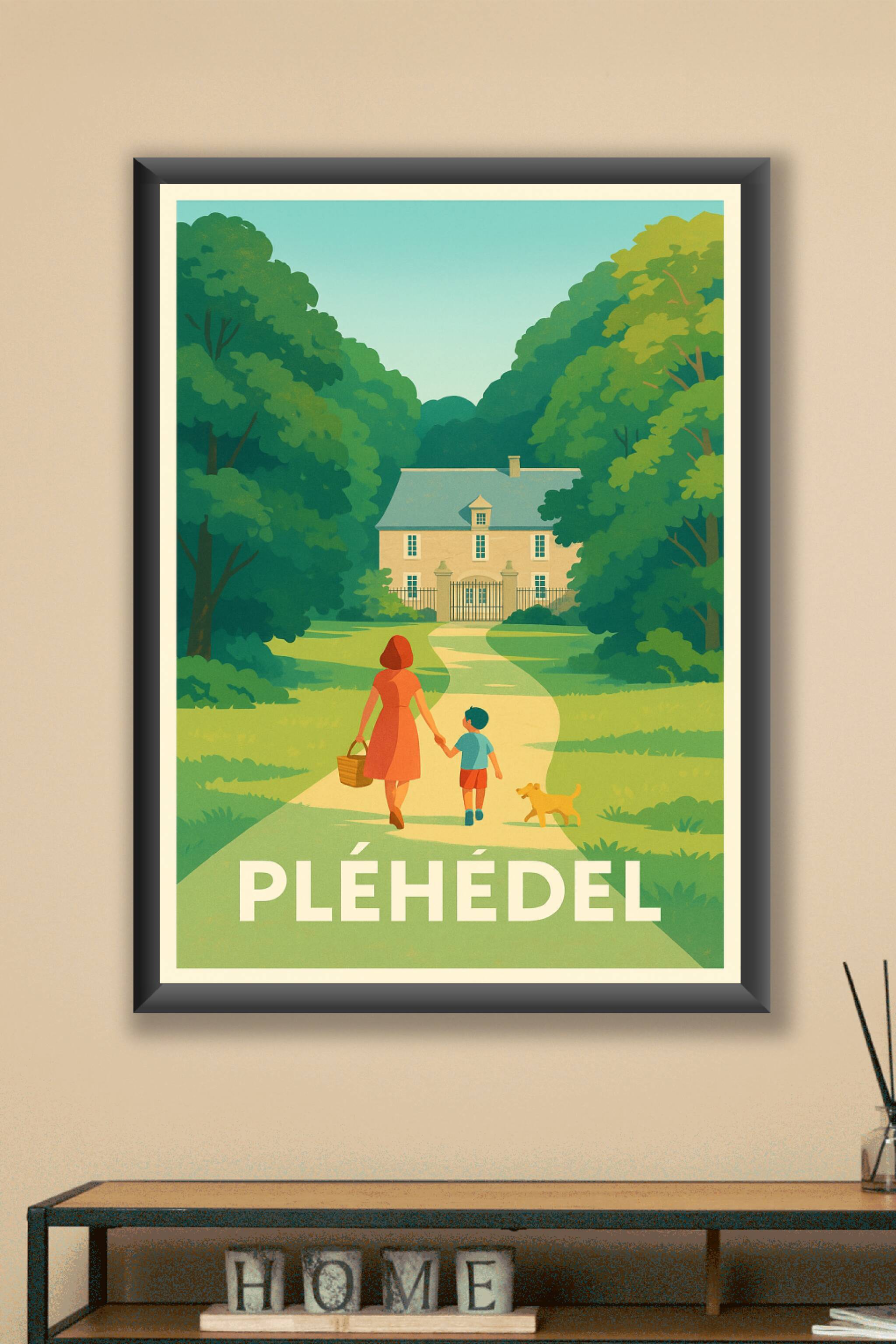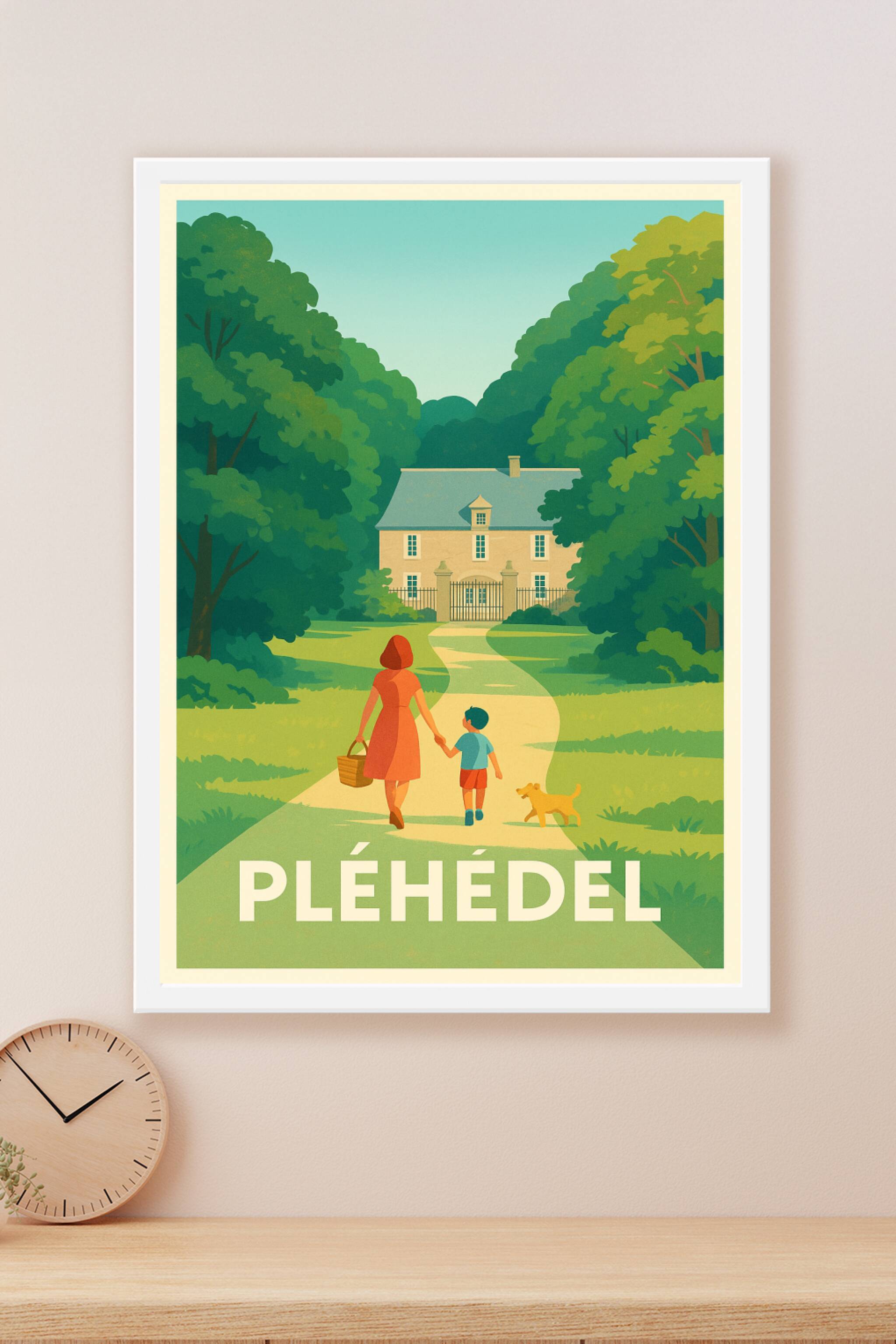 Découvrez la douceur de vivre à Pléhédel avec cette affiche illustrée dans un style rétro qui met en scène une promenade paisible entre une mère et...