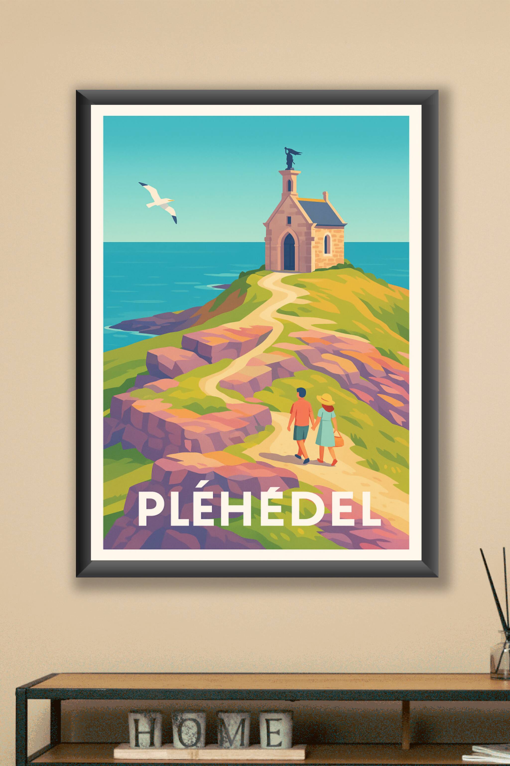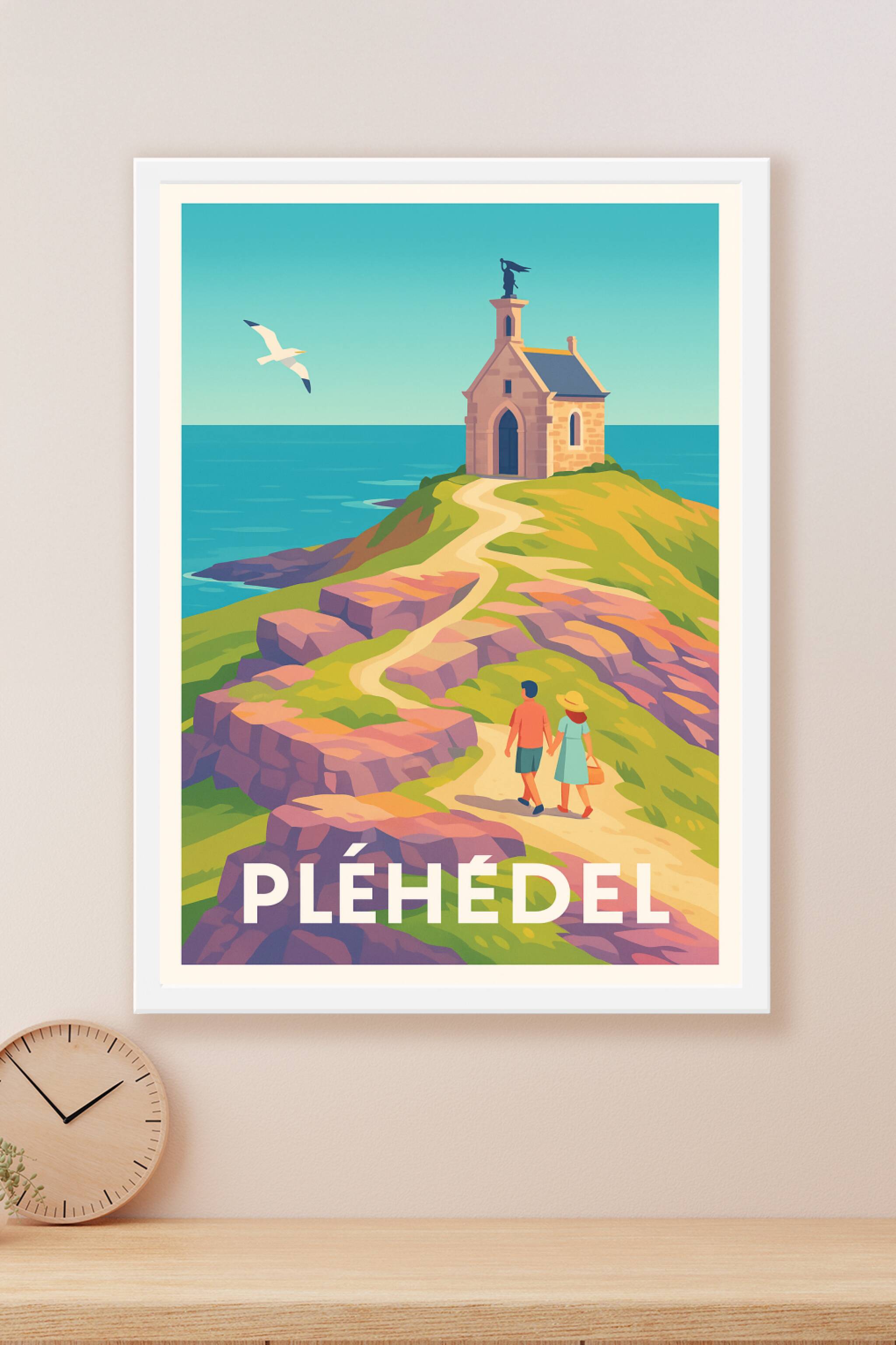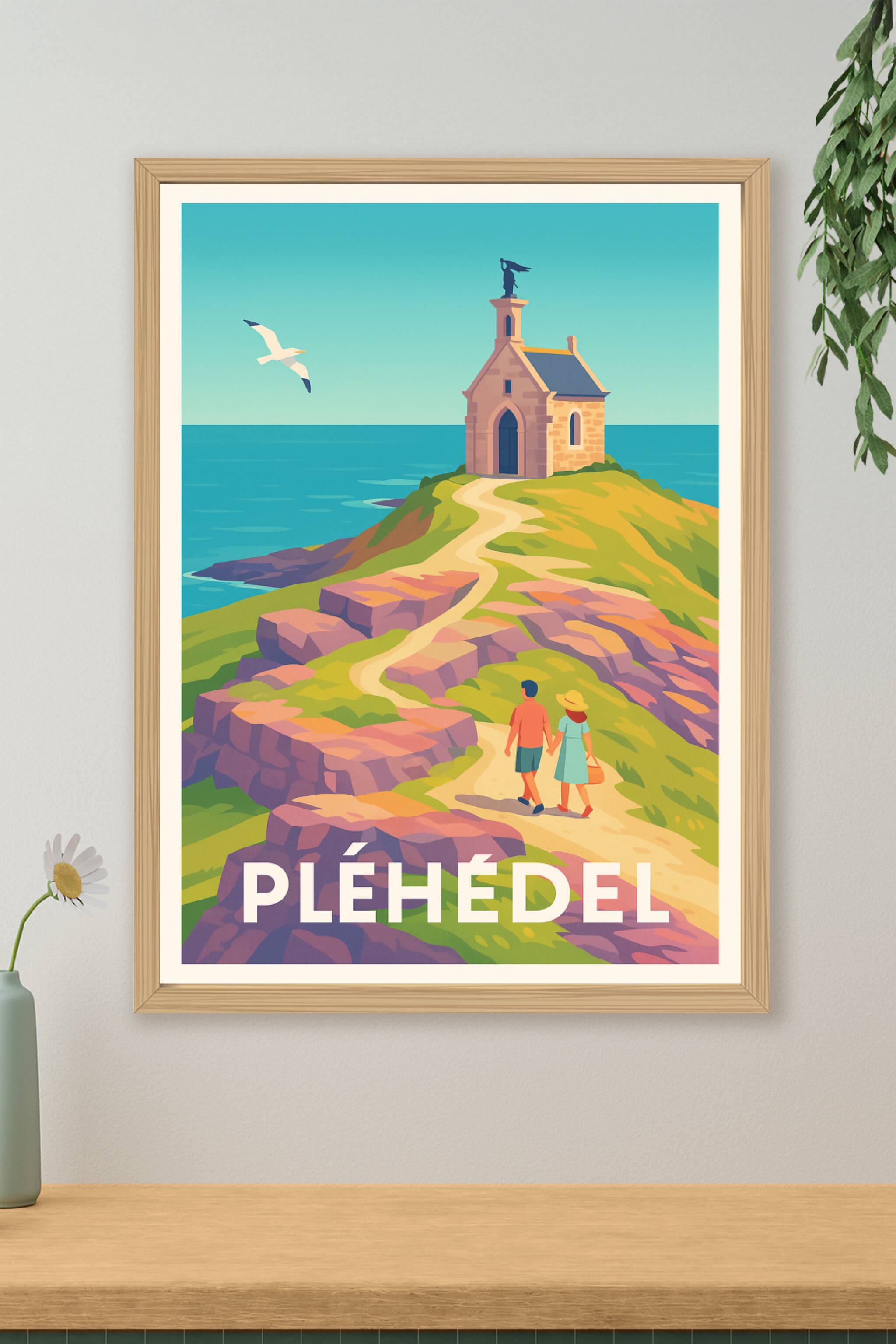 Découvrez la beauté sauvage de Pléhédel avec cette affiche illustrée, qui capture un chemin sinueux menant à une petite chapelle surplombant l'océa...